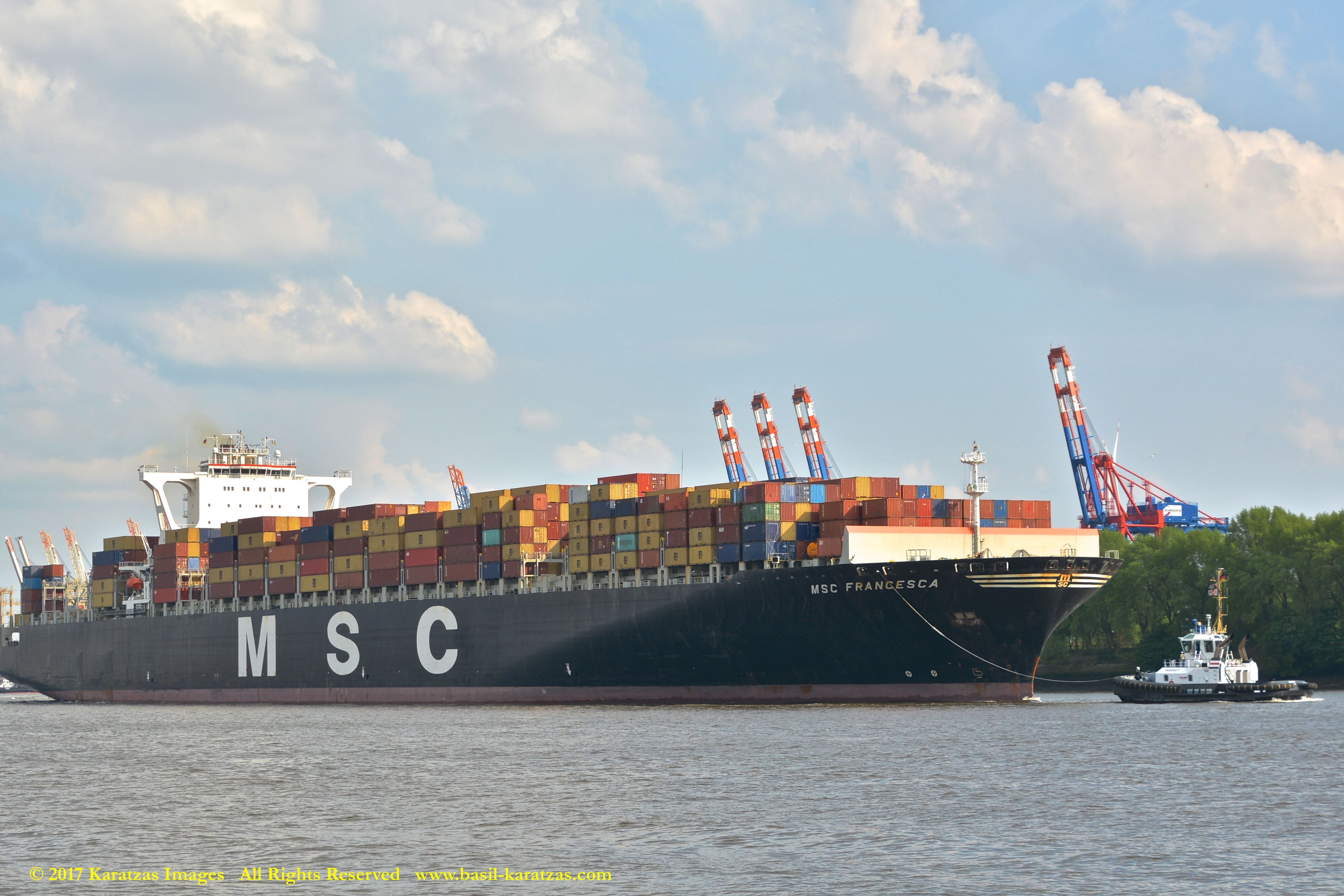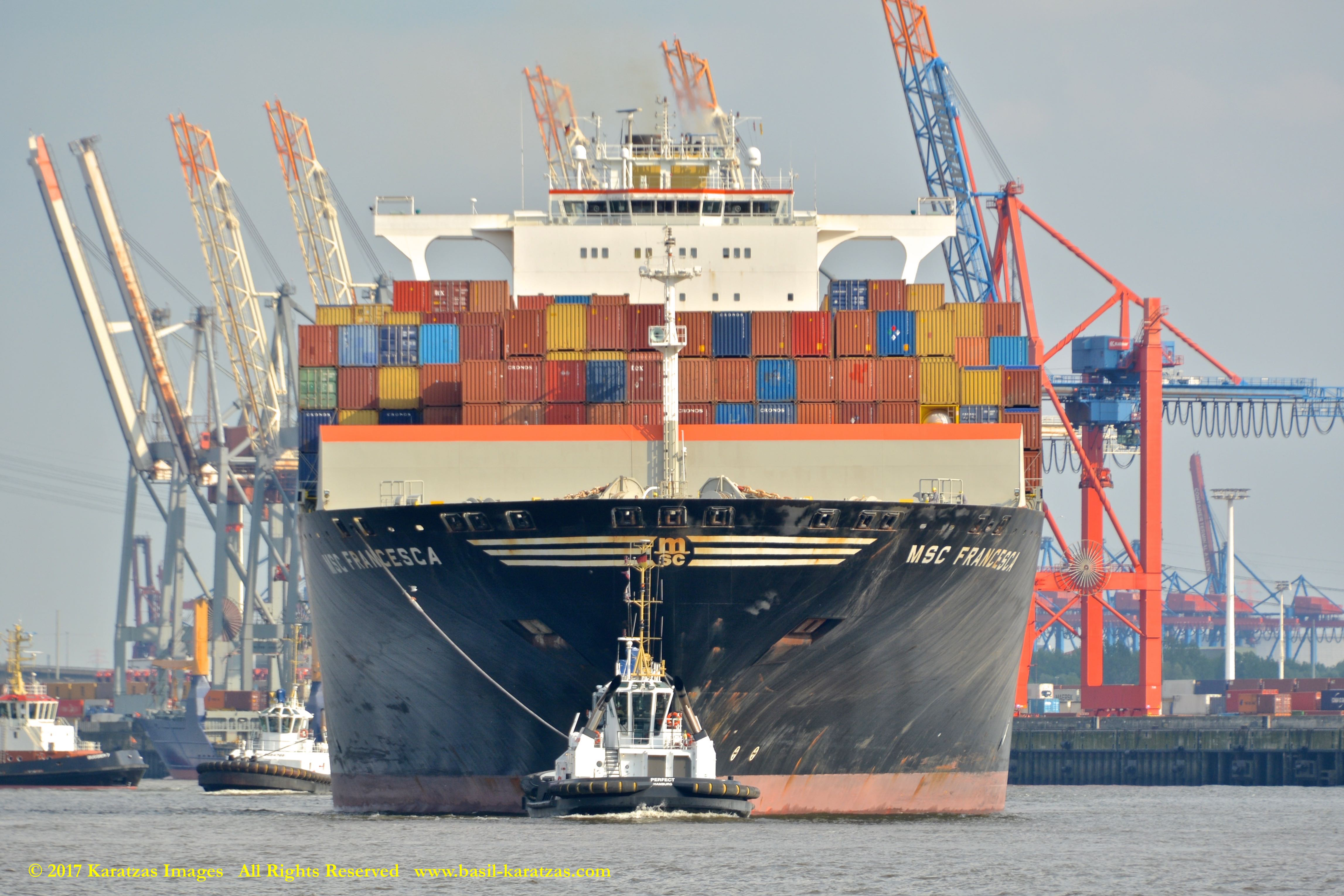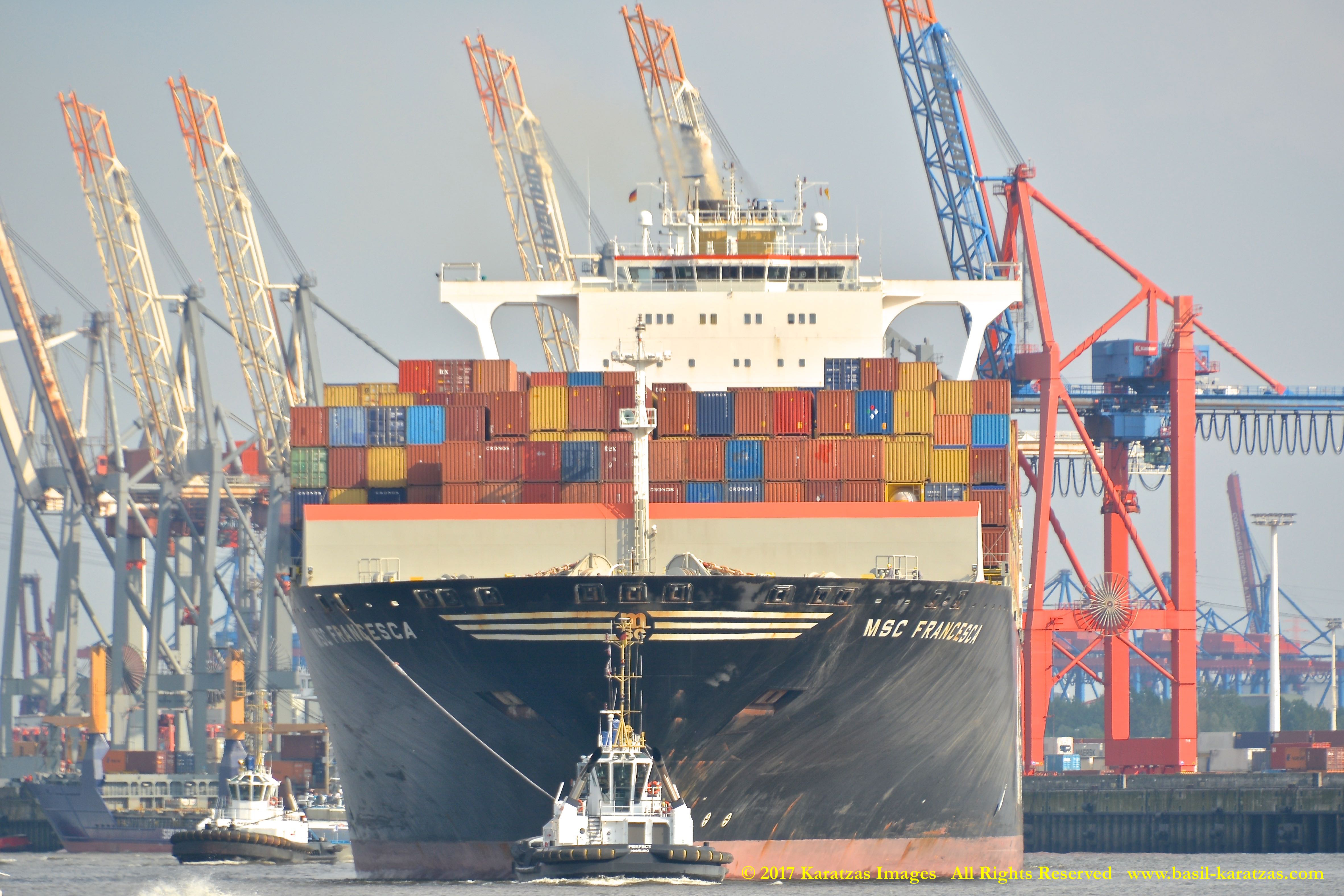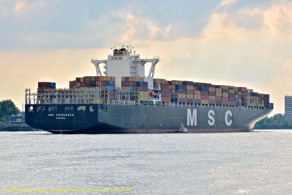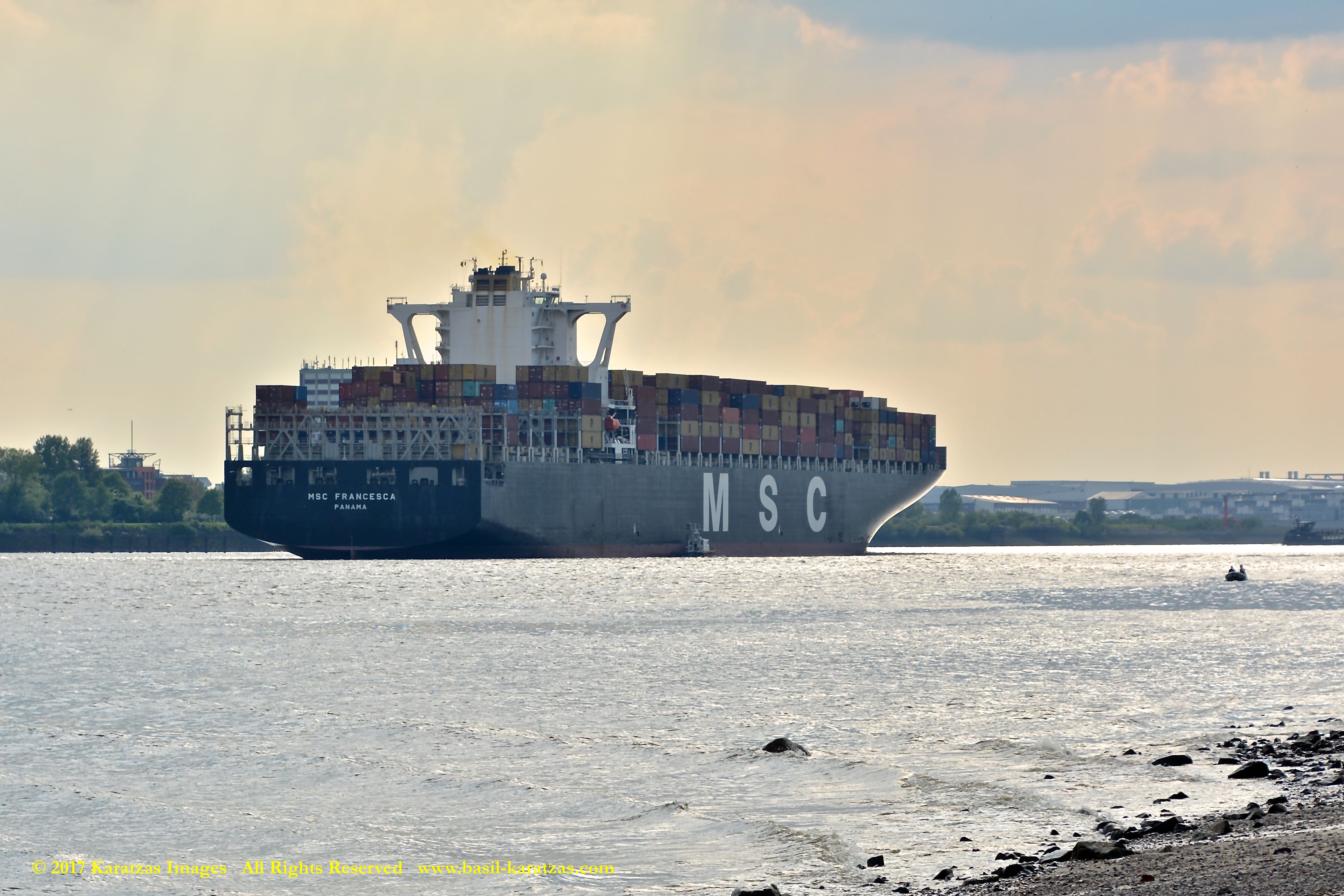 Close up picture of neo-panamax containership MV ‘MSC Francesca’ (almost 12,000-teu, built in 2009 at Hyundai Samho) departing the Port of Hamburg on a majestic, sunny early summer evening. Here guided by the tugs in the main waterway of the Elbe River. Image credit: Karatzas Images.
