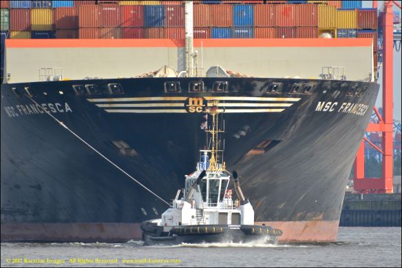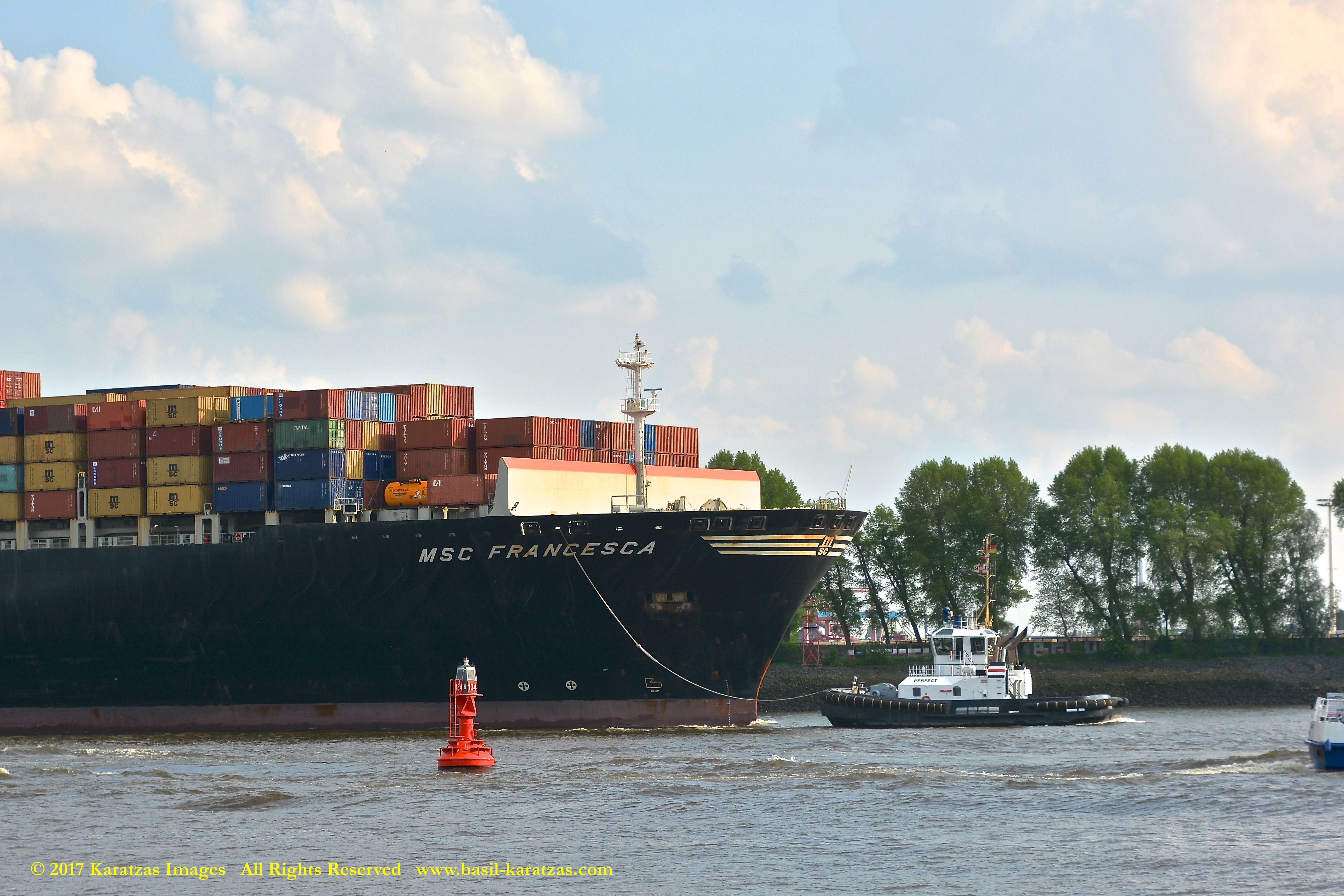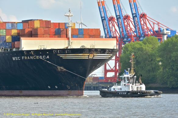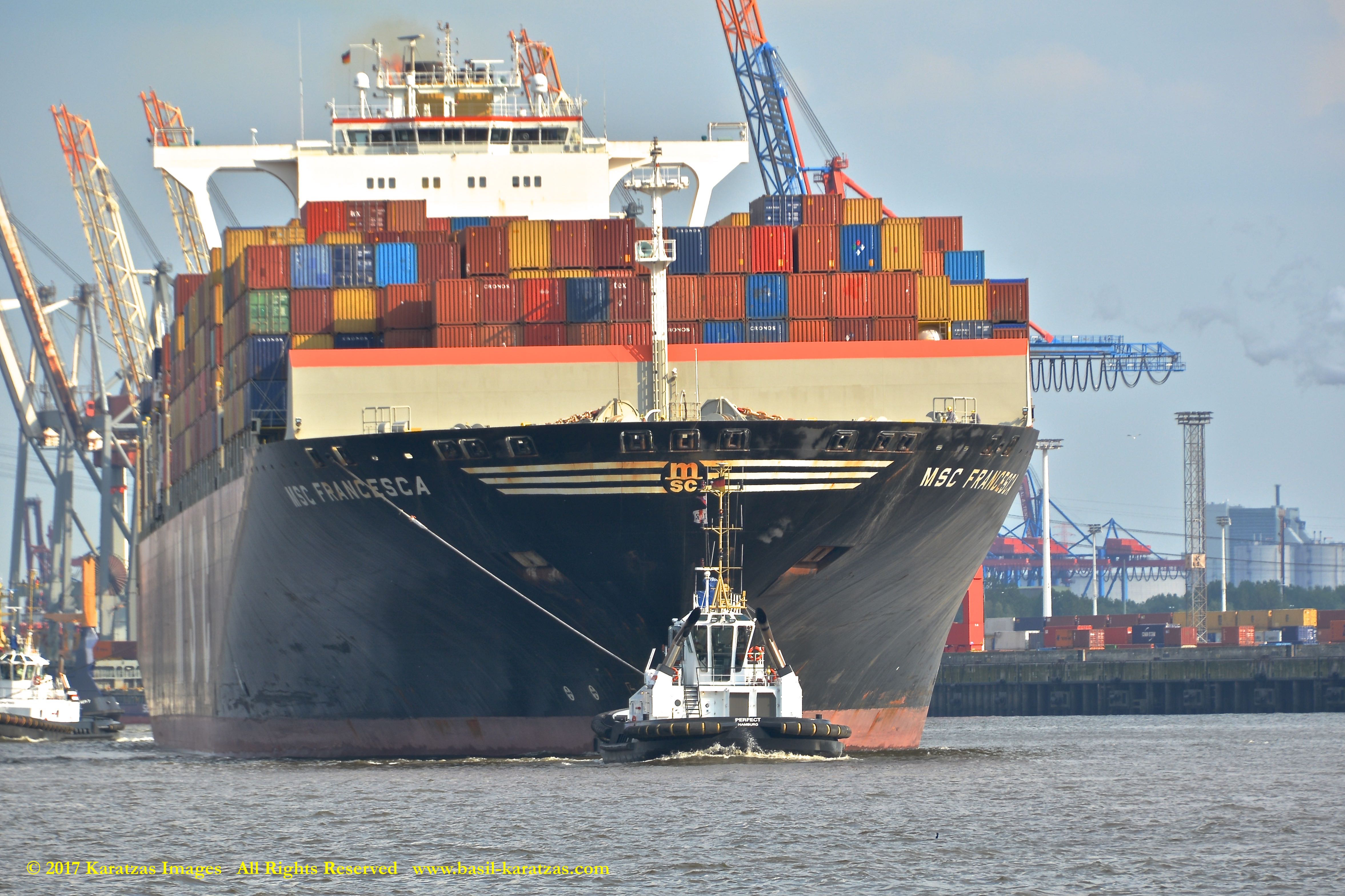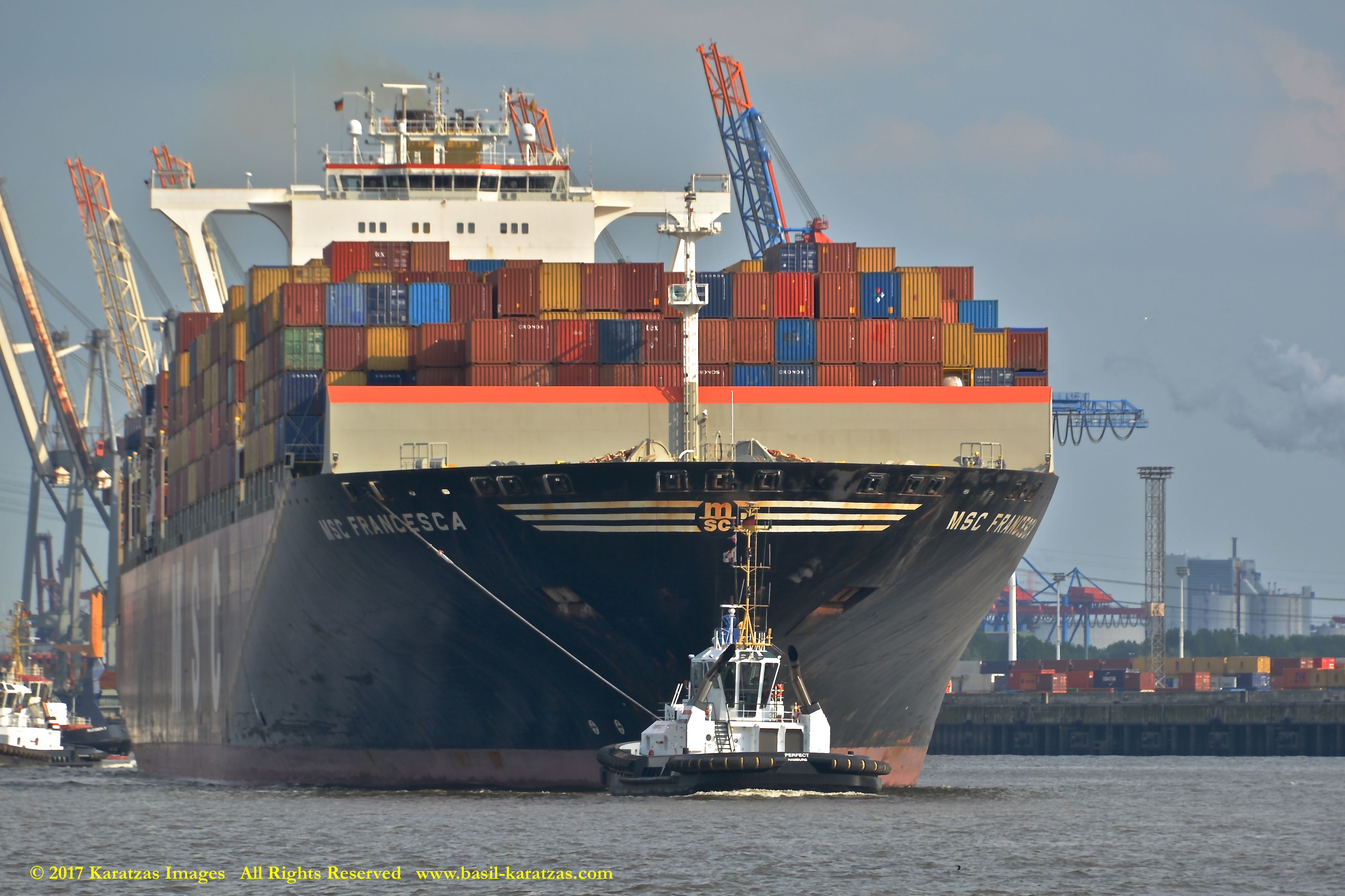 Close up picture of neo-panamax containership MV ‘MSC Francesca’ (almost 12,000-teu, built in 2009 at Hyundai Samho) departing the Port of Hamburg on a majestic, sunny early summer evening. Here guided by the tugs in the main waterway of the Elbe River. Image credit: Karatzas Images.