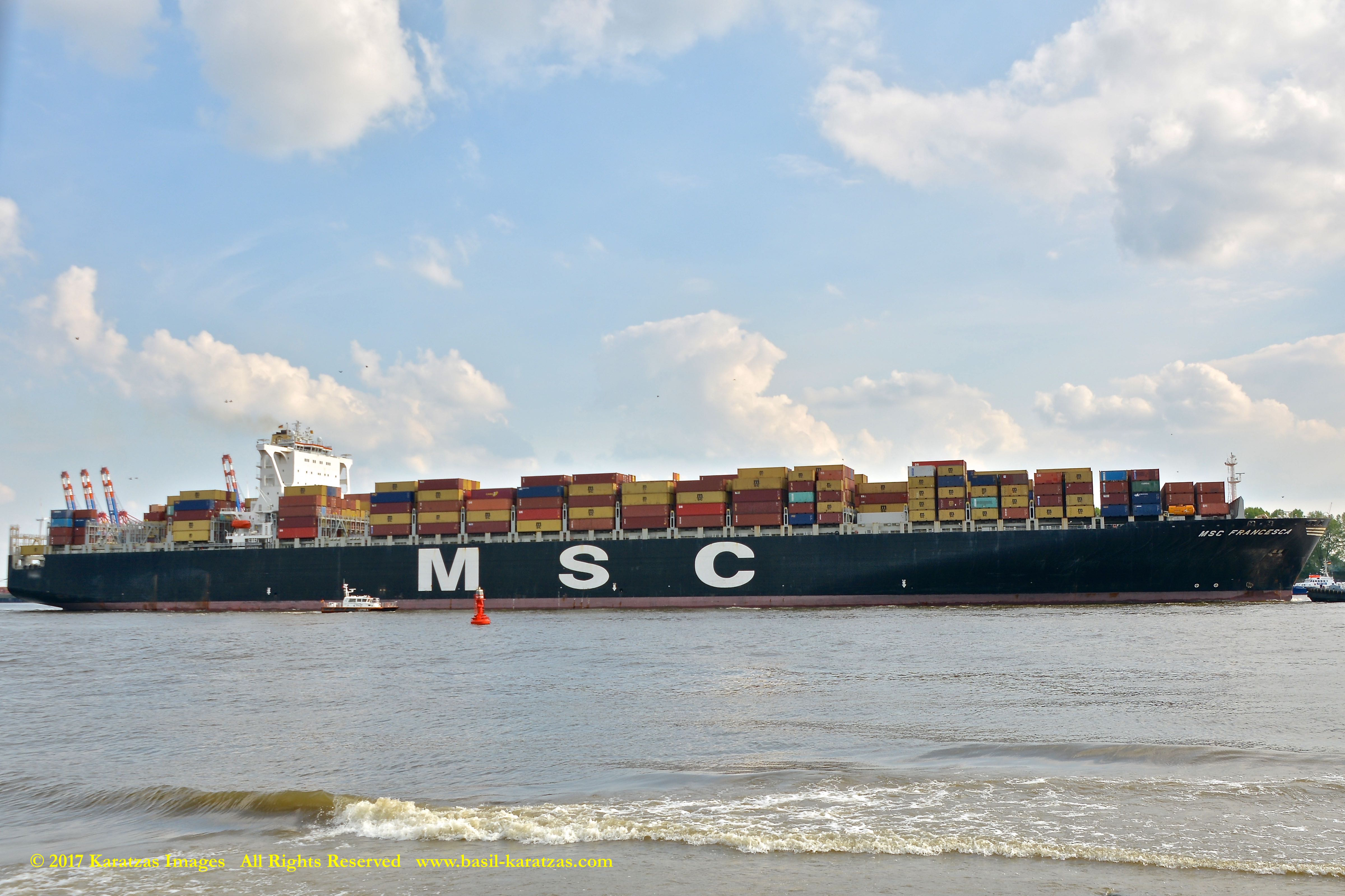 Close up picture of neo-panamax containership MV ‘MSC Francesca’ (almost 12,000-teu, built in 2009 at Hyundai Samho) departing the Port of Hamburg on a majestic, sunny early summer evening. Tough to fit in one picture 363.5 m (1,193 ft) of length overall (LOA). Image credit: Karatzas Images.