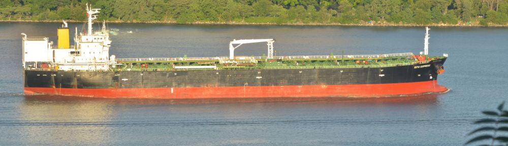 Products Tanker MT ‘Bitu Express’ sailing downstream on Hudson River. Non IMO-rated, 46,000 dwt products tanker built at a fine Japanese shipyard (Shin Kurushima) in 2003. Bow detail. Image credit: Karatzas Images.