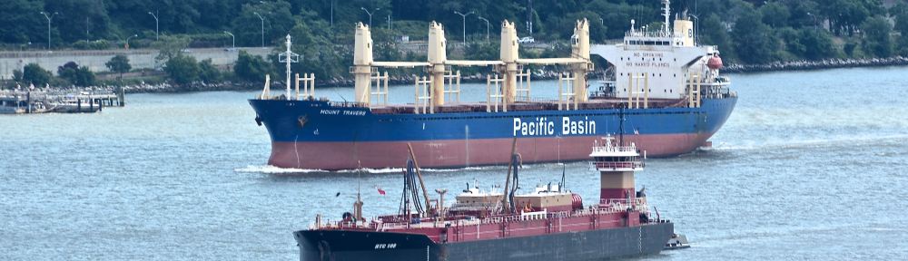 Built in 2002 at Imabari (Japan), MV ‘Mount Travers’ 28,000 dwt handysize dry bulk vessel (owned by Pacific Basin in Hong Kong) sailing upstream the Hudson River in New York City and overtaking anchored tank-barge on America’s Independence Day – July 4th, 2017. Image credit: Karatzas Images.