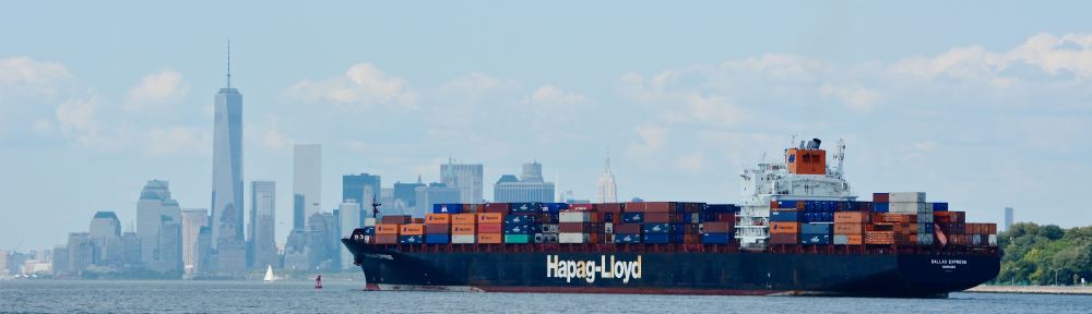 Panamax containership MV ‘Dallas Express’ photographed against the Lower Manhattan skyline and the landmark skyscraper One World Trade Center. Image credit: Karatzas Images