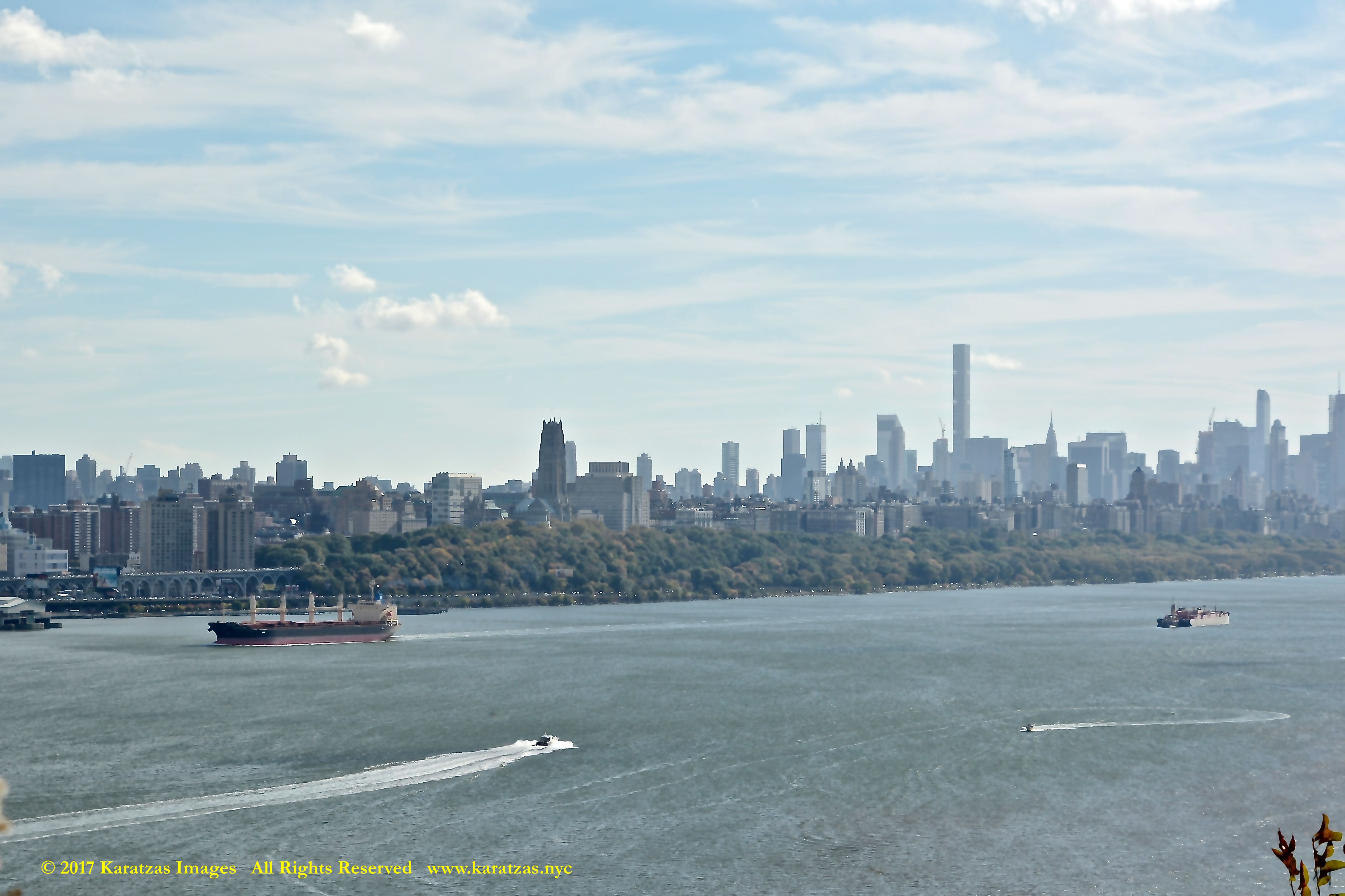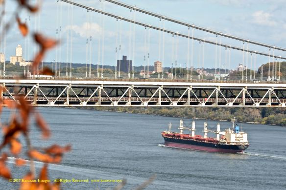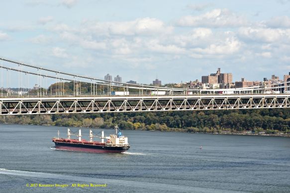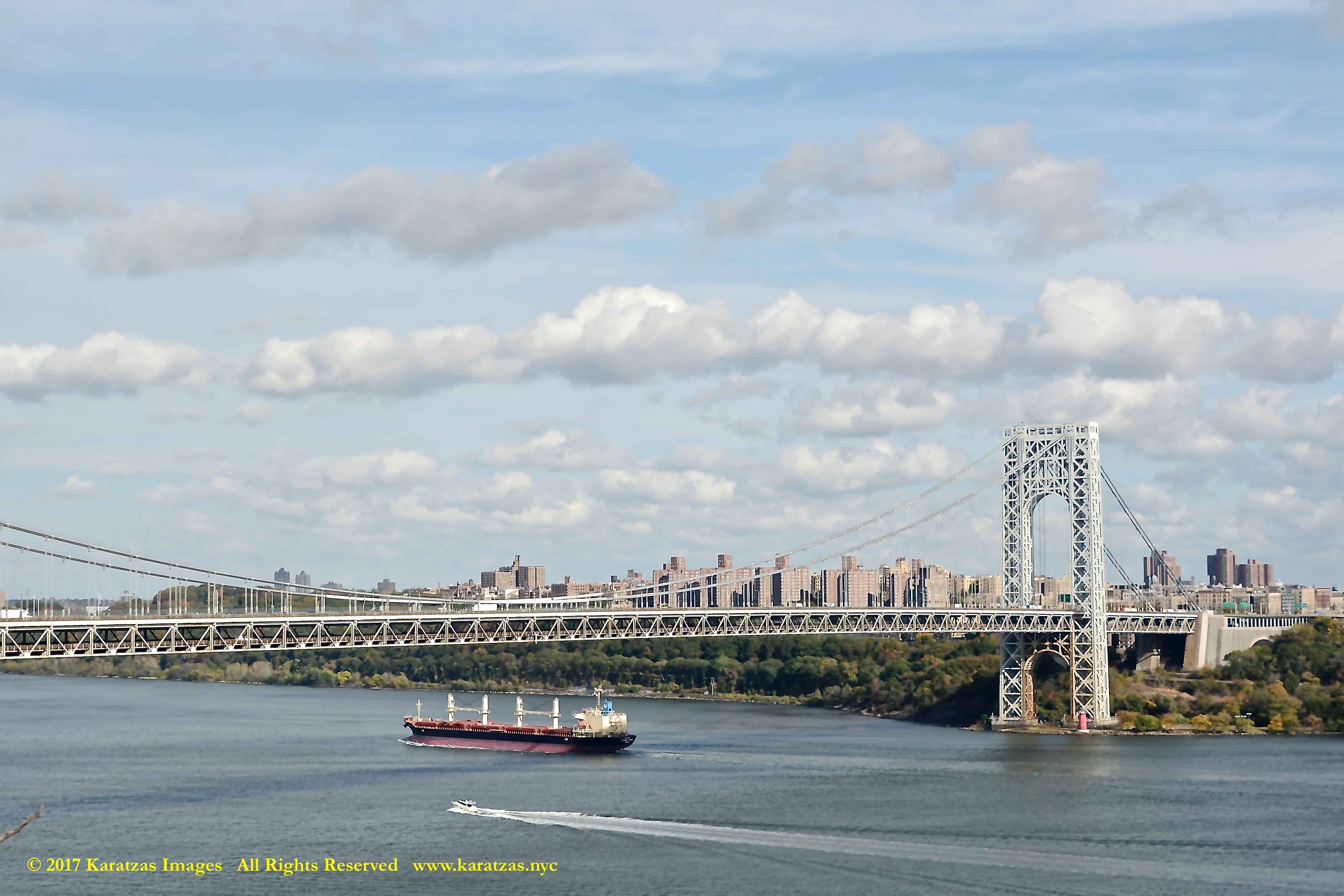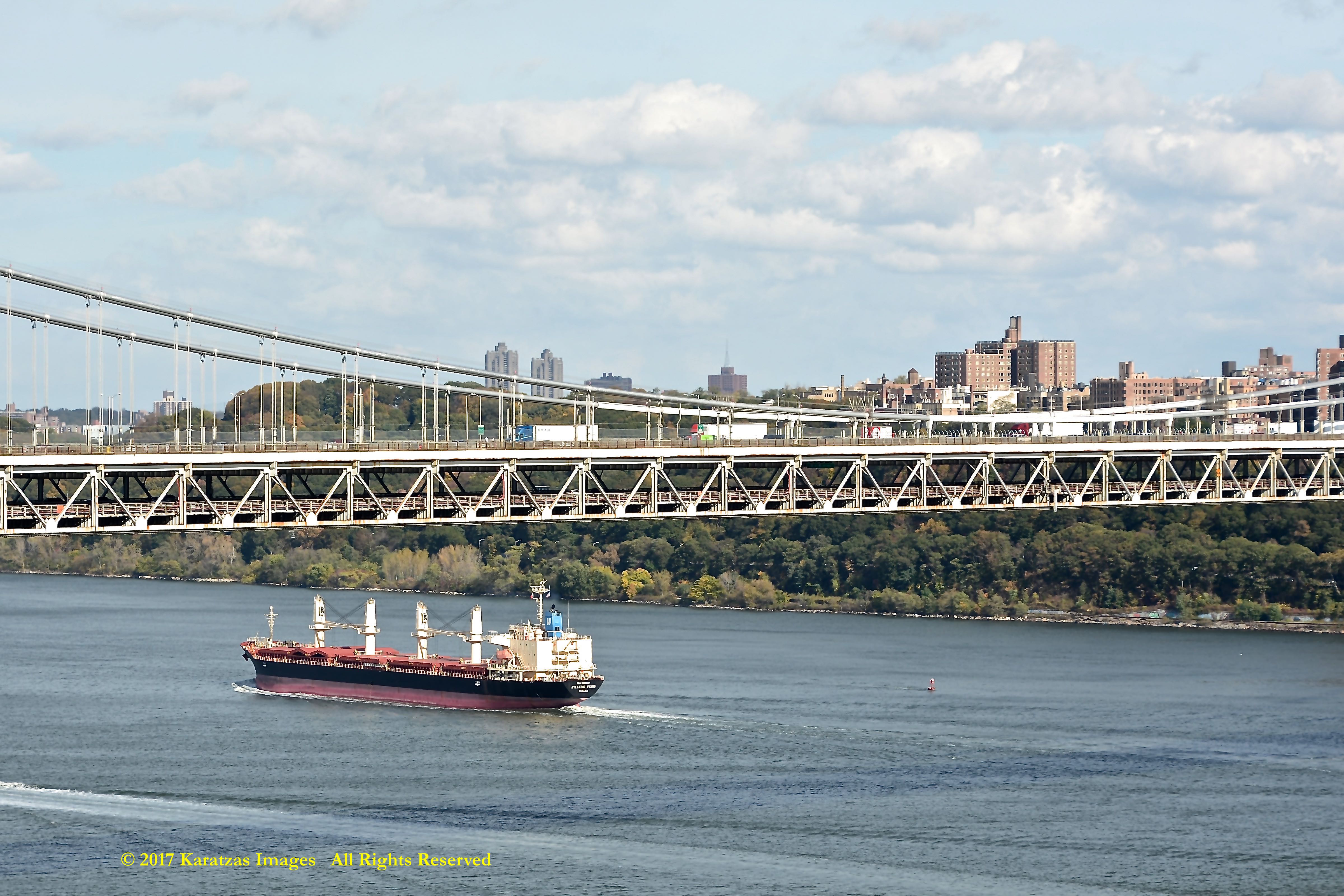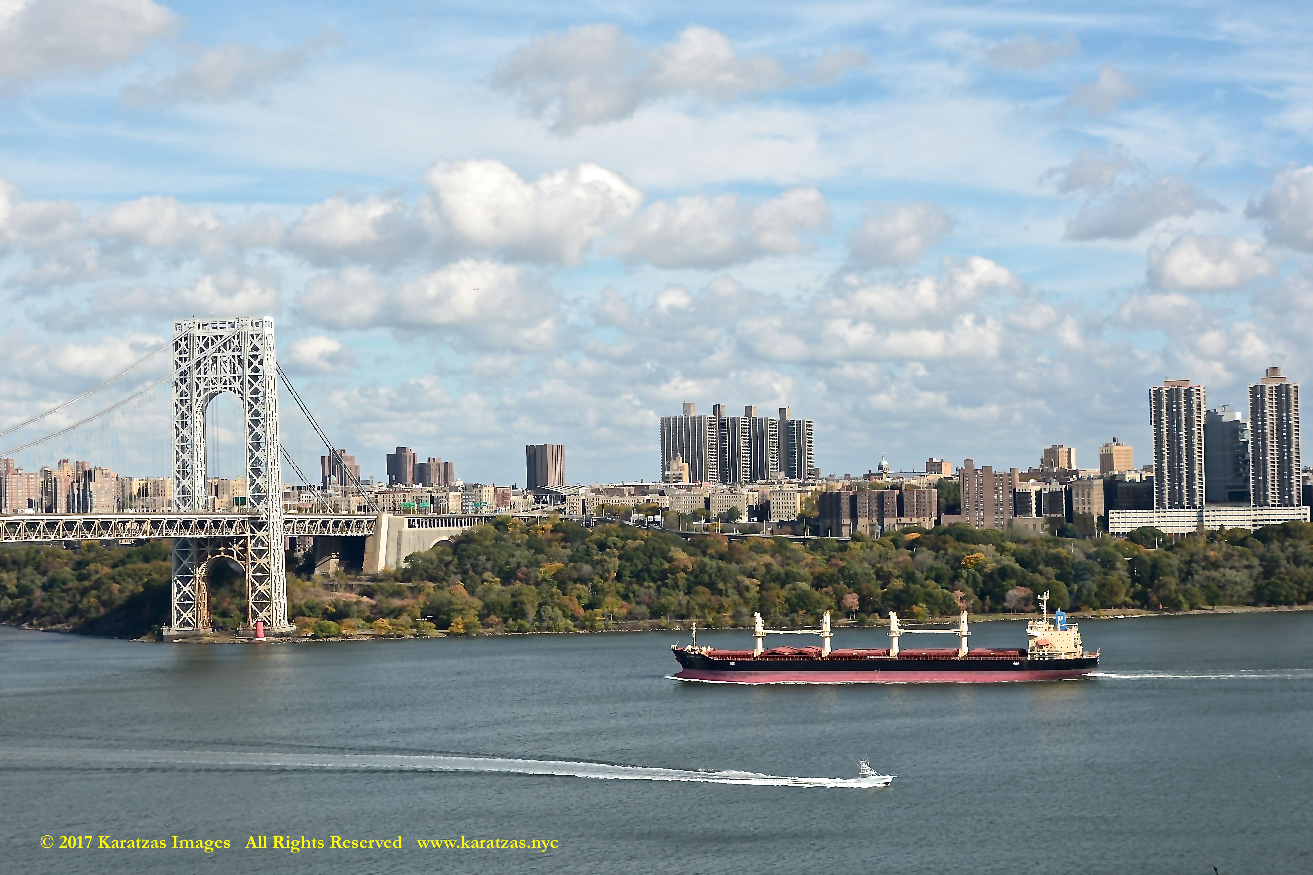 Well-equipped, modern-design handysize bulker (designed by and built at Fukuoka S.B., Japan) sailing upstream the Hudson River in New York. Under the George Washington Bridge; the sky looks like it’s painted by Michelangelo himself! New England autumn! Image credit: Karatzas Images.