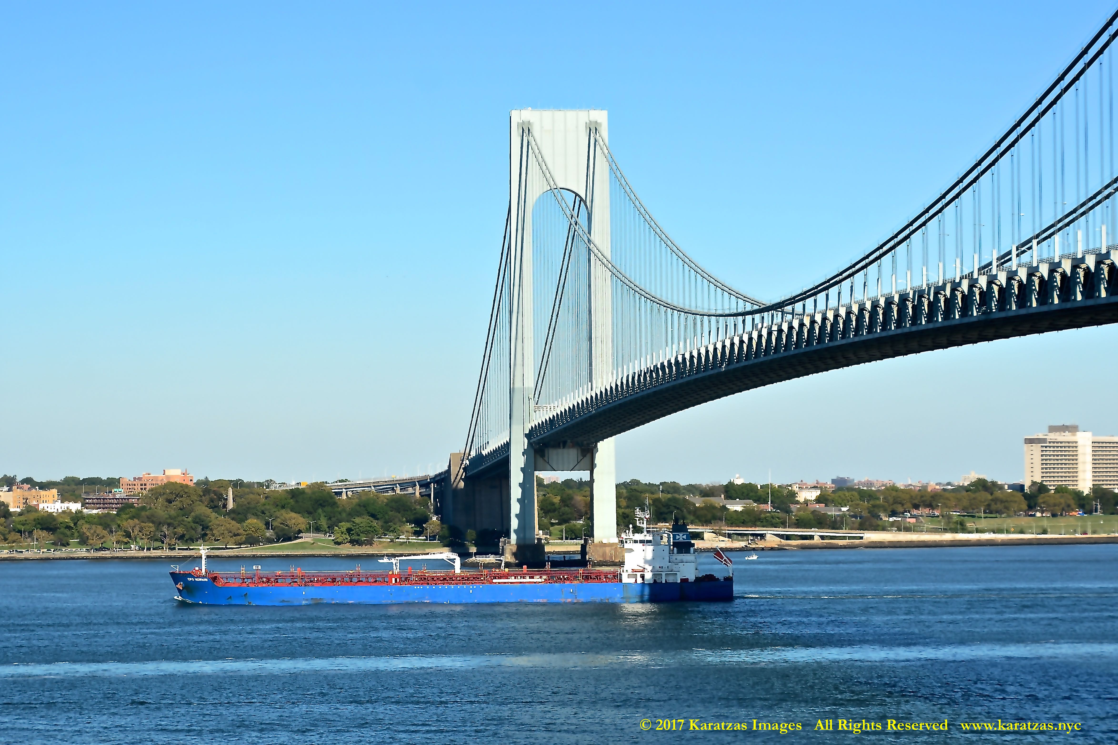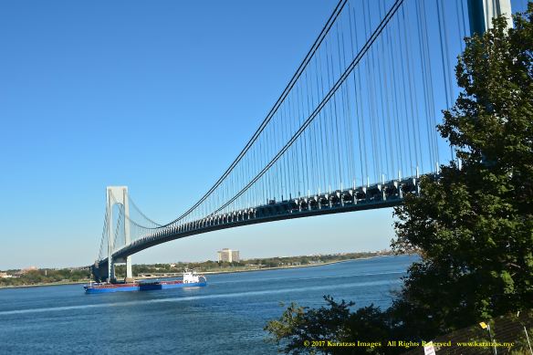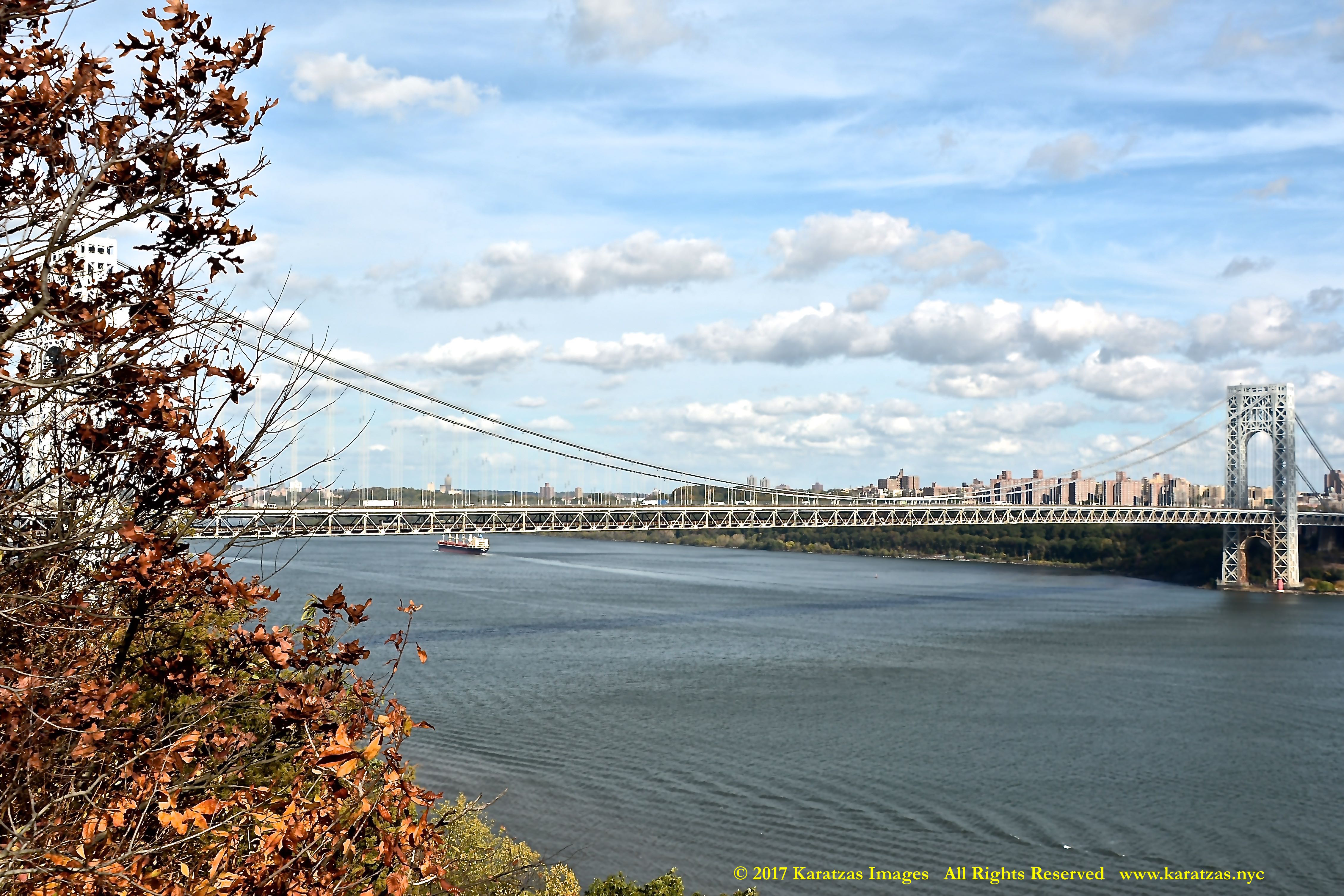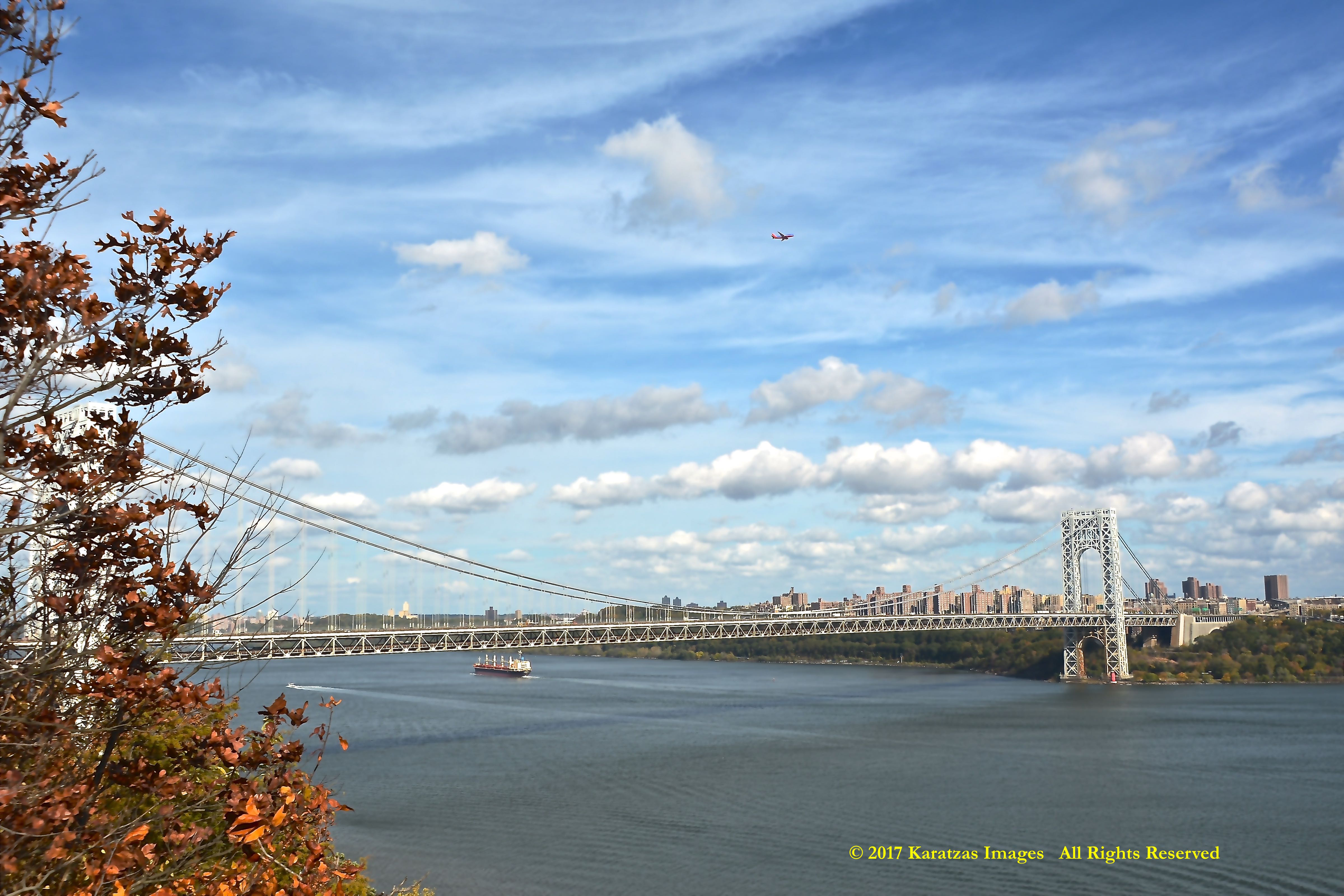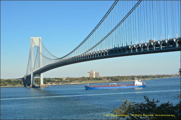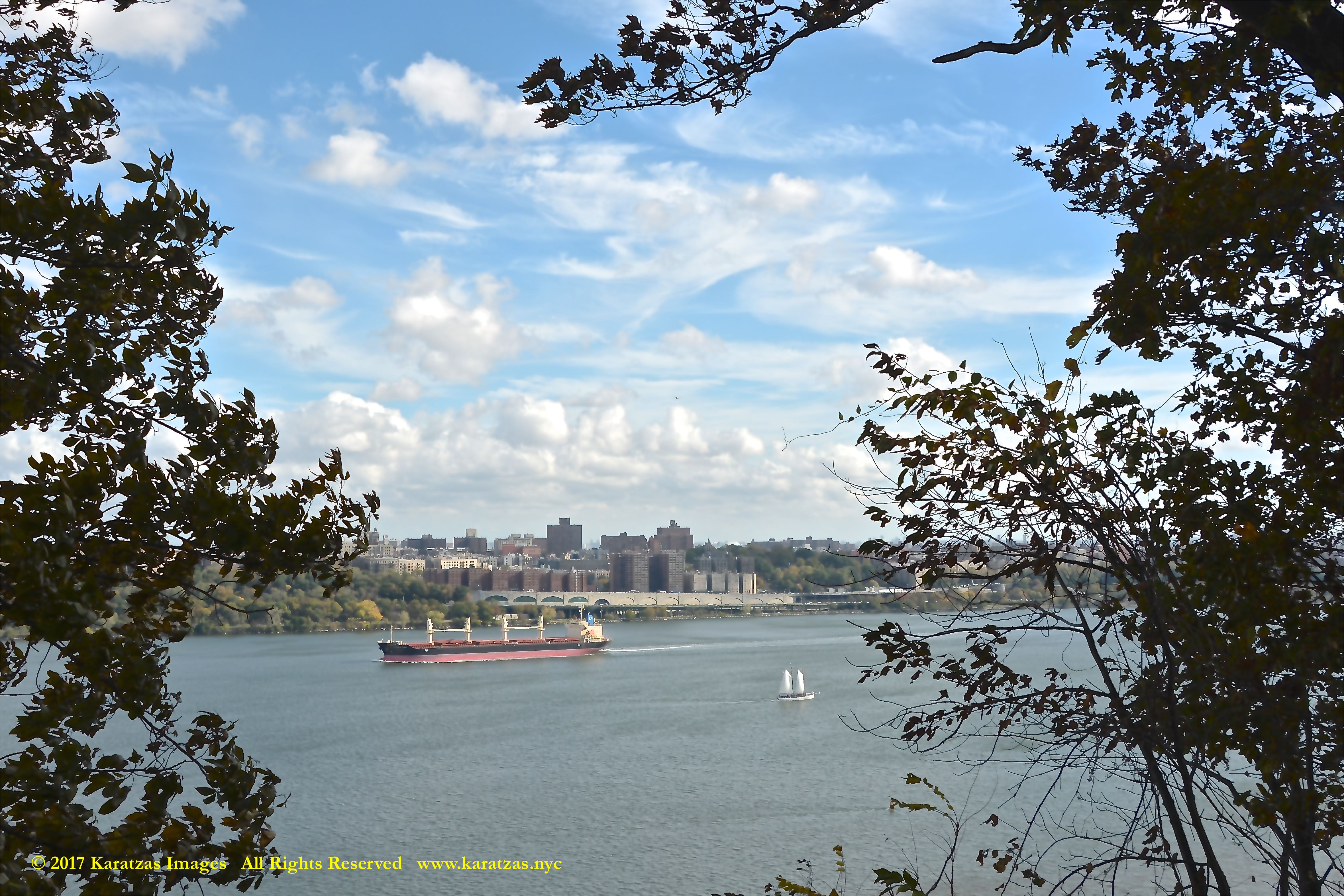 Well-equipped, modern-design handysize bulker (designed by and built at Fukuoka S.B., Japan) sailing upstream the Hudson River in New York. Under the George Washington Bridge; the sky looks like it’s painted by Michelangelo himself! New England autumn! Image credit: Karatzas Images.