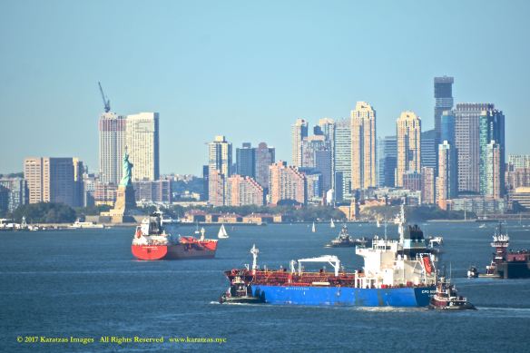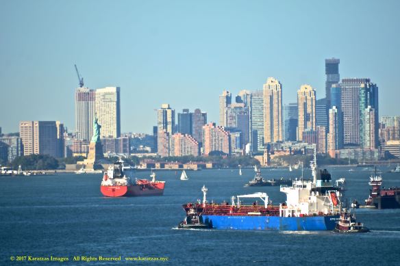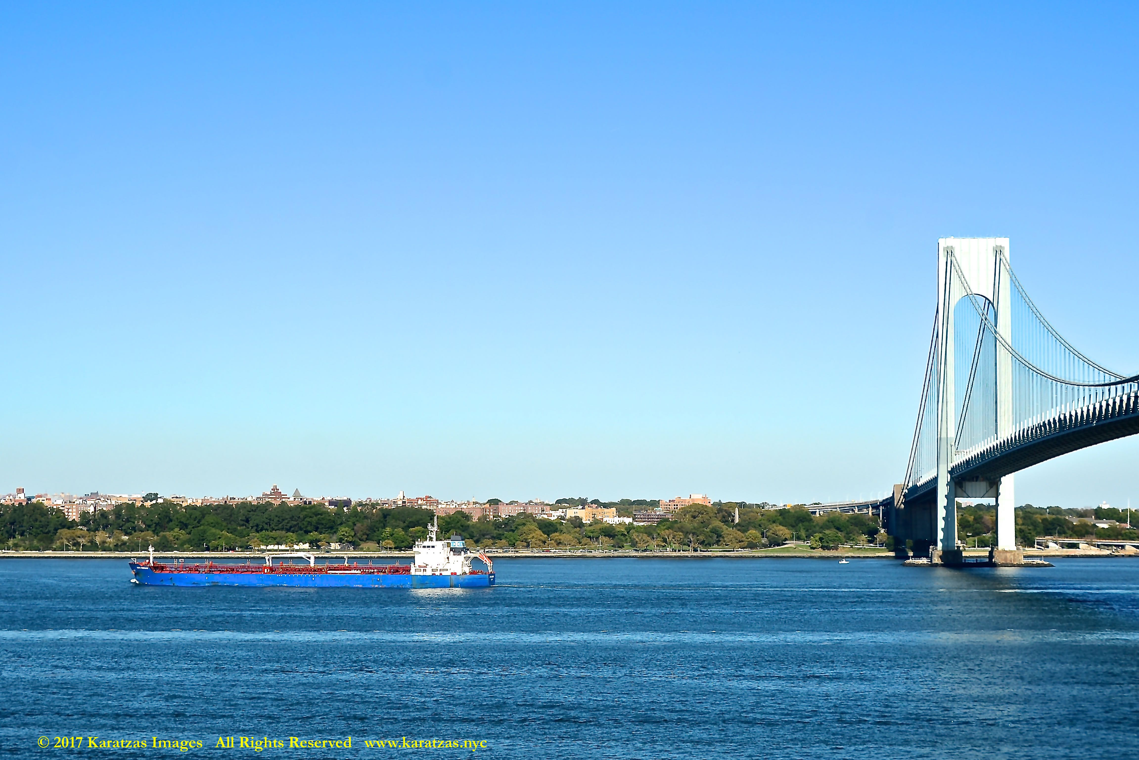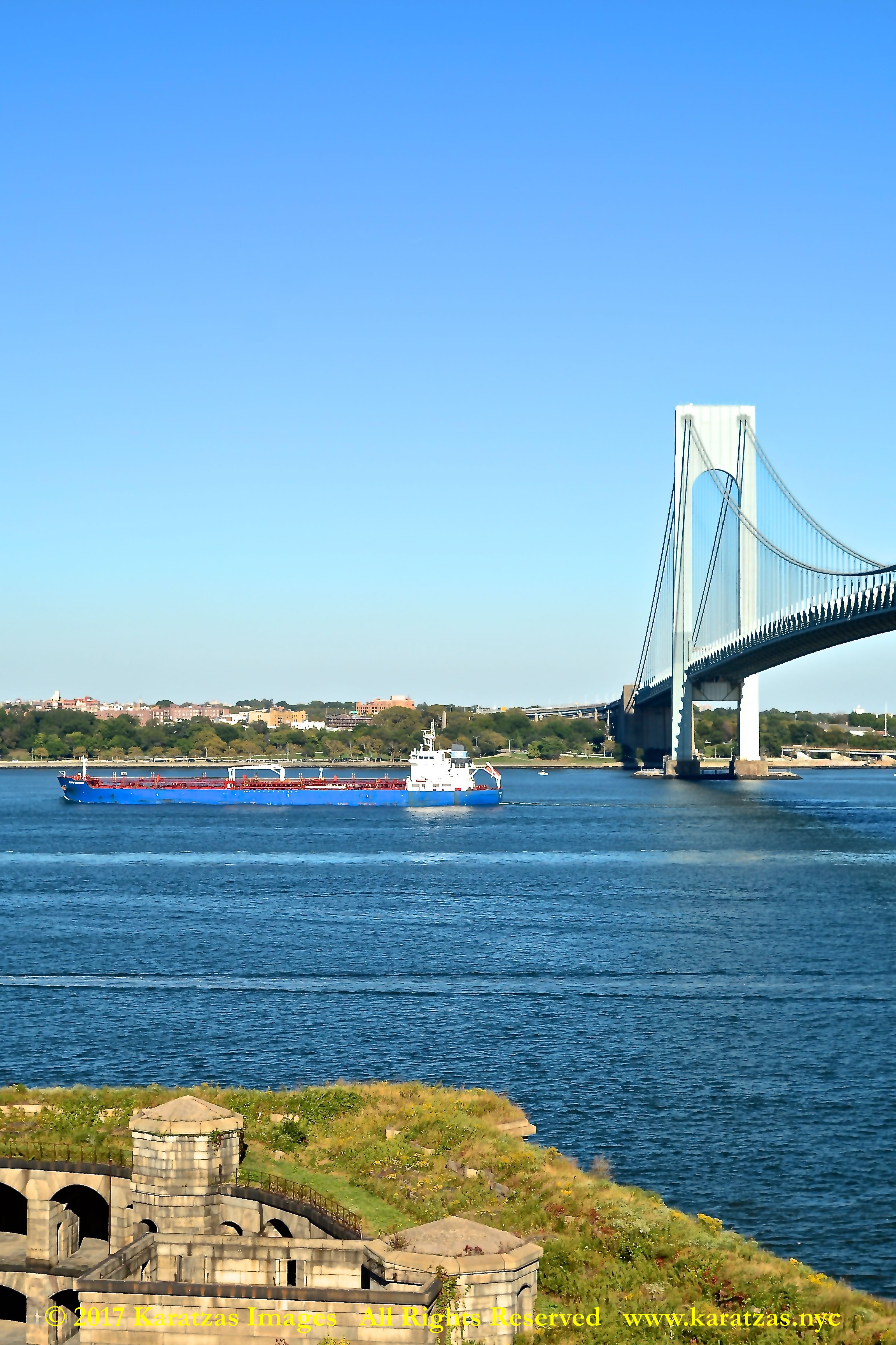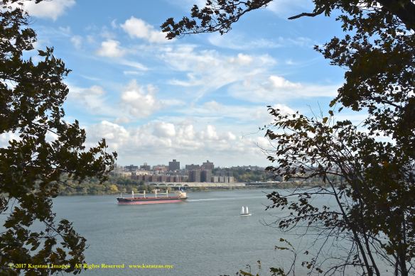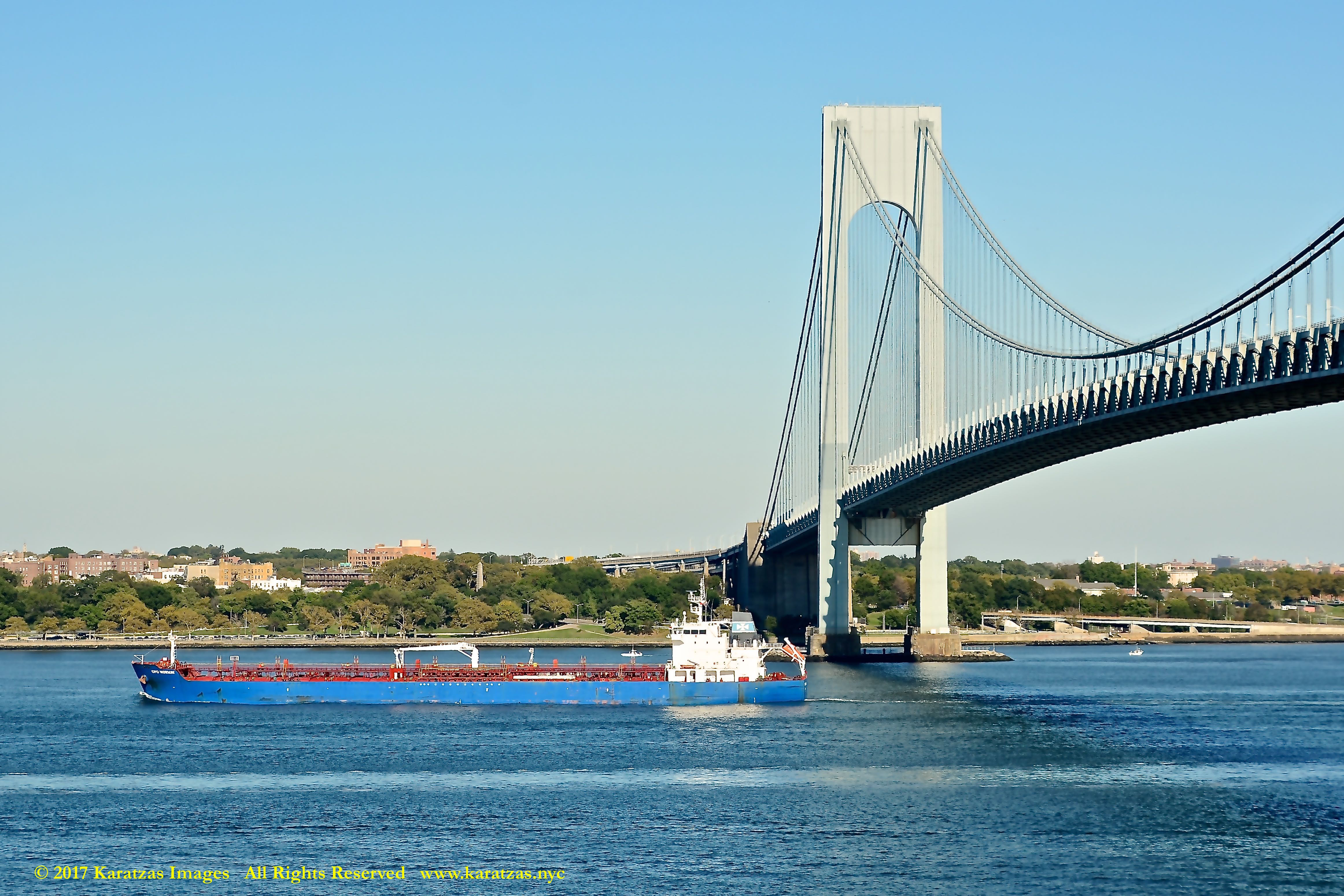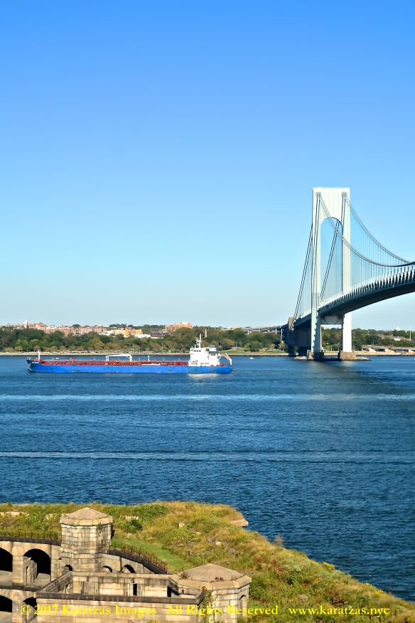 Well-equipped, modern-design handysize bulker (designed by and built at Fukuoka S.B., Japan) sailing upstream the Hudson River in New York. Under the George Washington Bridge; the sky looks like it’s painted by Michelangelo himself! New England autumn! Image credit: Karatzas Images.