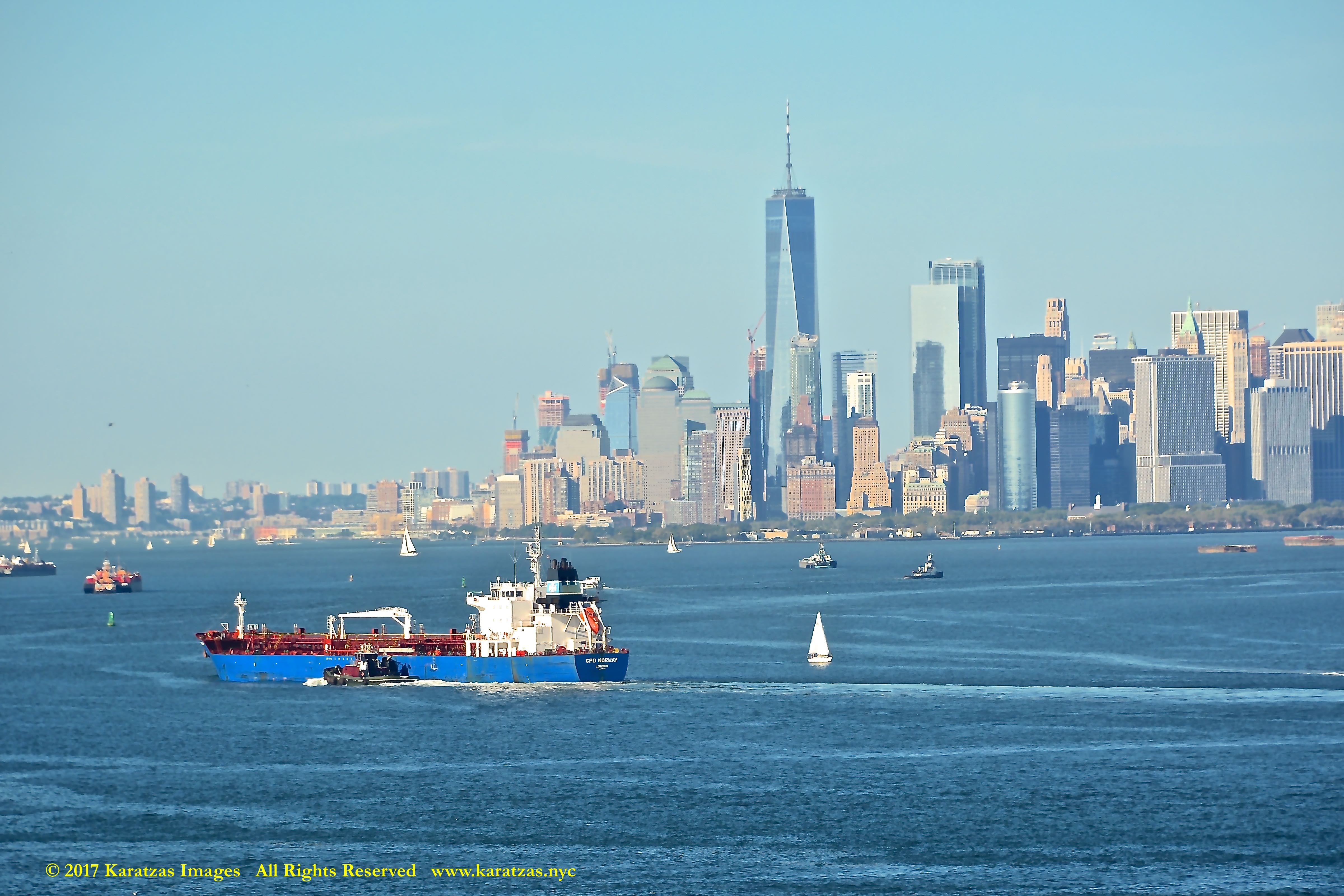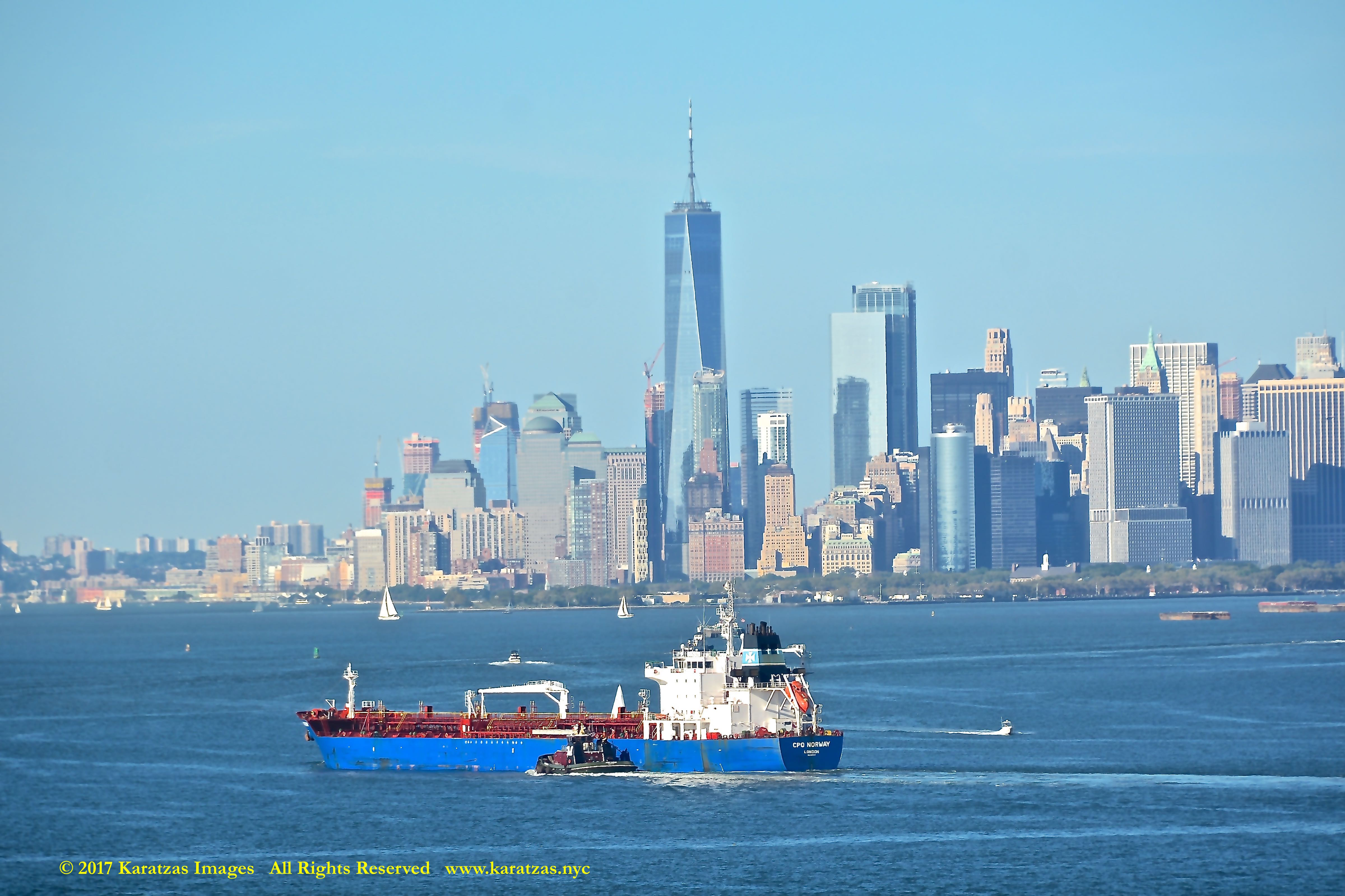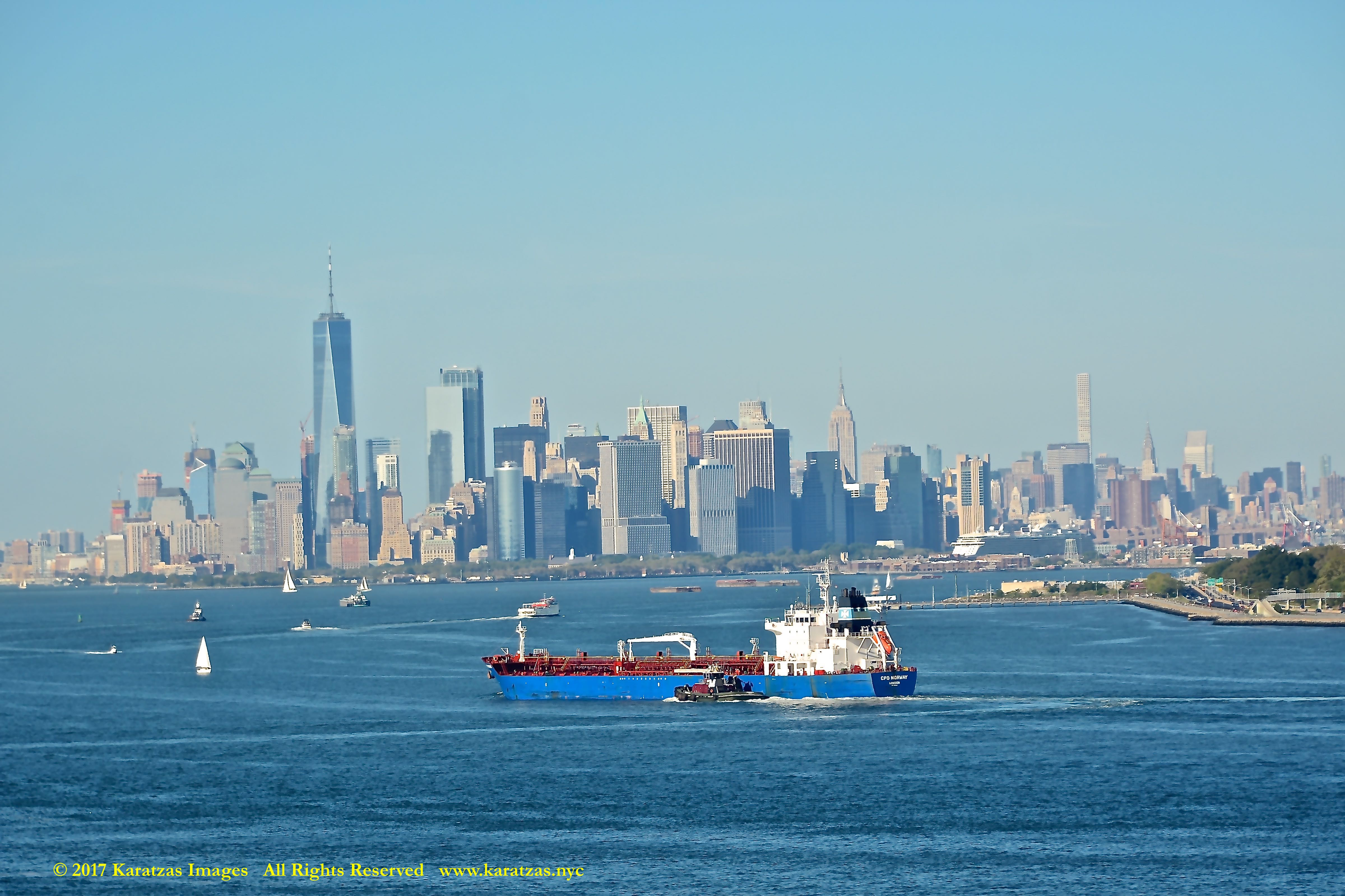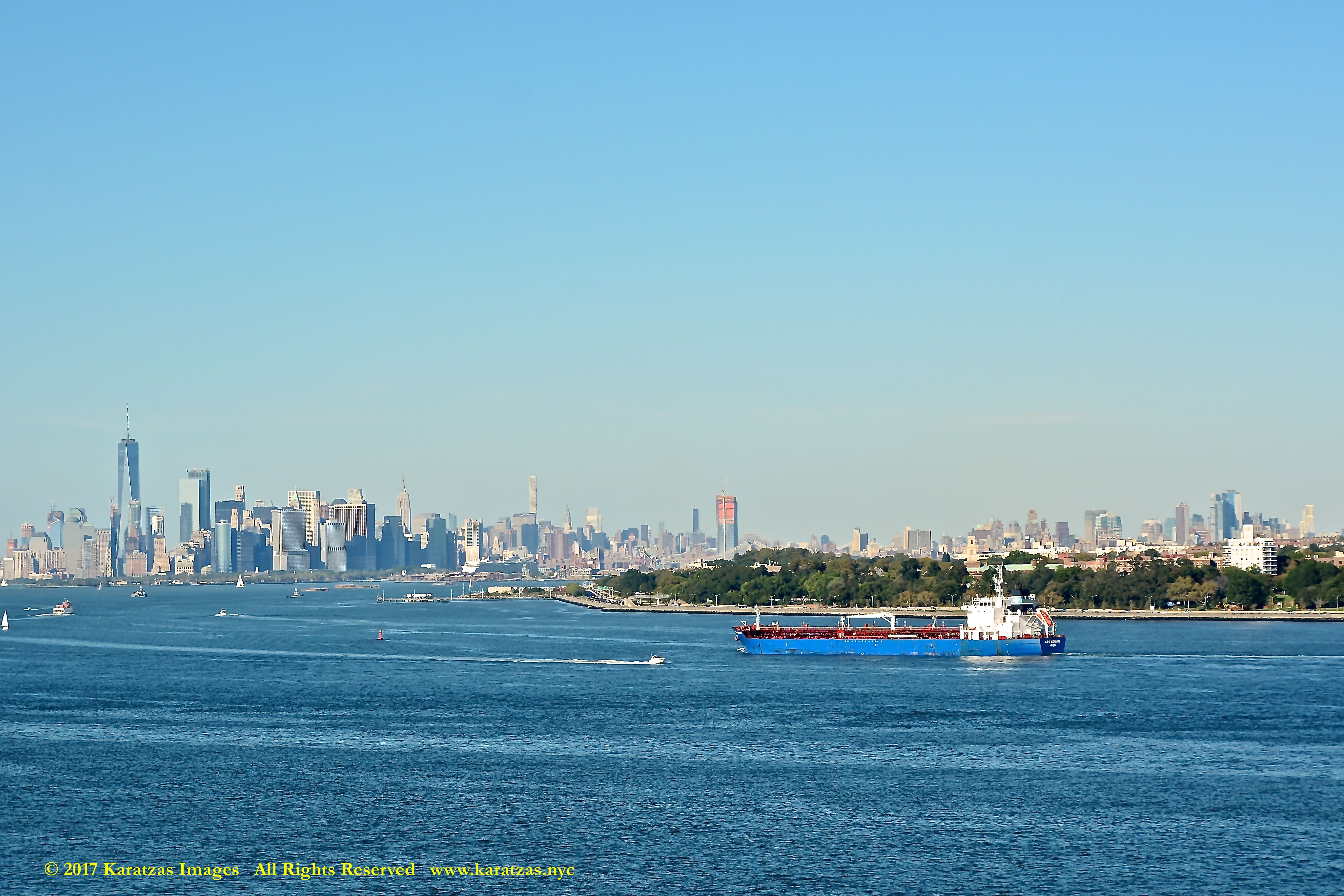 Well-equipped, modern-design handysize bulker (designed by and built at Fukuoka S.B., Japan) sailing upstream the Hudson River in New York. Seen here against the Manhattan skyline. Image credit: Karatzas Images.