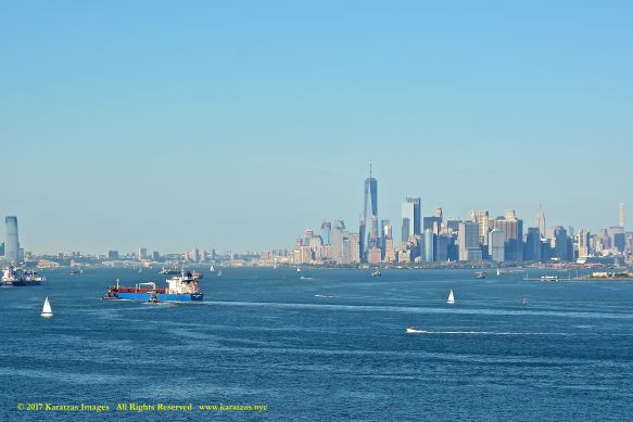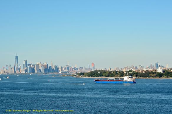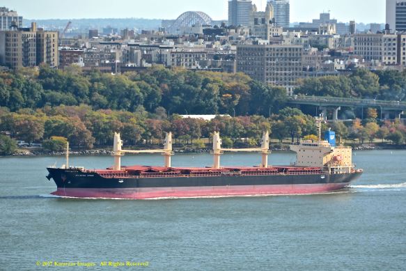 Well-equipped, modern-design handysize bulker (designed by and built at Fukuoka S.B., Japan) sailing upstream the Hudson River in New York. The ceiling, sorry the sky, painted by Michelangelo! Image credit: Karatzas Images.