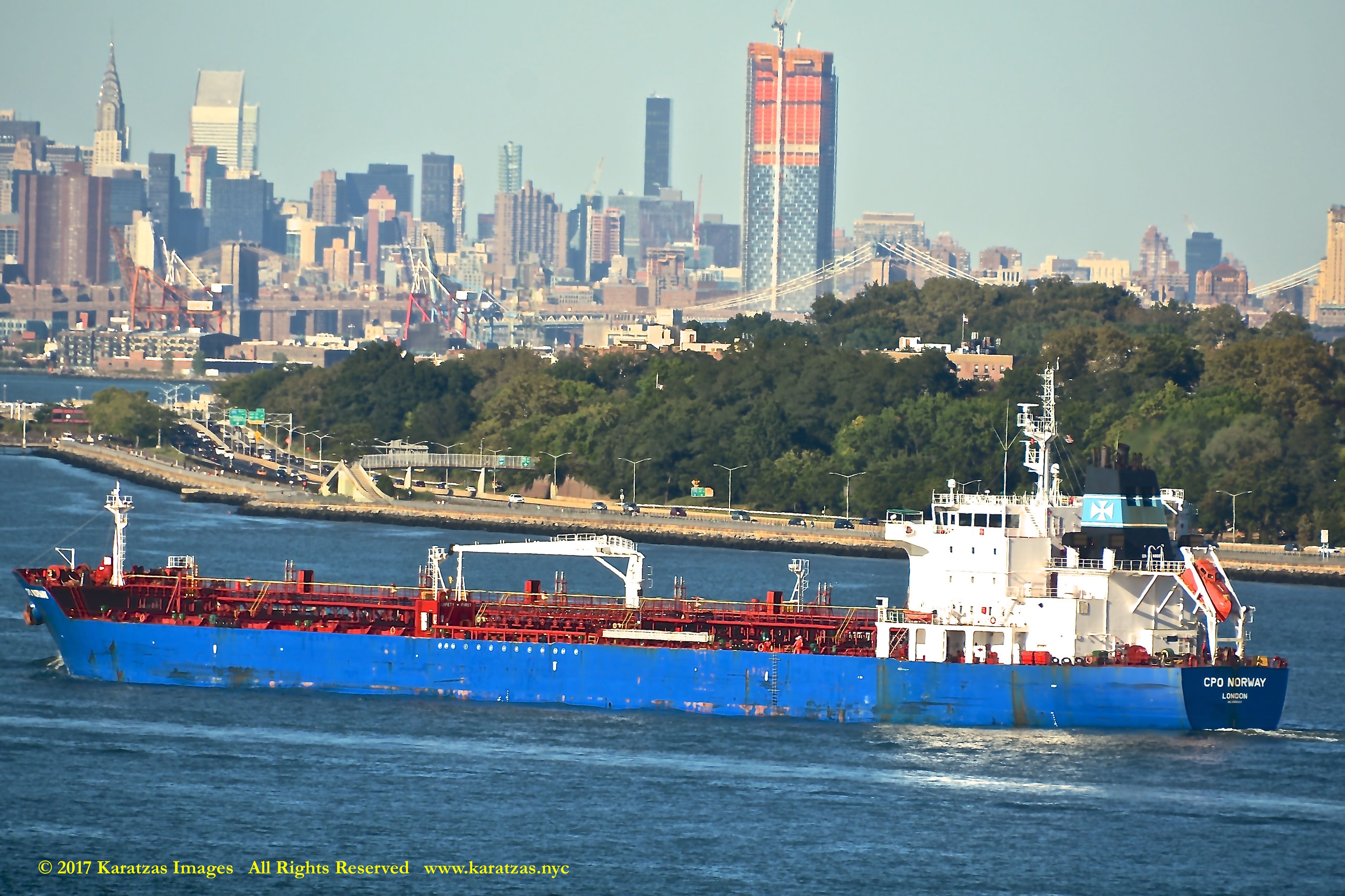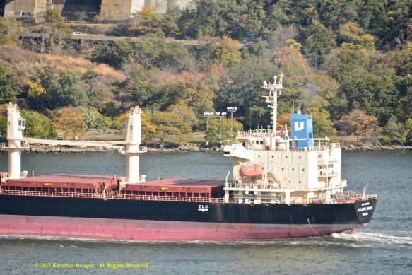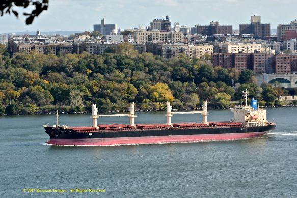 Well-equipped, modern-design handysize bulker (designed by and built at Fukuoka S.B., Japan) sailing upstream the Hudson River in New York. Approaching the George Washington Bridge; the sky looks like it’s painted by Michelangelo himself! New England autumn! Image credit: Karatzas Images.