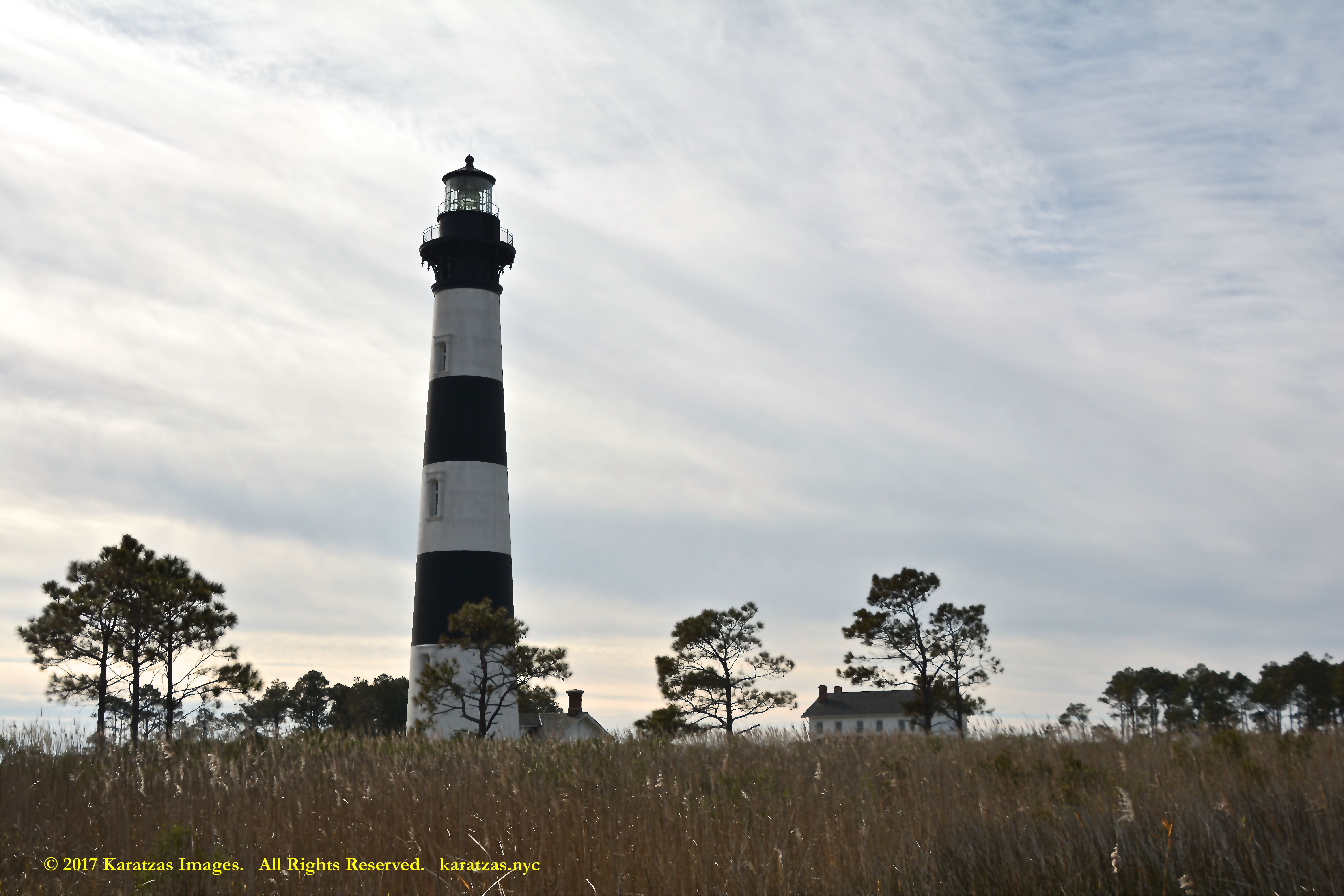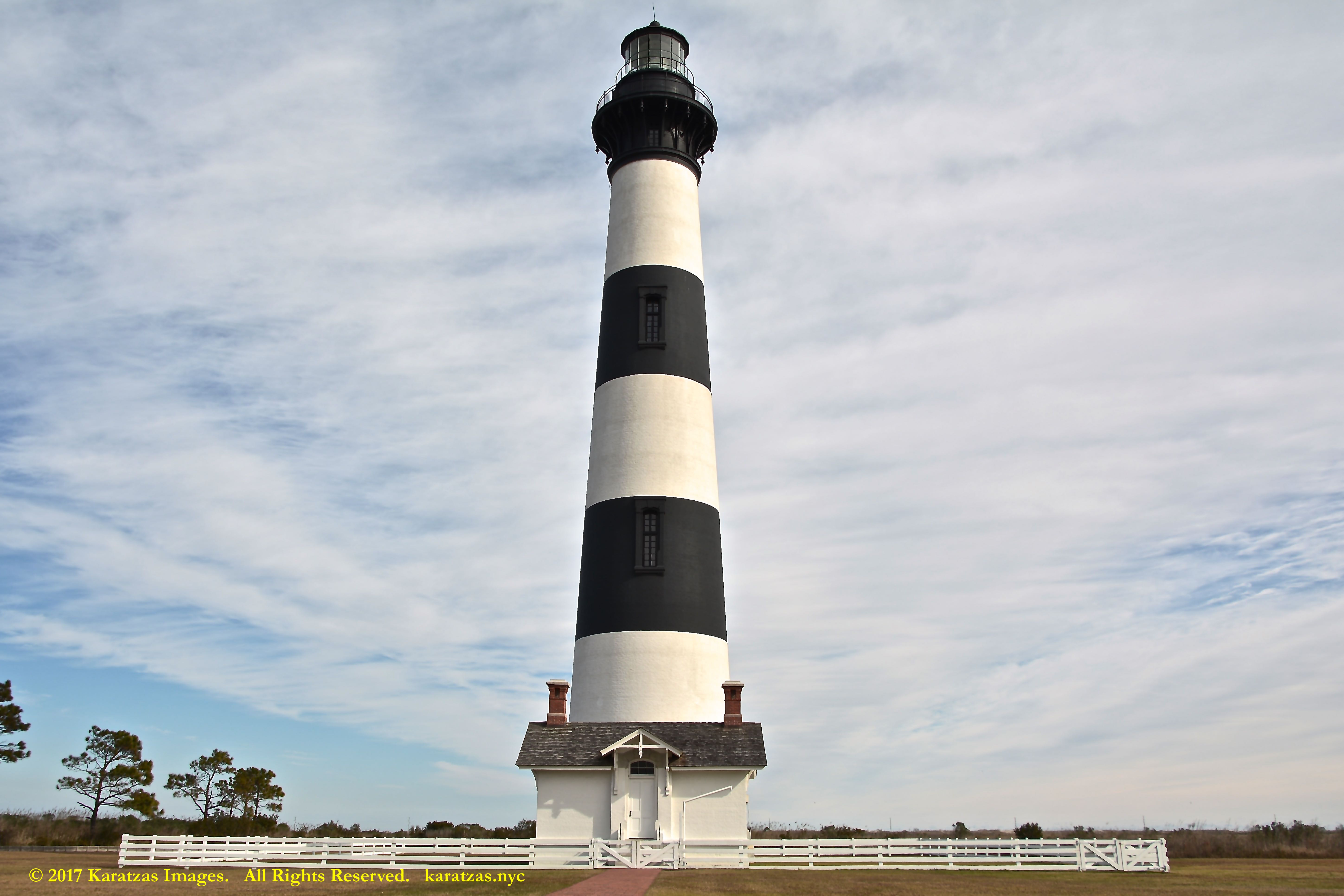 The Bodie Island Lighthouse is located in Bodie Island on the Outer Banks in North Carolina and was built in 1872. It stands 156 feet (48 m) tall and is located on the Roanoke Sound side of the first island that is part of the Cape Hatteras National Seashore. The lighthouse is just south of Nags Head, approximately one hour north of the Cape Hatteras Light; note black-and-white horizontal patterns to distinguish from the spiral Cape Hatteras Lighthouse coloring. Image credit: Karatzas Images.