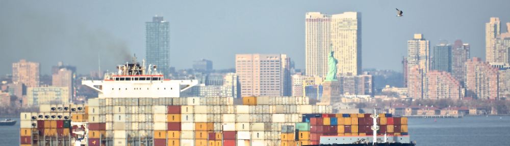 Neo-panamax containership MV ‘MSC Maeva’ departing the Port of New York / New Jersey. Seen here in the Upper New York Harbor ad with the One World Trade Center and the Lower Manhattan skyline as backdrop. Image credit: Karatzas Images