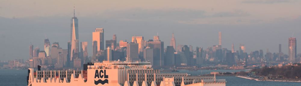 Rare type of vessel (“ConRo” as a combination of containership and RoRo vessel), MV ‘Atlantic Sky’ built in 2017 at a reported cost of $85 mil, seen here with the Lower Manhattan skyline and One World Trade Center in the background. Image credit: Karatzas Images