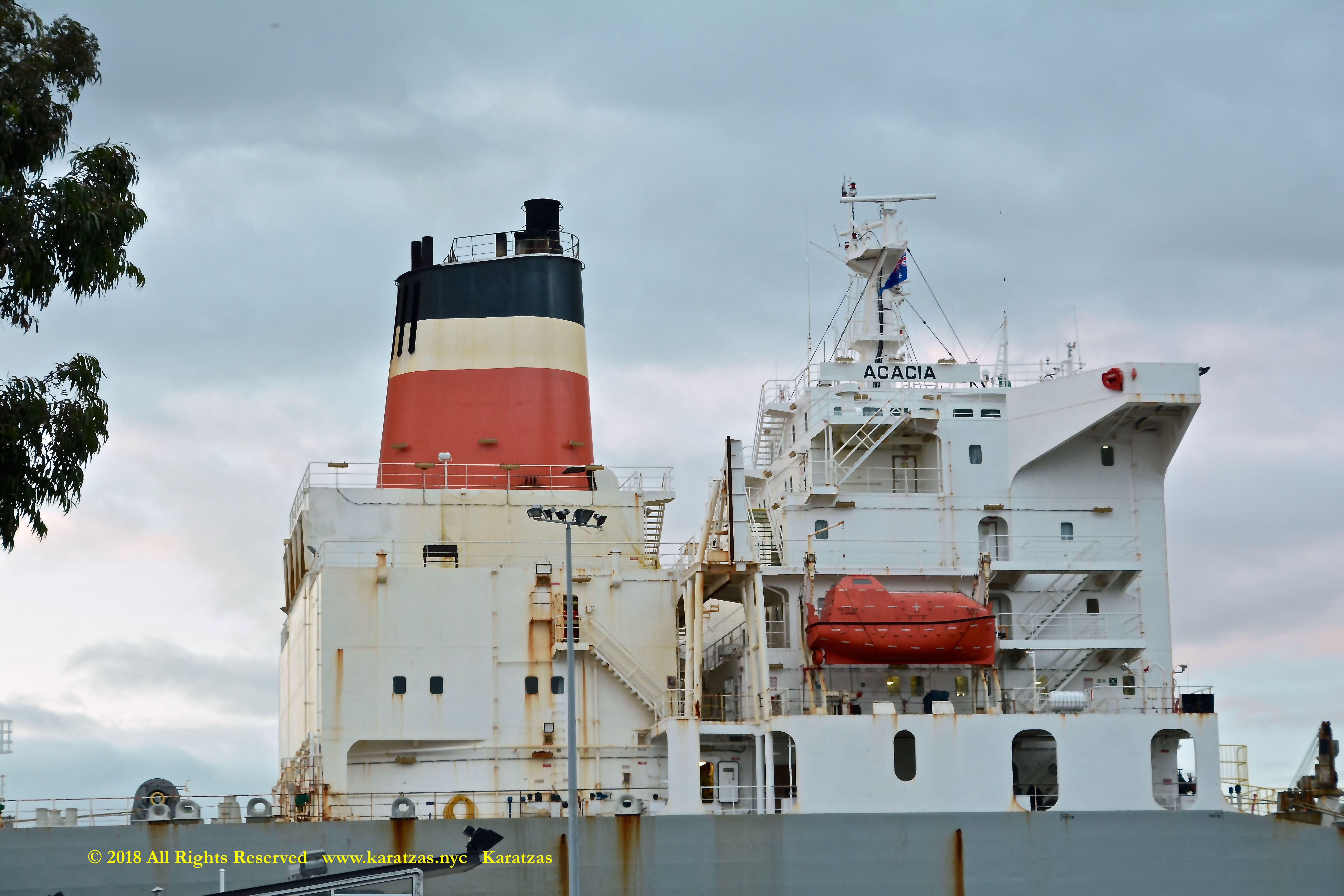 CSL’s self-unloading drybulk vessel MV ‘Acacia’ pictured unloading cement in the Port of Melbourne, Australia. View of the superstructure, accommodation and smokestack.Image credit: Karatzas Images