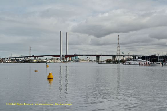 CSL’s self-unloading drybulk vessel MV ‘Acacia’ pictured unloading cement in the Port of Melbourne, Australia. Here seen framed by the main span of the Bolte Bridge over the Yarra River. Image credit: Karatzas Images