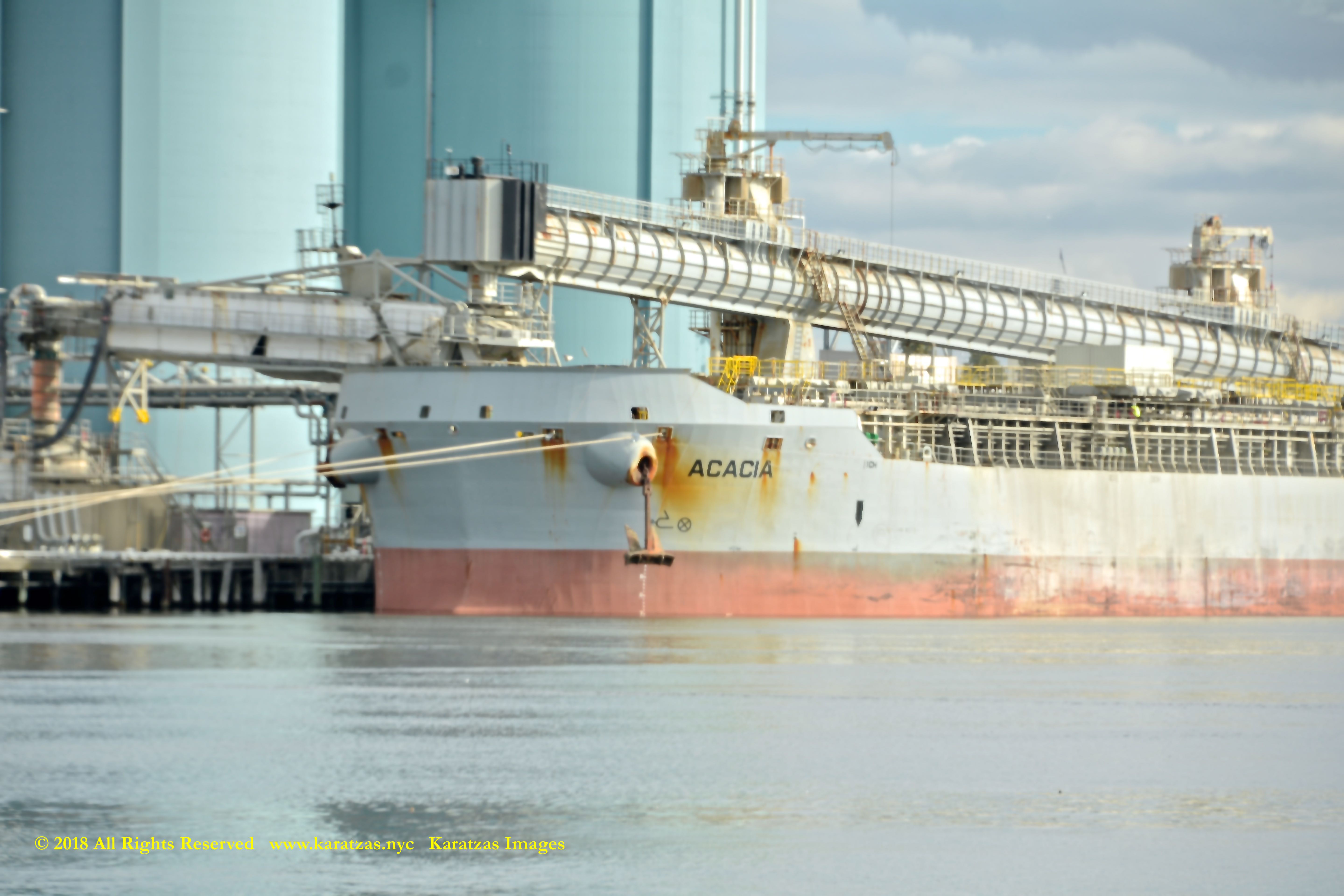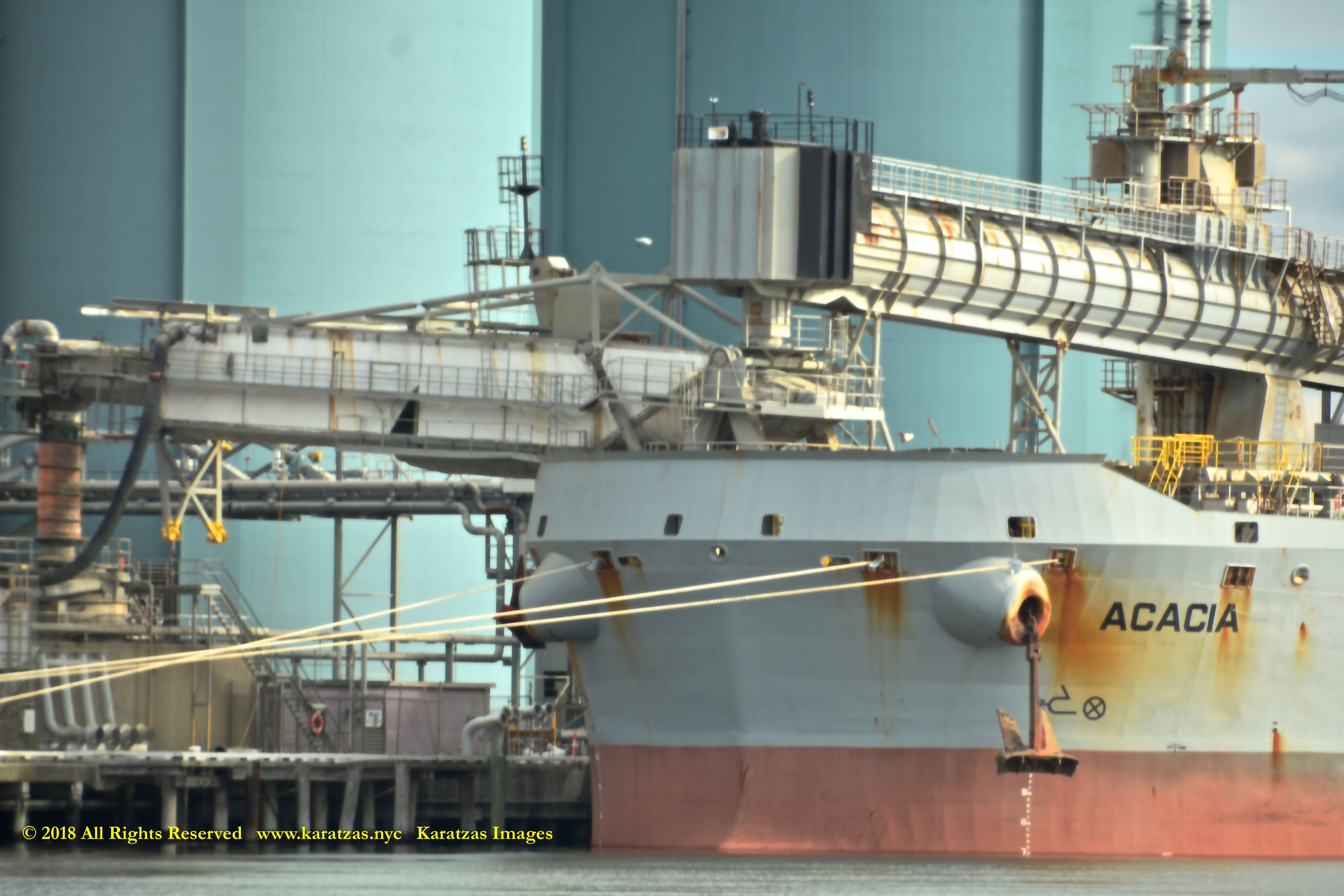 CSL’s self-unloading drybulk vessel MV ‘Acacia’ pictured unloading cement in the Port of Melbourne, Australia. View of the smokestack painted with the house colors. Image credit: Karatzas Images