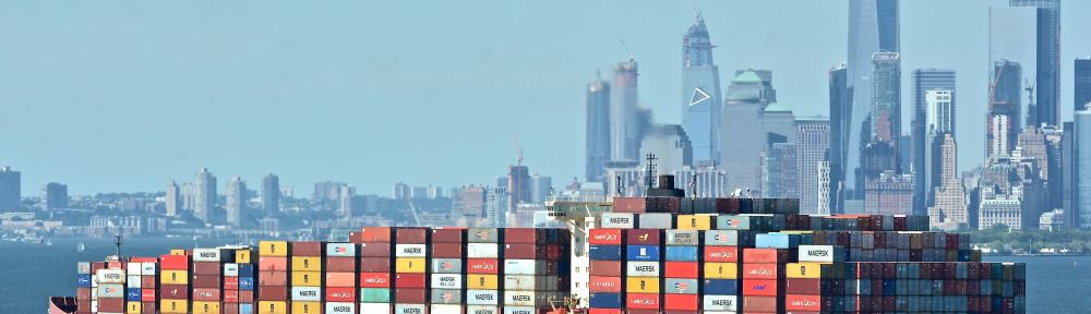 Neo-panamax Containership MV ‘Arthur Maersk’ (8,700-teu built in 2003 at Odense Lindo, Denmark) in New York Harbor. Seen here with One World Trade Center in the backdrop. Image credit: Karatzas Images