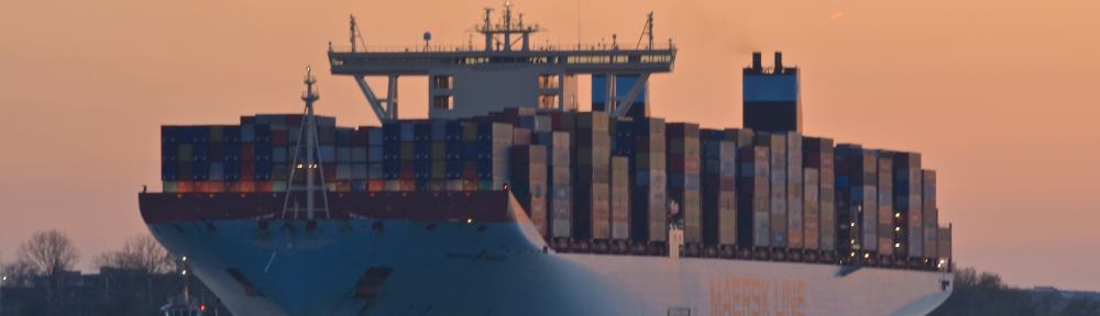 Post-neo-panamax containership MV ‘Mathilde Maersk’ sailing upstream in Nordelbe, arriving at the Port of Hamburg – under a majestic spring sunset. Image credit: Karatzas Images