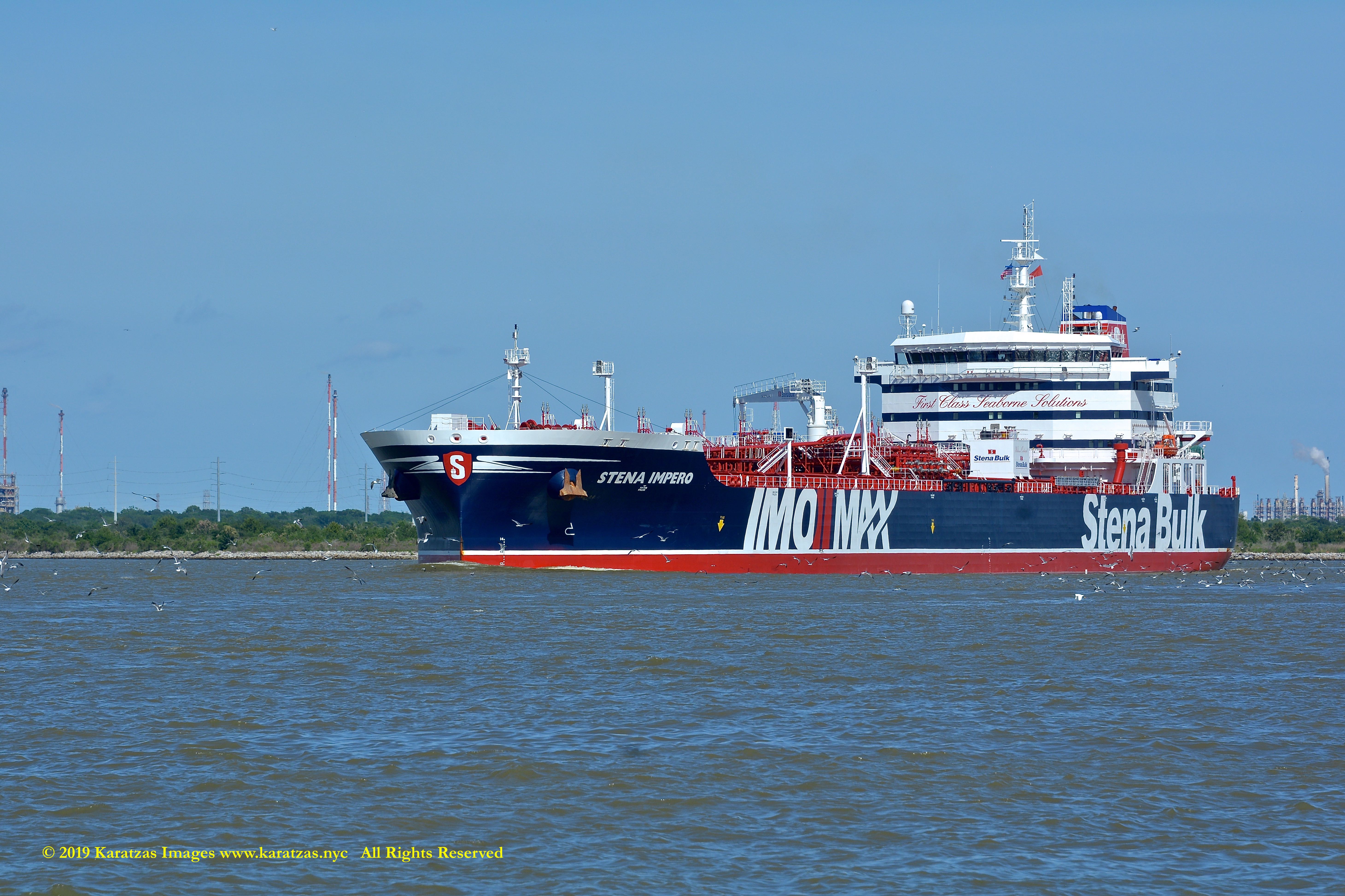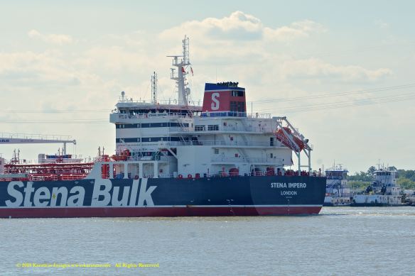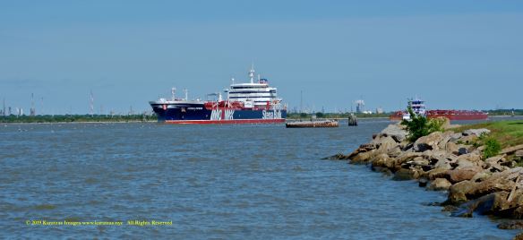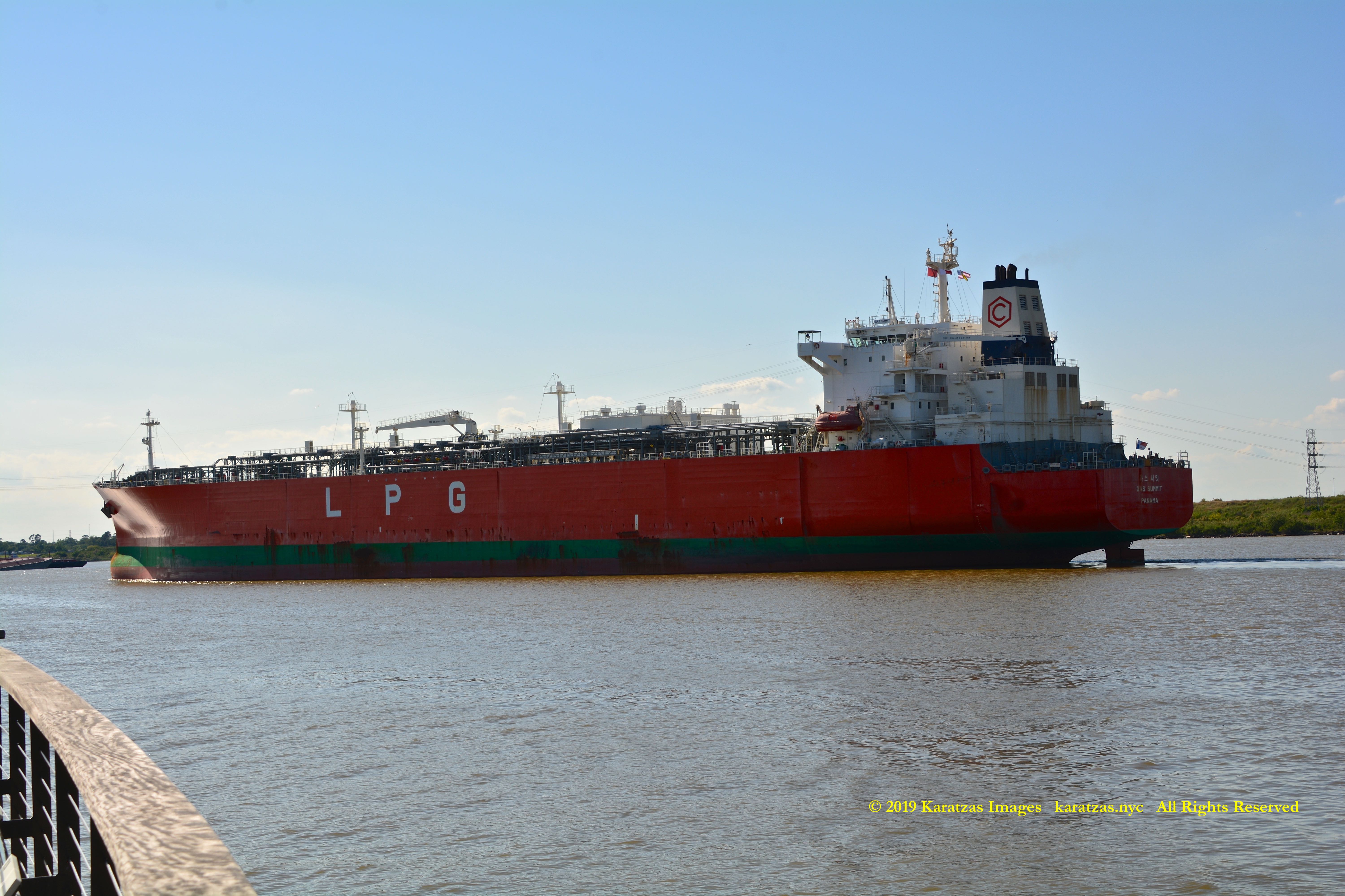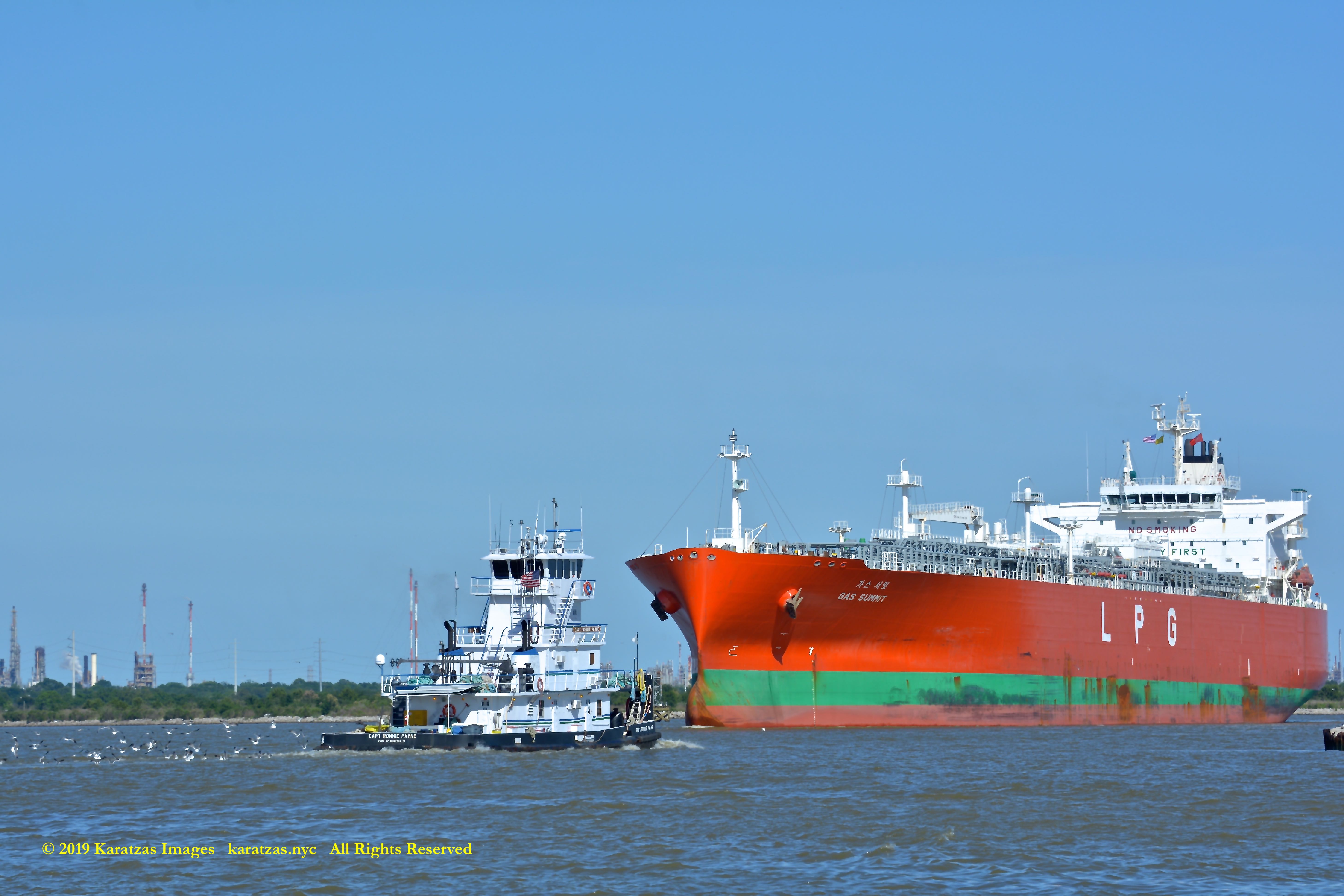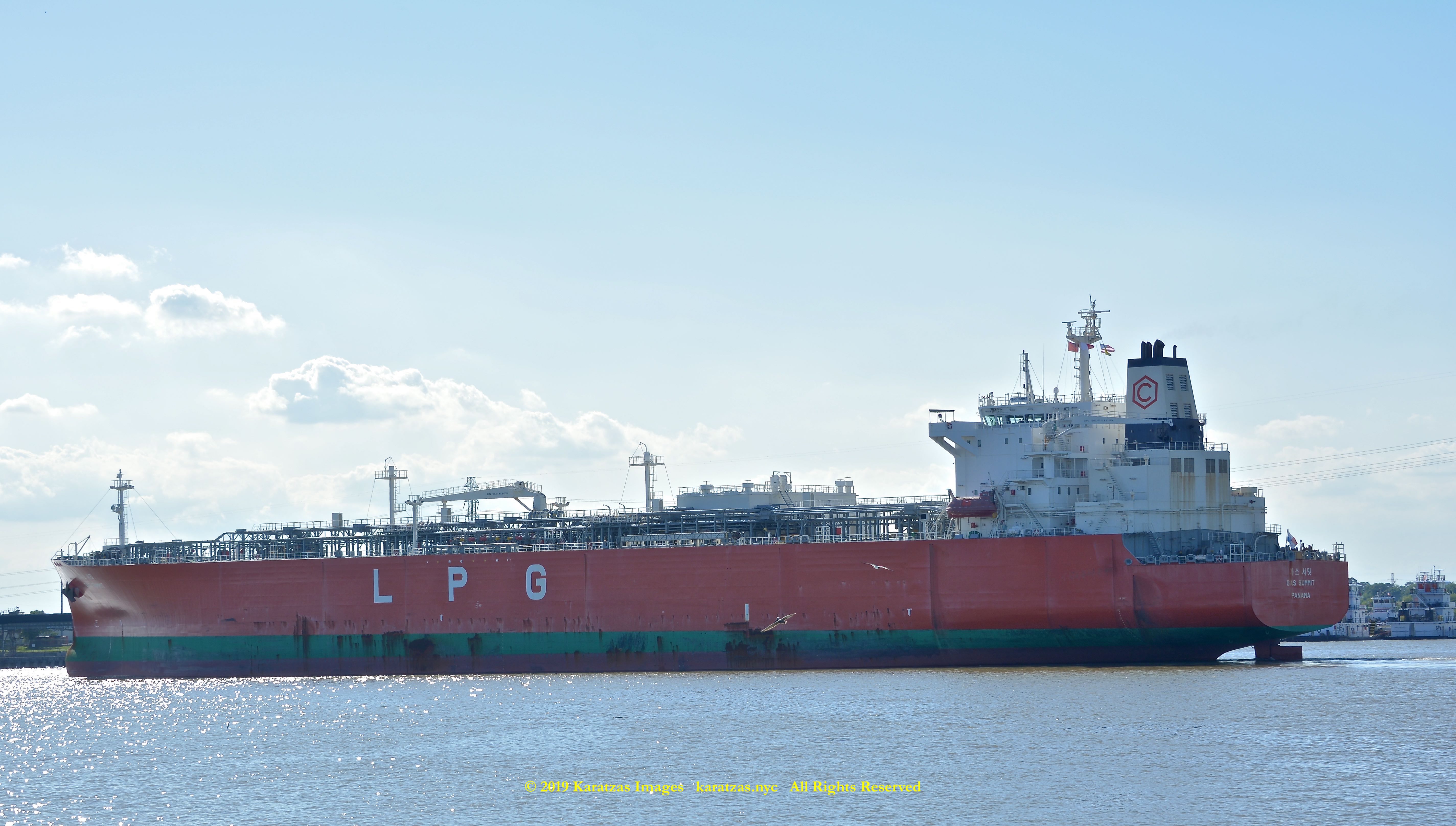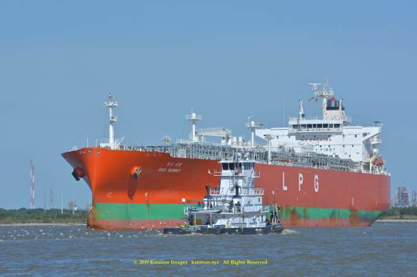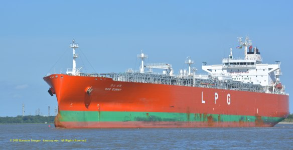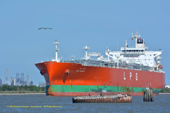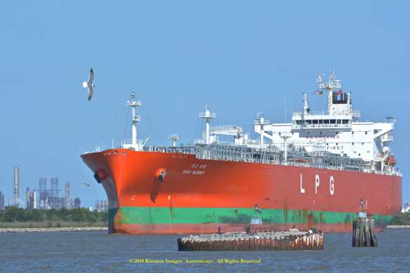 Images of brightly pained LPG tanker of MT ‘Gas Summit’ (84,000 cbm, 54,000 dwt, built in 2014 at Hyundai Heavy (Ulsan) and owned by S. Korea’s KSS Line) sailing upstream in the Houston Ship Channel. Image credit: Karatzas Images