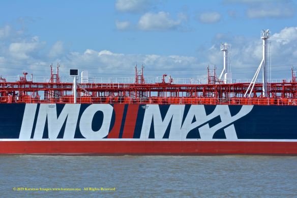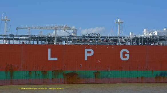 Images of brightly pained LPG tanker of MT ‘Gas Summit’ (84,000 cbm, 54,000 dwt, built in 2014 at Hyundai Heavy (Ulsan) and owned by S. Korea’s KSS Line) sailing upstream in the Houston Ship Channel. Detail amidships portside hull painting. Image credit: Karatzas Images
