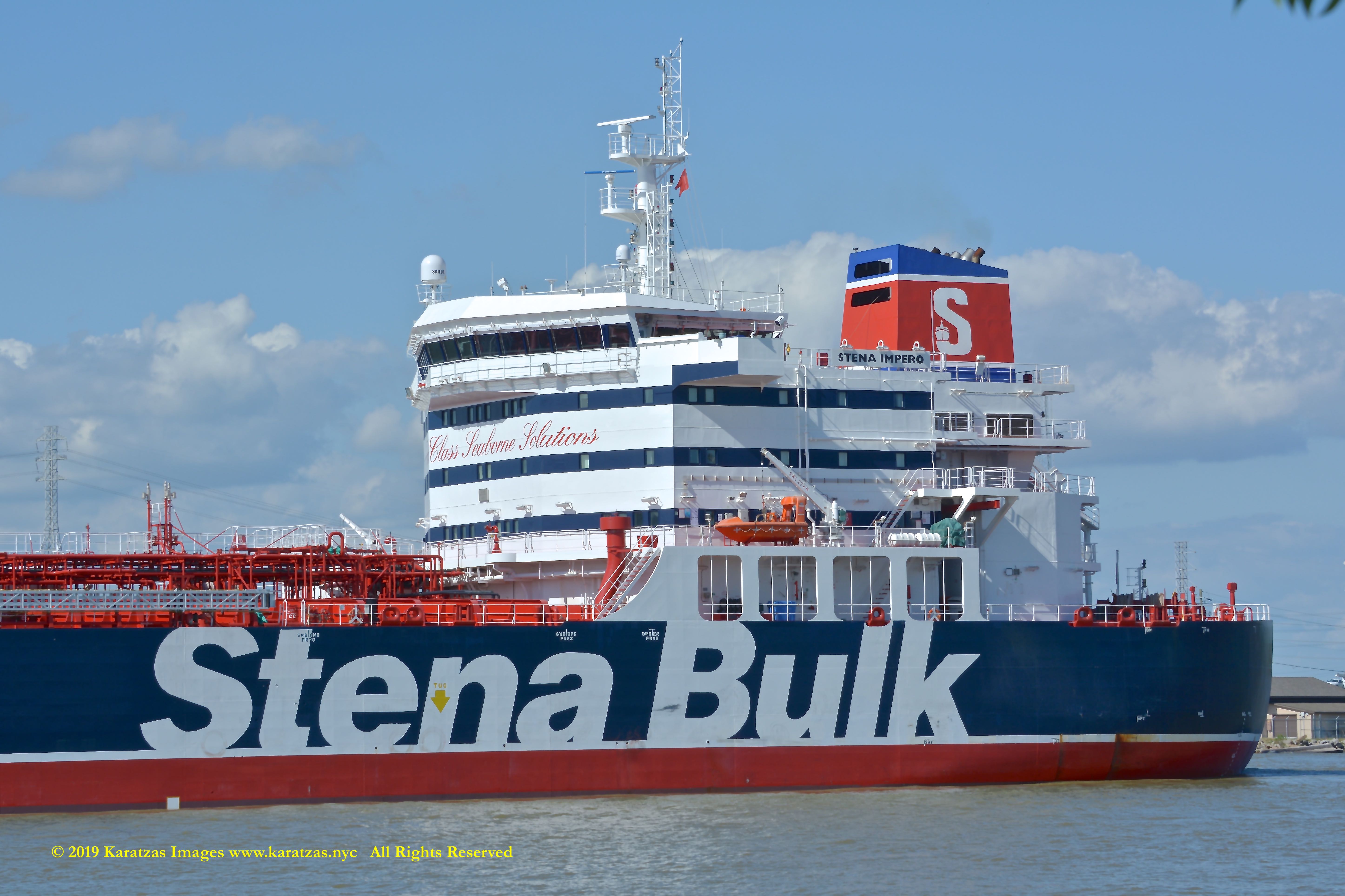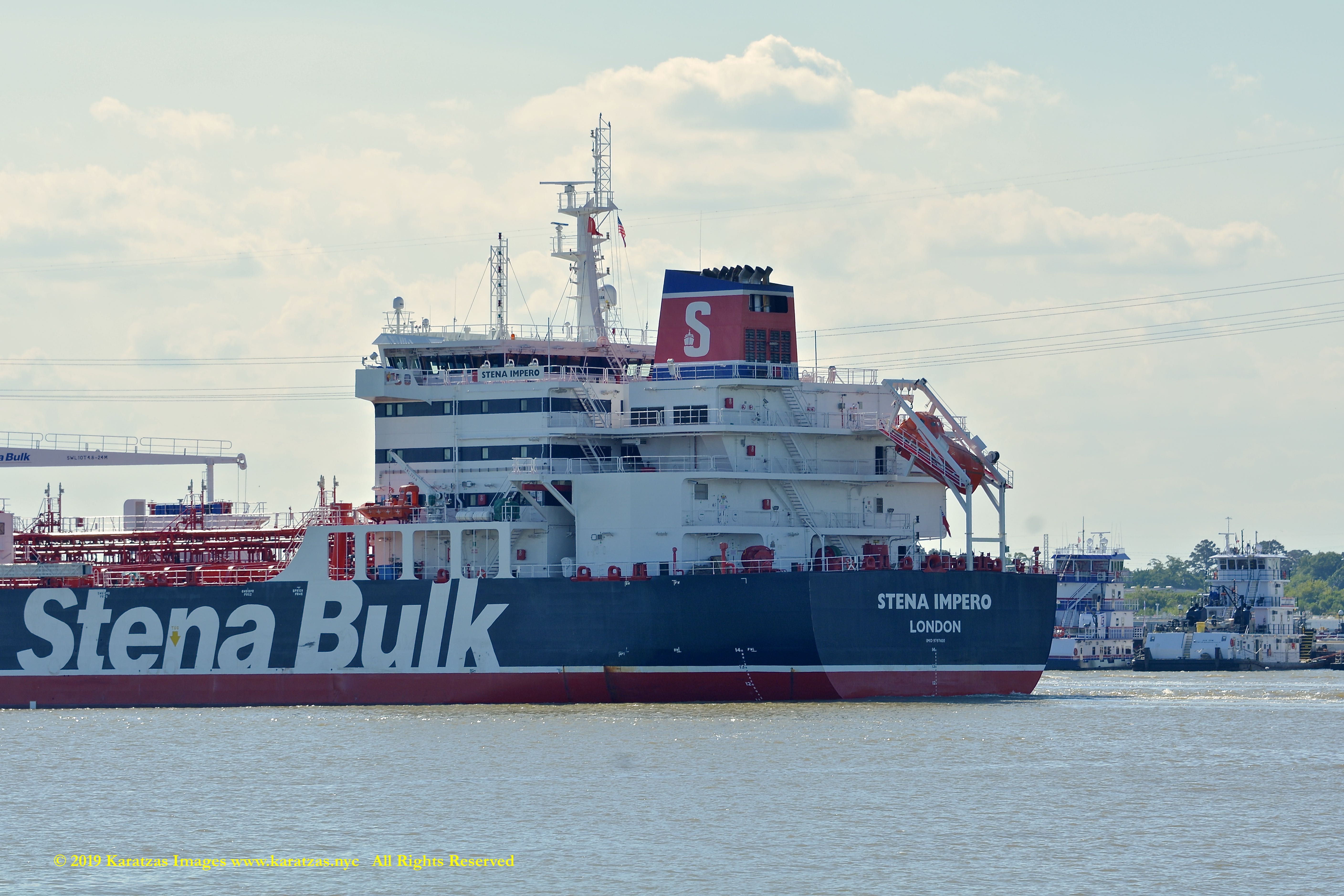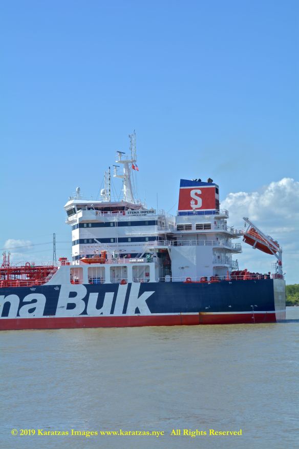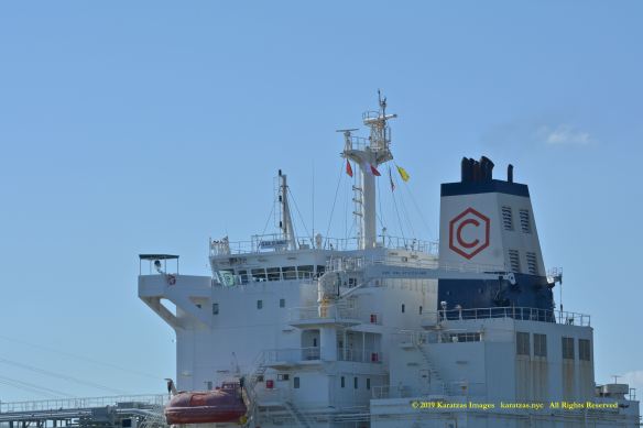Images of brightly pained LPG tanker of MT ‘Gas Summit’ (84,000 cbm, 54,000 dwt, built in 2014 at Hyundai Heavy (Ulsan) and owned by S. Korea’s KSS Line) sailing upstream in the Houston Ship Channel. Detail of accommodation and chimney-stack. Image credit: Karatzas Images