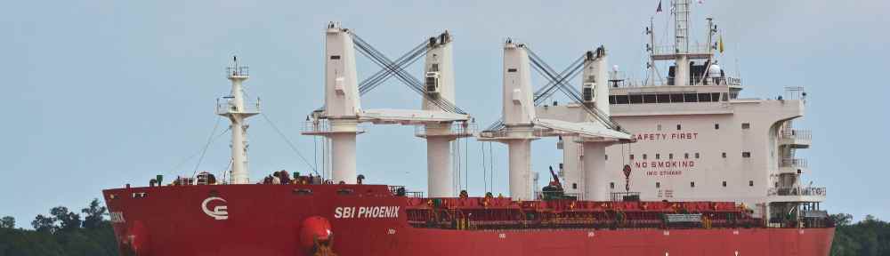In fully laden condition, deep in the water… Dolphin 64 Design by SDARI, picture of ultramax drybulk vessel MV ‘SBI Phoenix’ sailing upriver in the Mississippi River towards New Orleans, Louisiana. Image credit: Karatzas Images