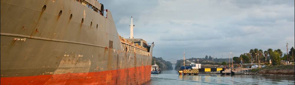 Having successfully crossed westbound the Corinth Canal (and having saved appr. twelve hours of sailing time), a small drybulk vessel originating from the Black Sea and destined for the Adriatic Sea, emerges on the west end (Poseidonia) of the Corinth Canal. Image credit: Karatzas Images