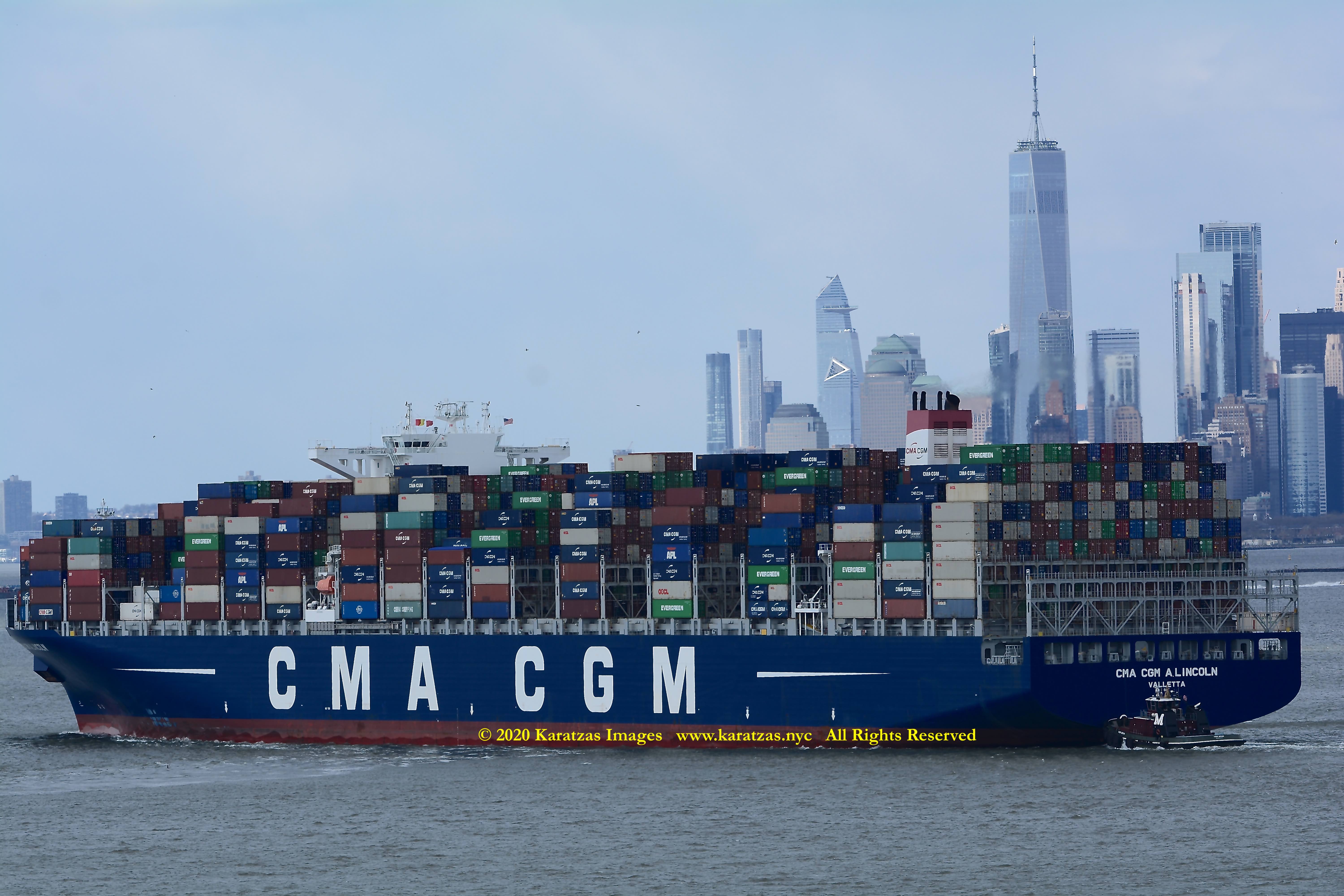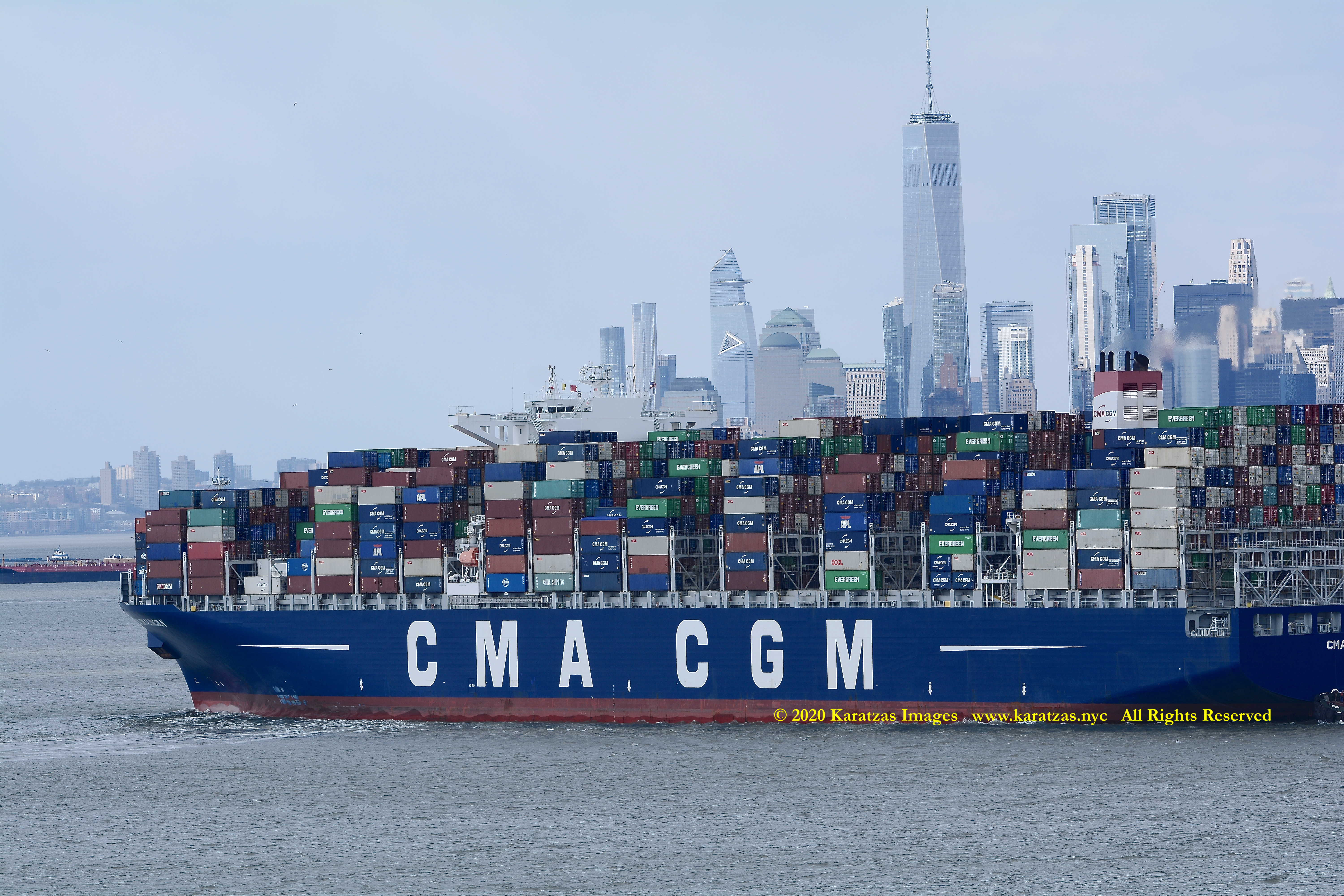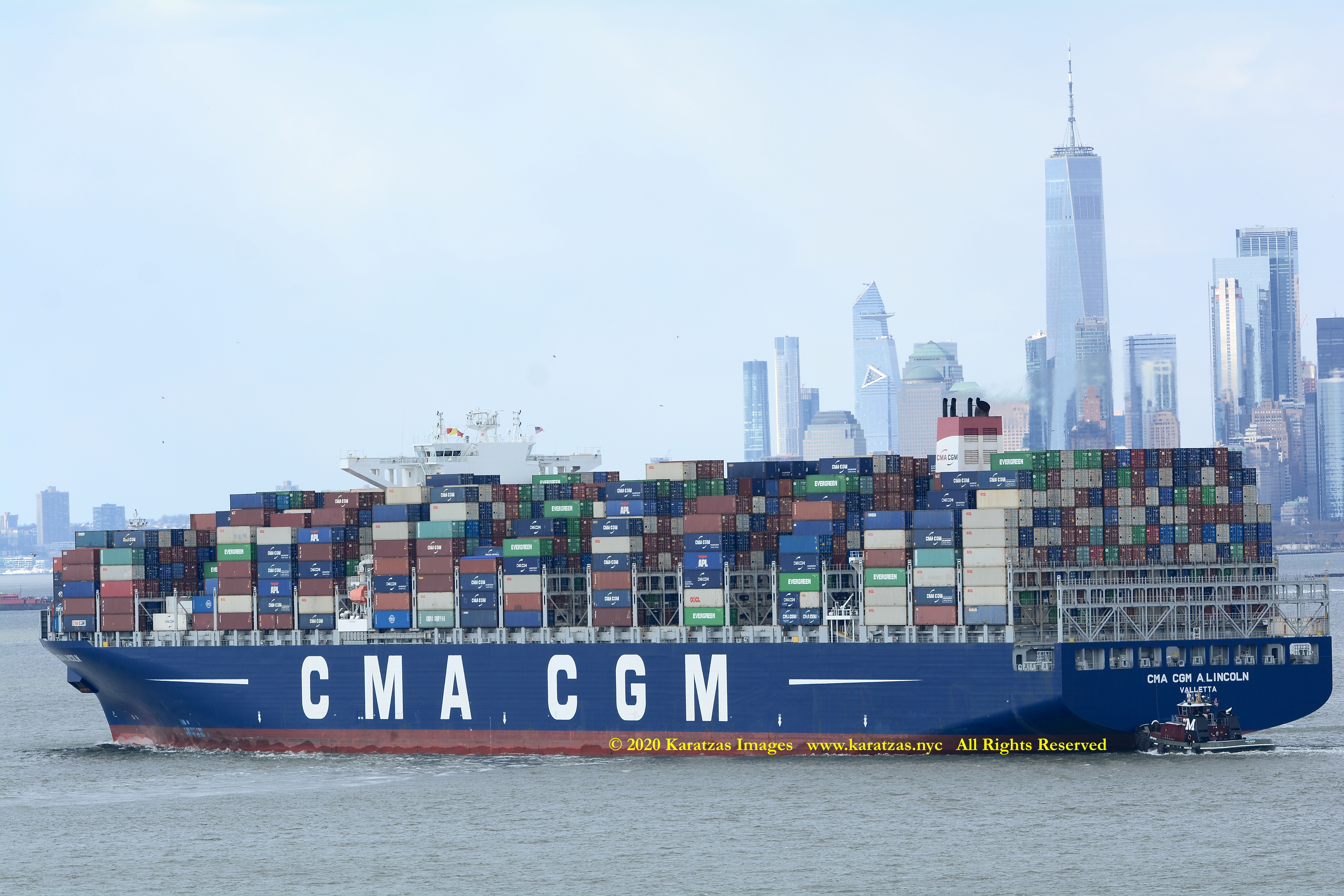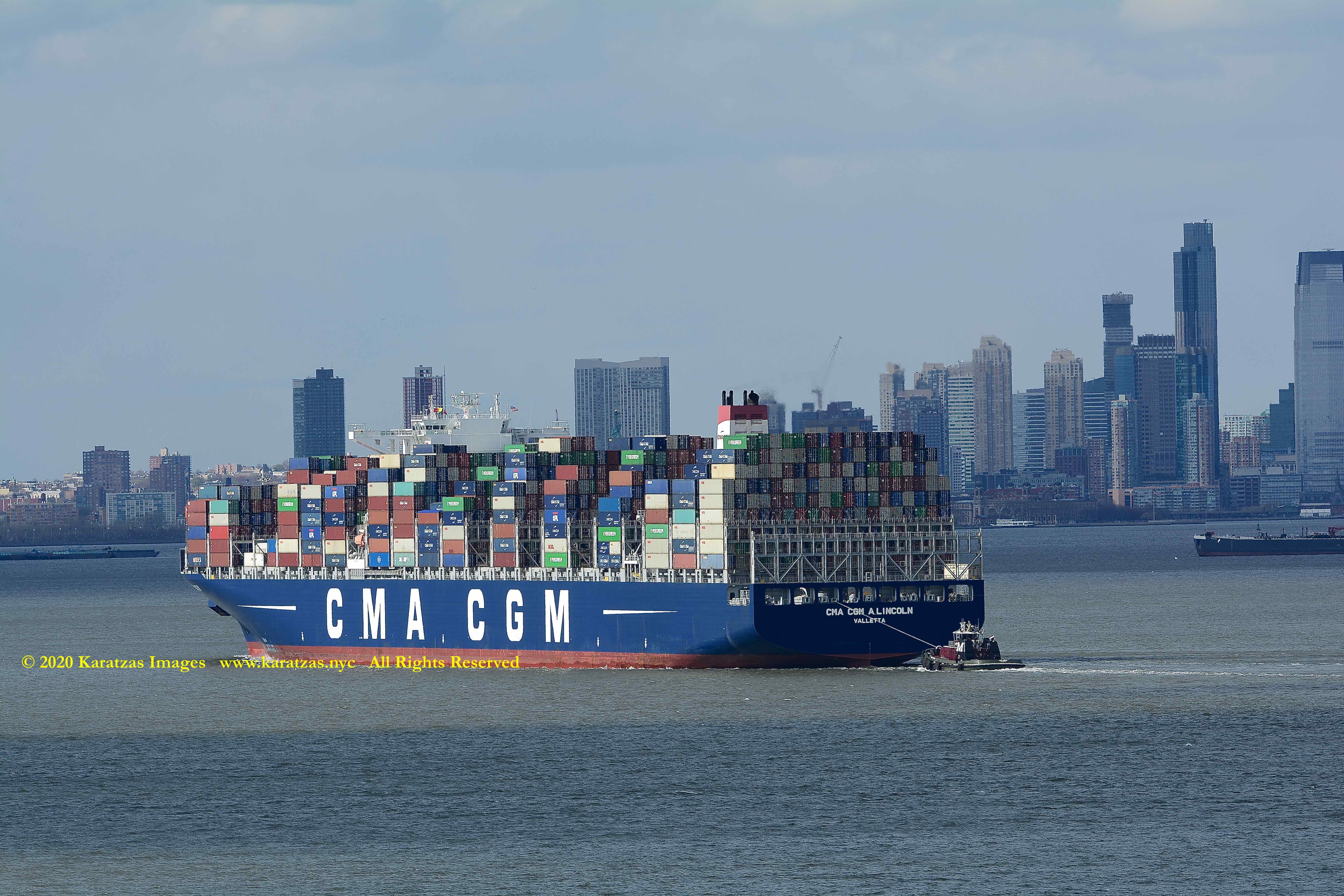 Image of neo-panamax containership MV ‘CMA CGM A Lincoln’ (14,000-teu, 2017, Hyundai Heavy) seen in Upper New York Harbor.. Image credit: Karatzas Images