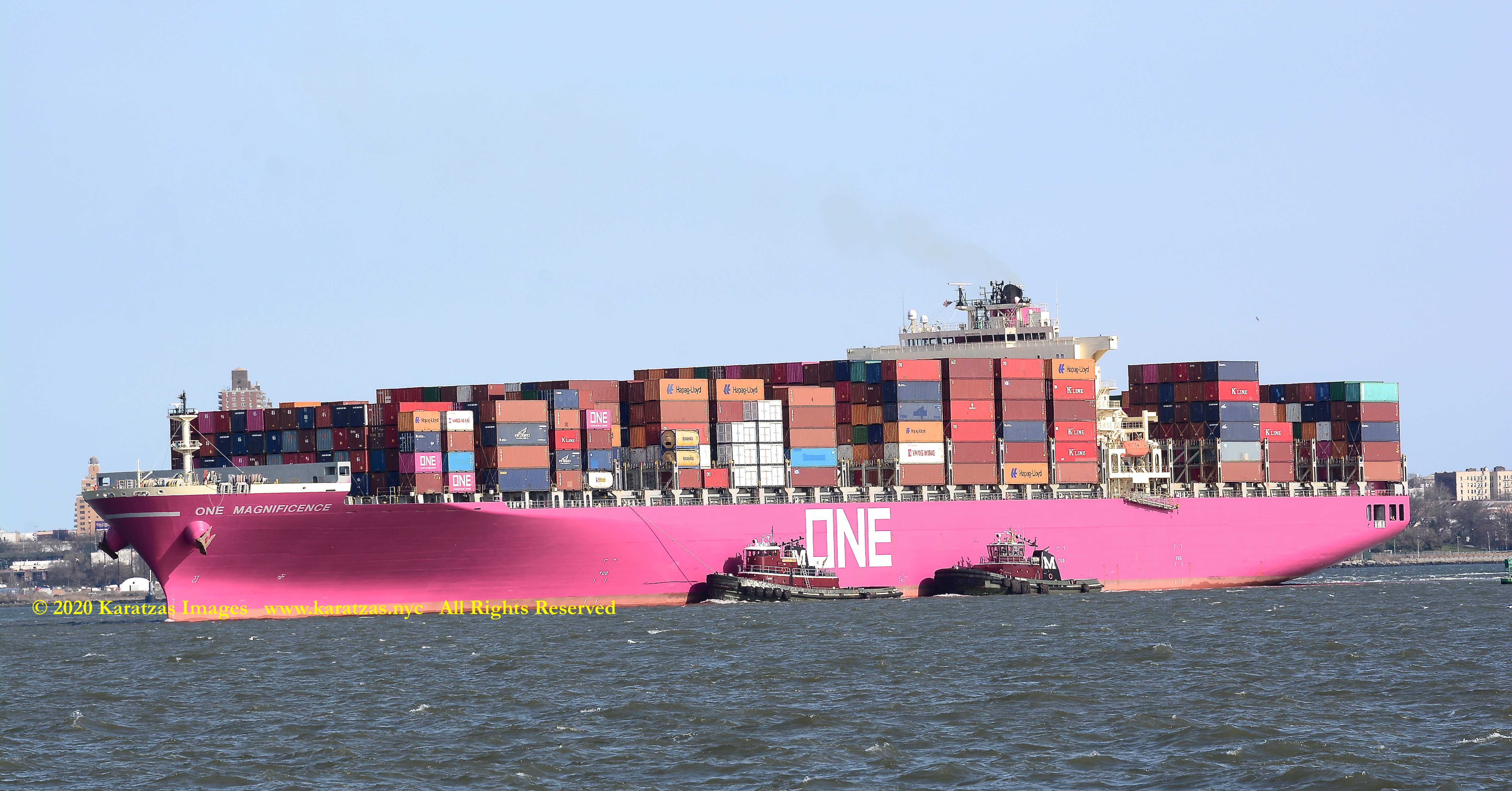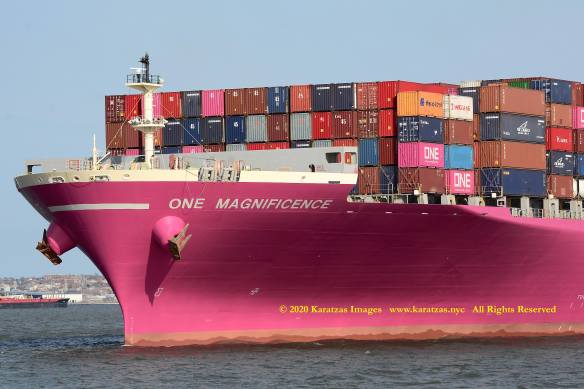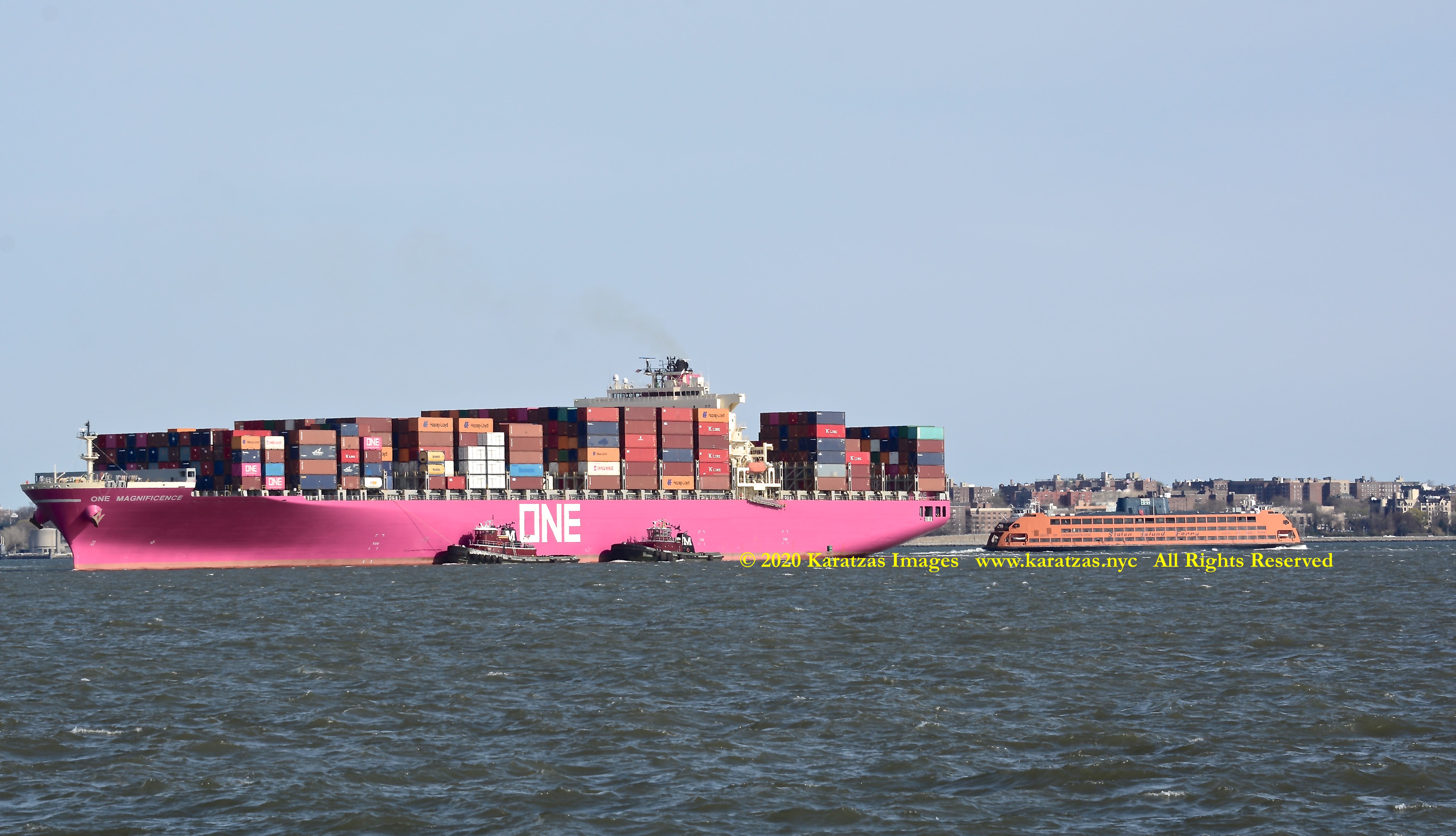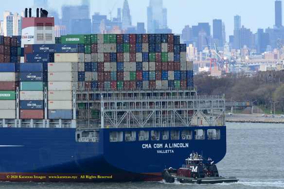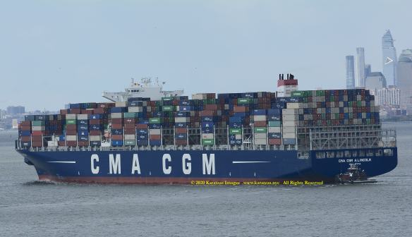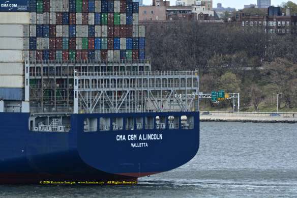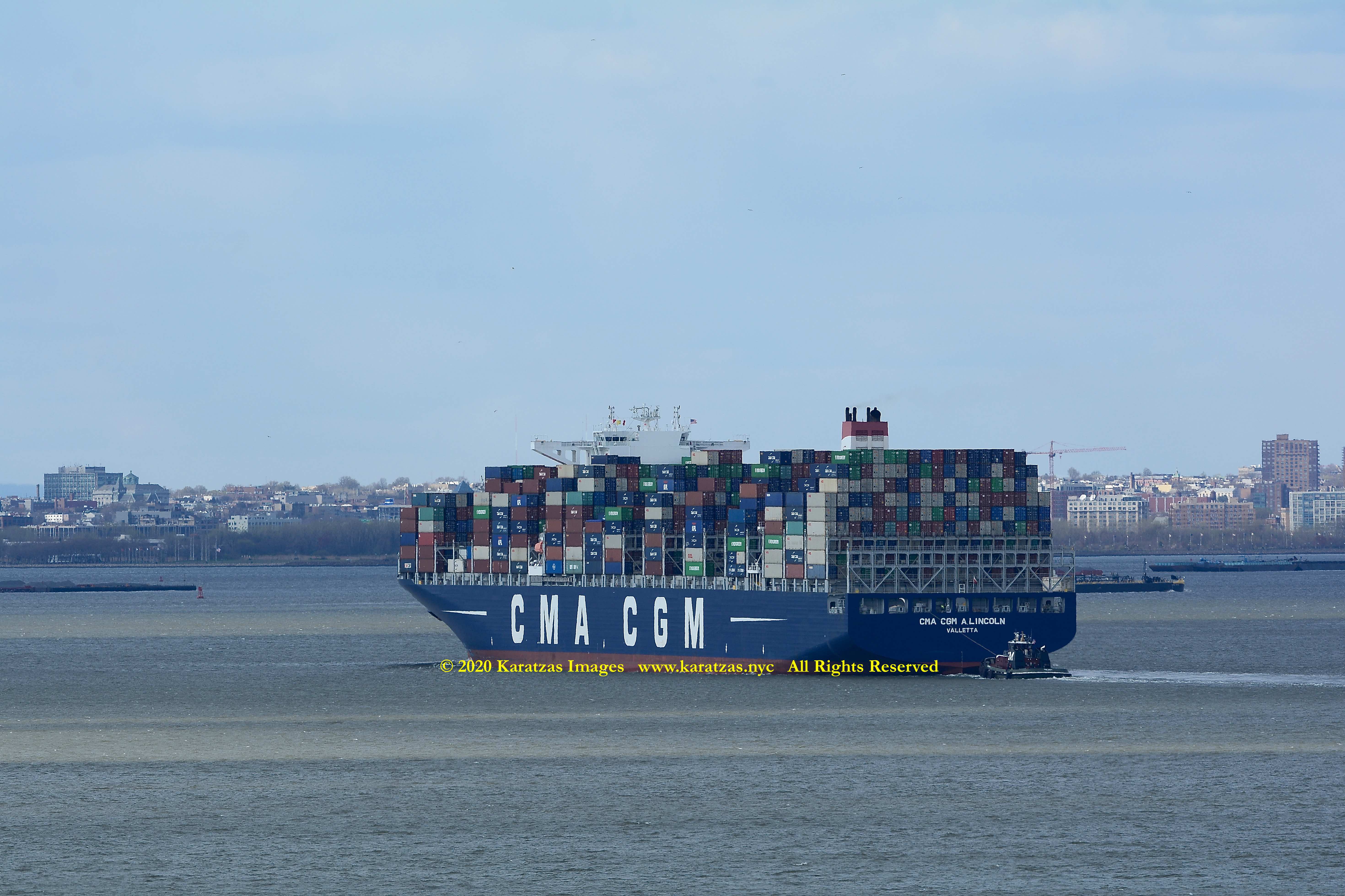 Image of neo-panamax containership MV ‘CMA CGM A Lincoln’ (14,000-teu, 2017, Hyundai Heavy) seen in Upper New York Harbor.. Image credit: Karatzas Images
