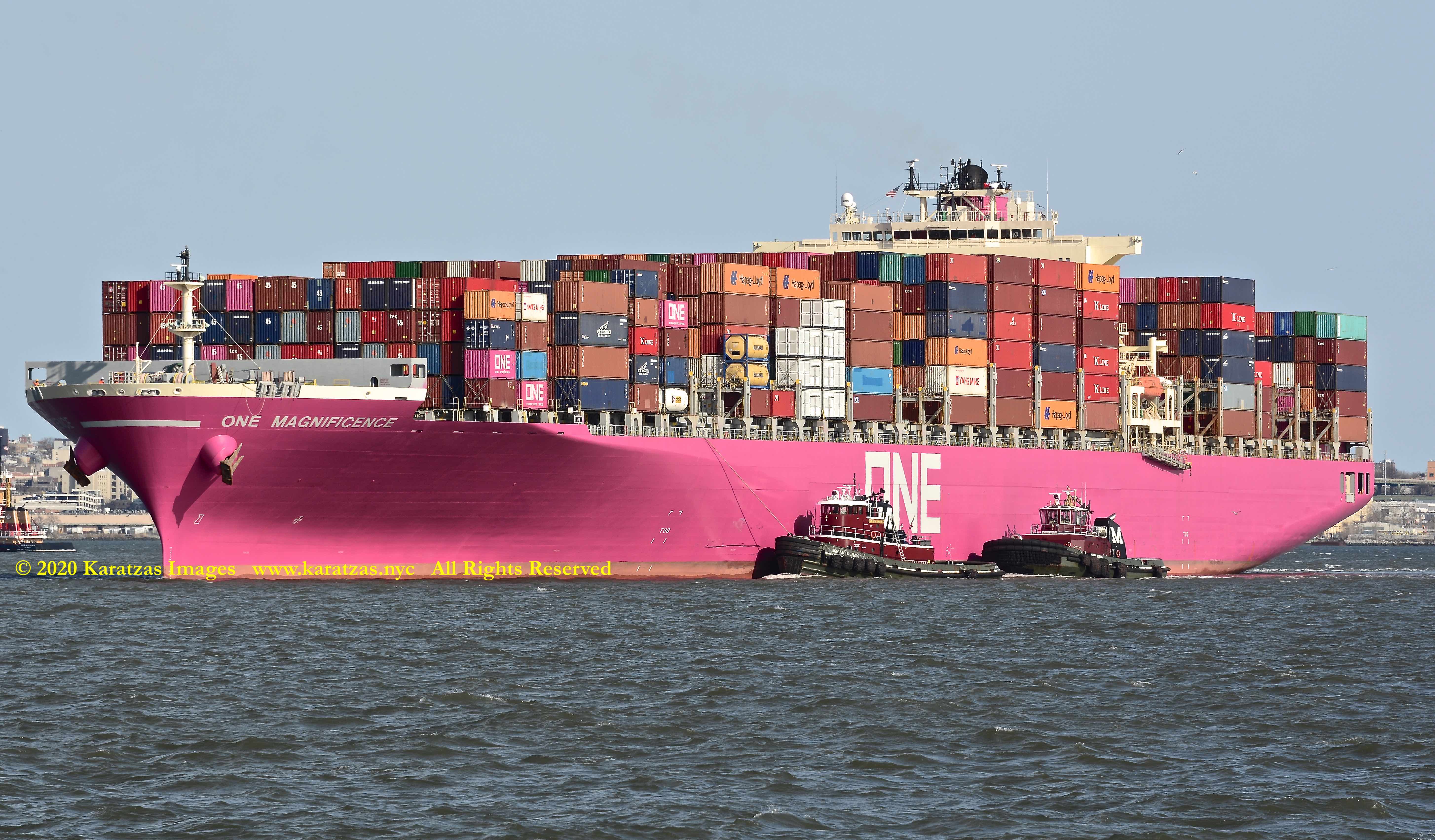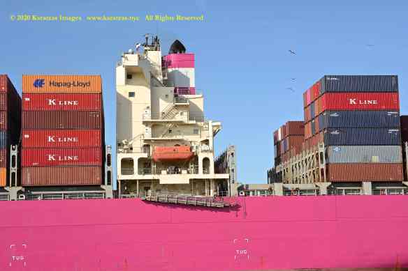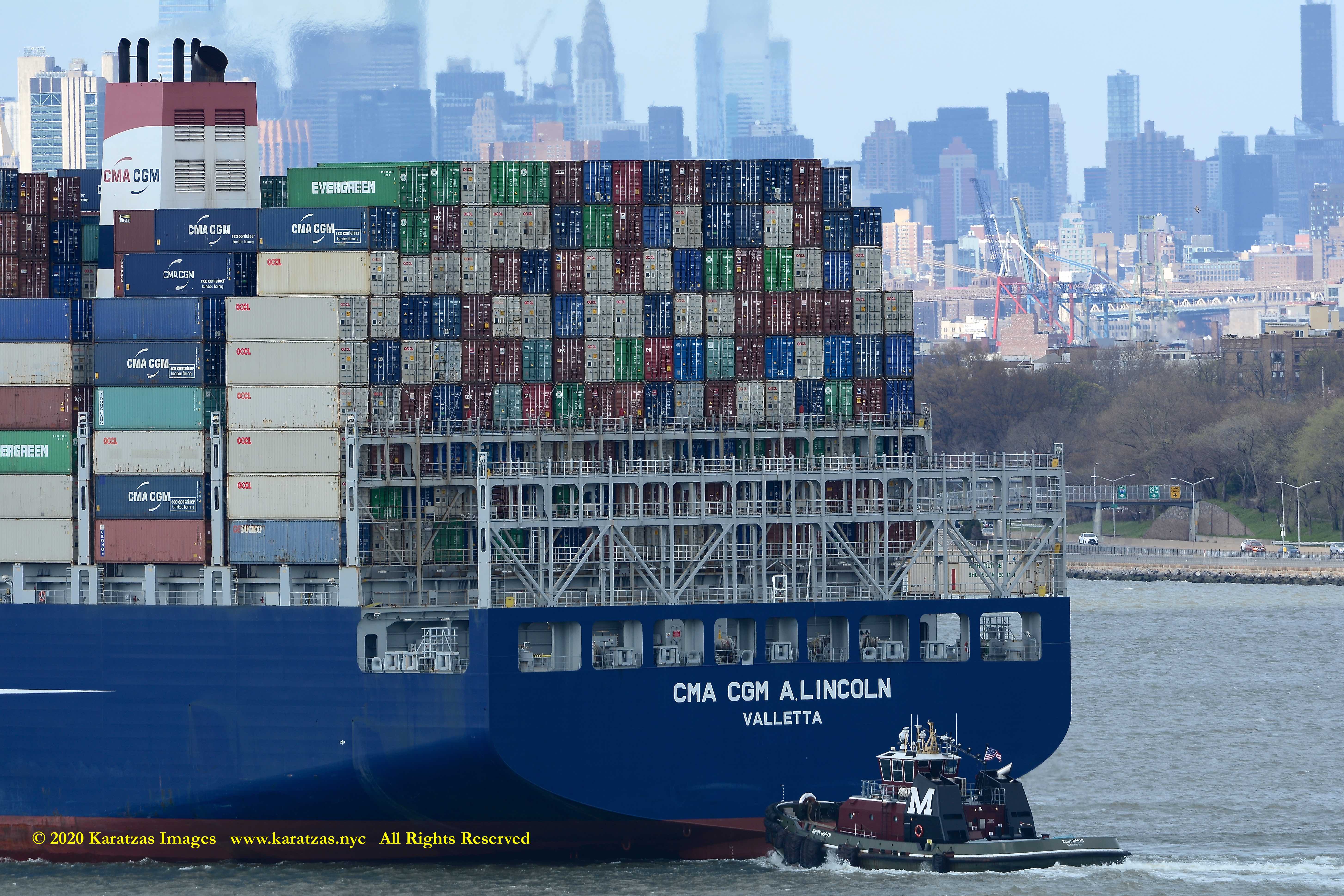 Image of neo-panamax containership MV ‘CMA CGM A Lincoln’ (14,000-teu, 2017, Hyundai Heavy) seen in Upper New York Harbor. Stern detail and Moran harbor tug. Image credit: Karatzas Images