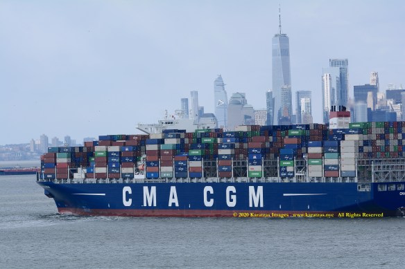 Image of neo-panamax containership MV ‘CMA CGM A Lincoln’ (14,000-teu, 2017, Hyundai Heavy) seen in Upper New York Harbor. Seen here against One World Trade Center and the Lower Manhattan skyline. Image credit: Karatzas Images