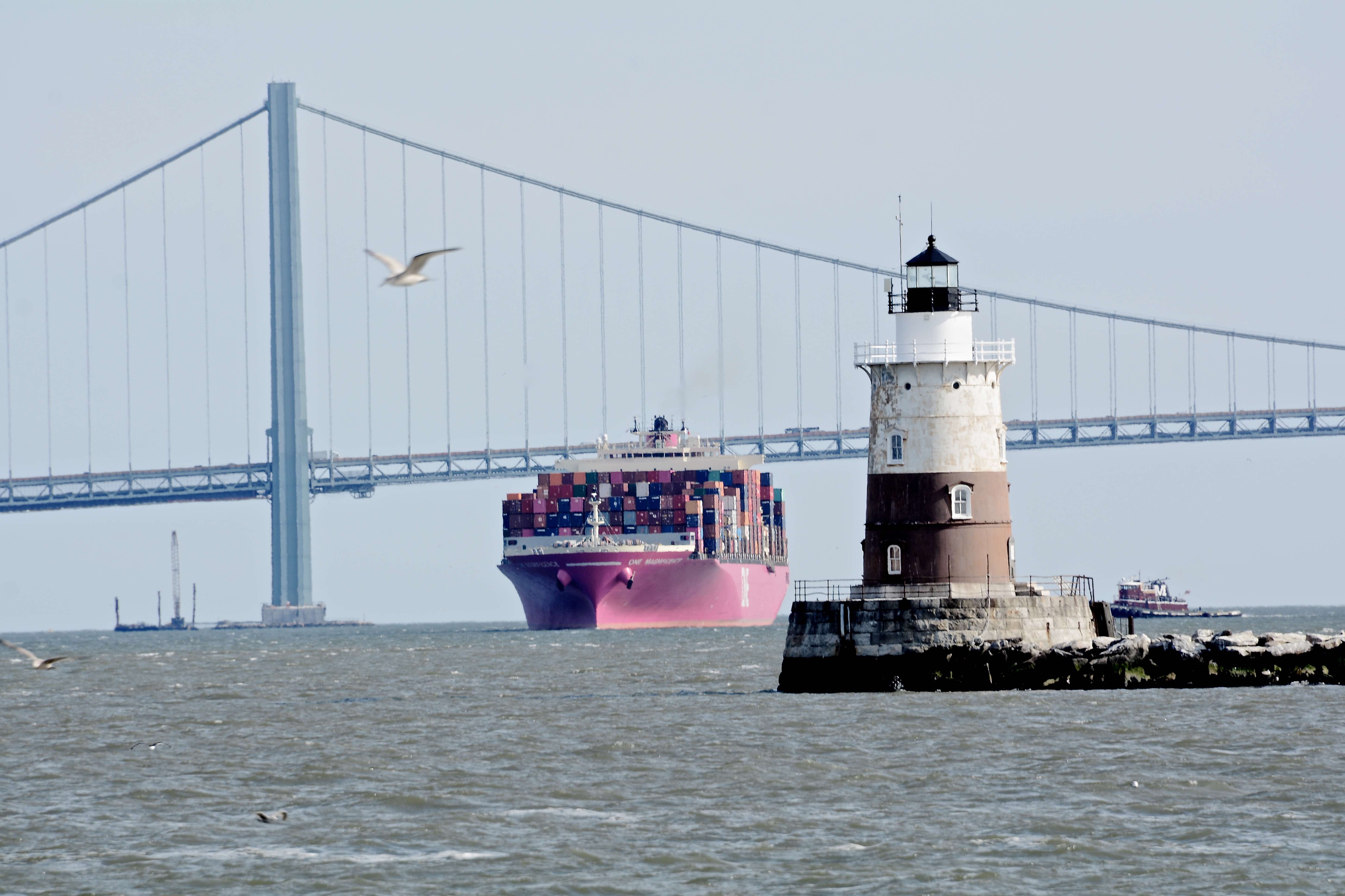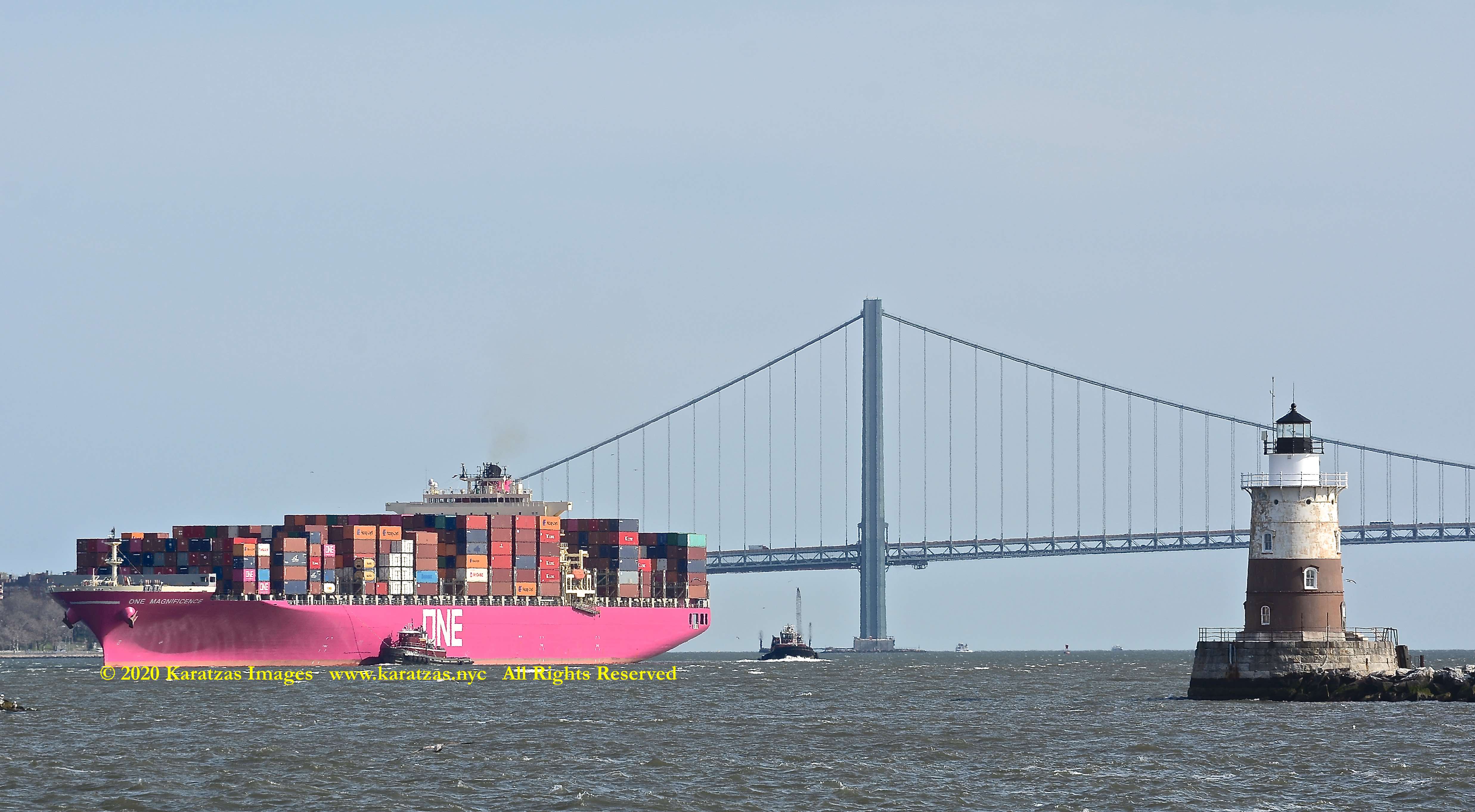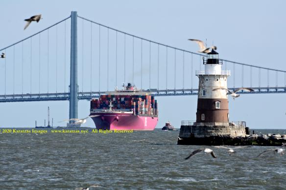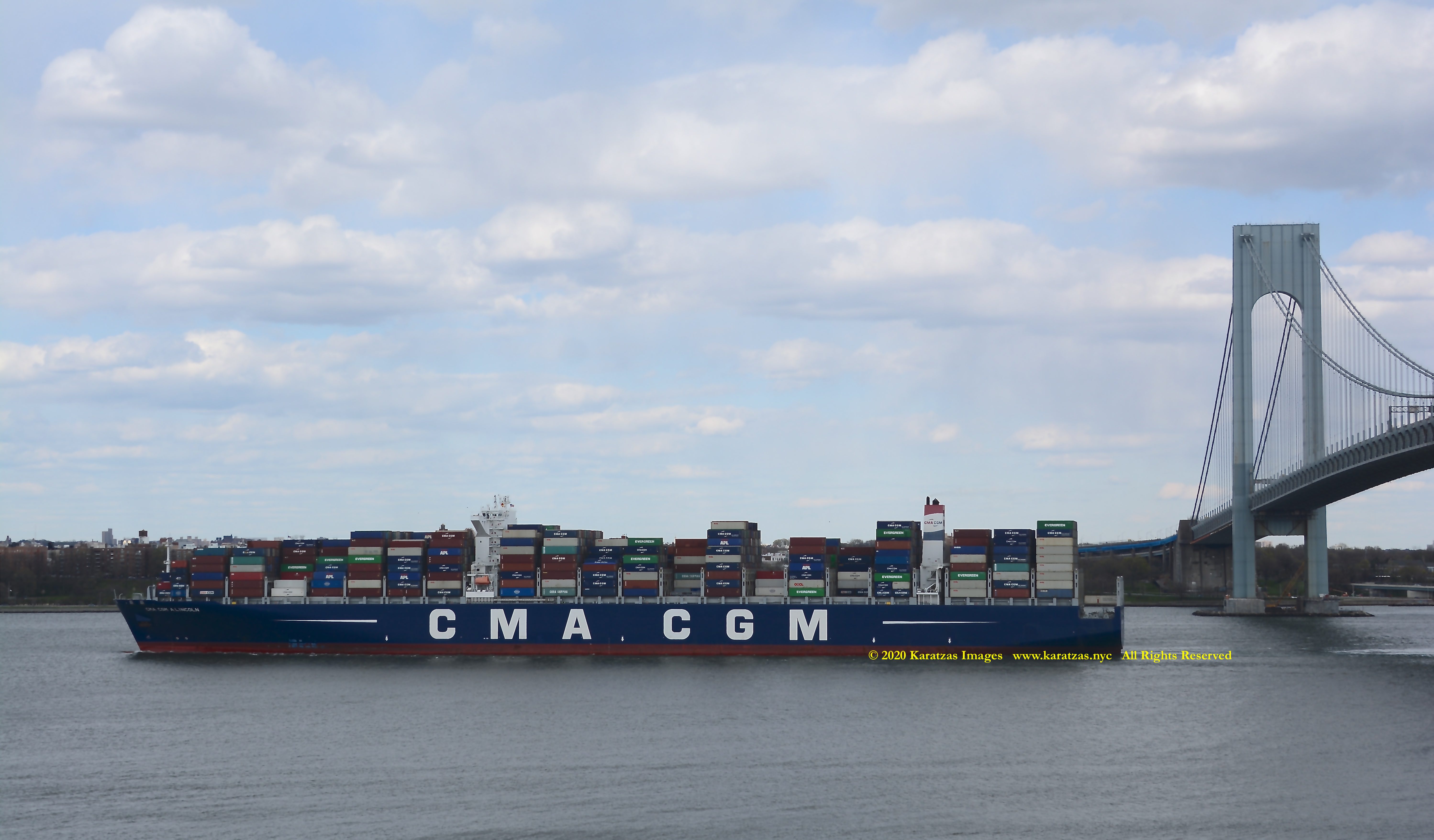 Image of neo-panamax containership MV ‘CMA CGM A Lincoln’ (14,000-teu, 2017, Hyundai Heavy) seen in Upper New York Harbor. Seen here by the Verrazzano-Narrows Bridge. Image credit: Karatzas Images