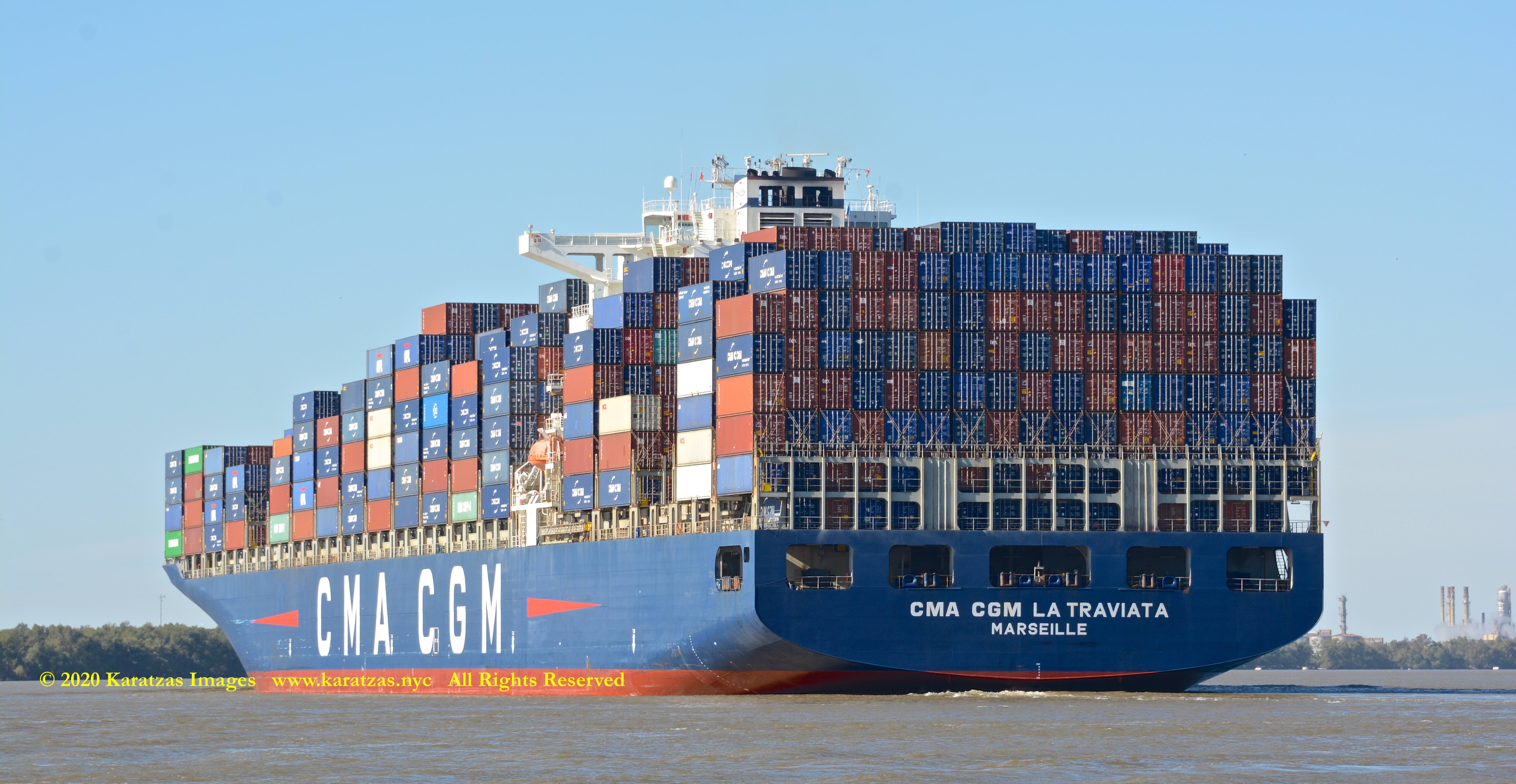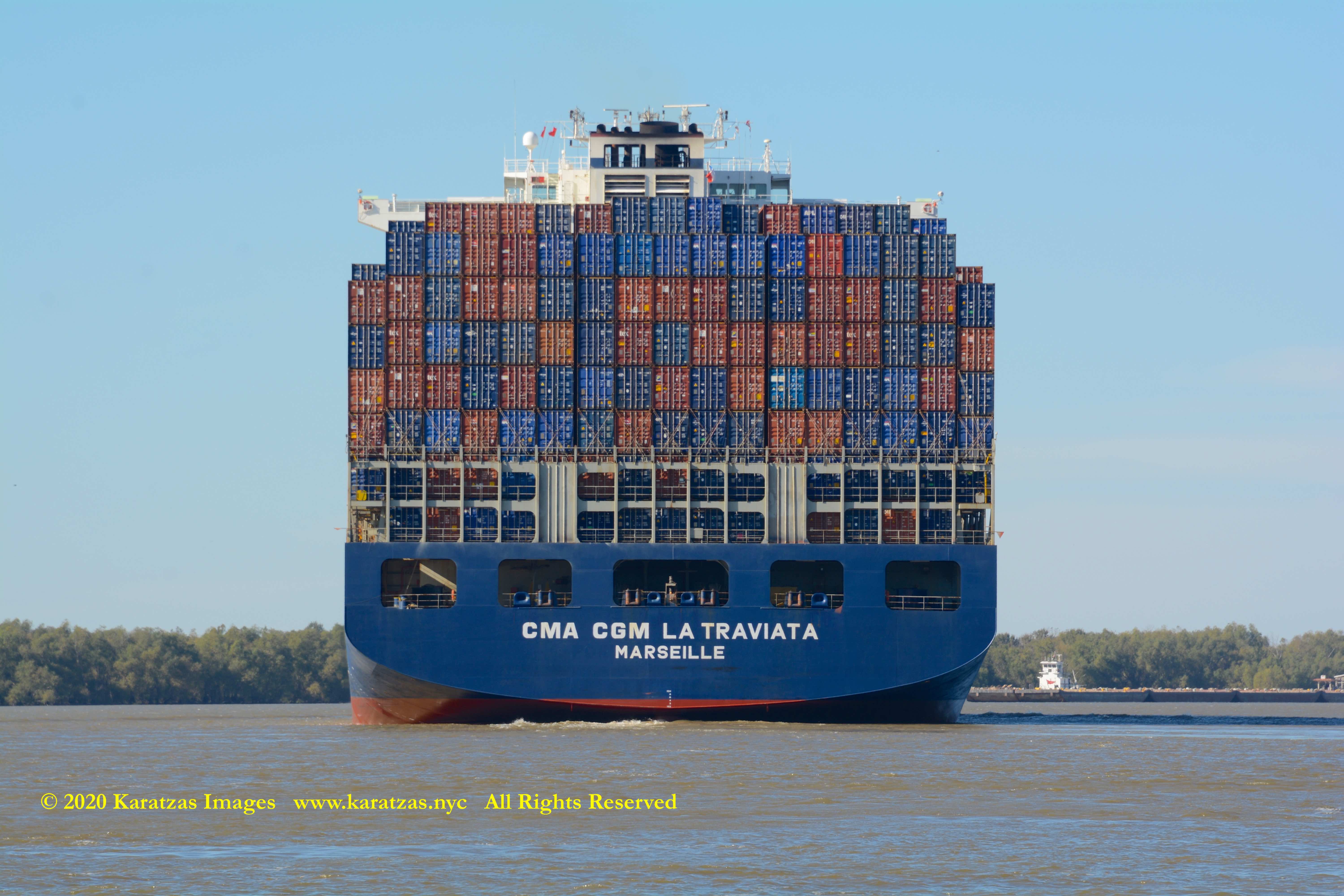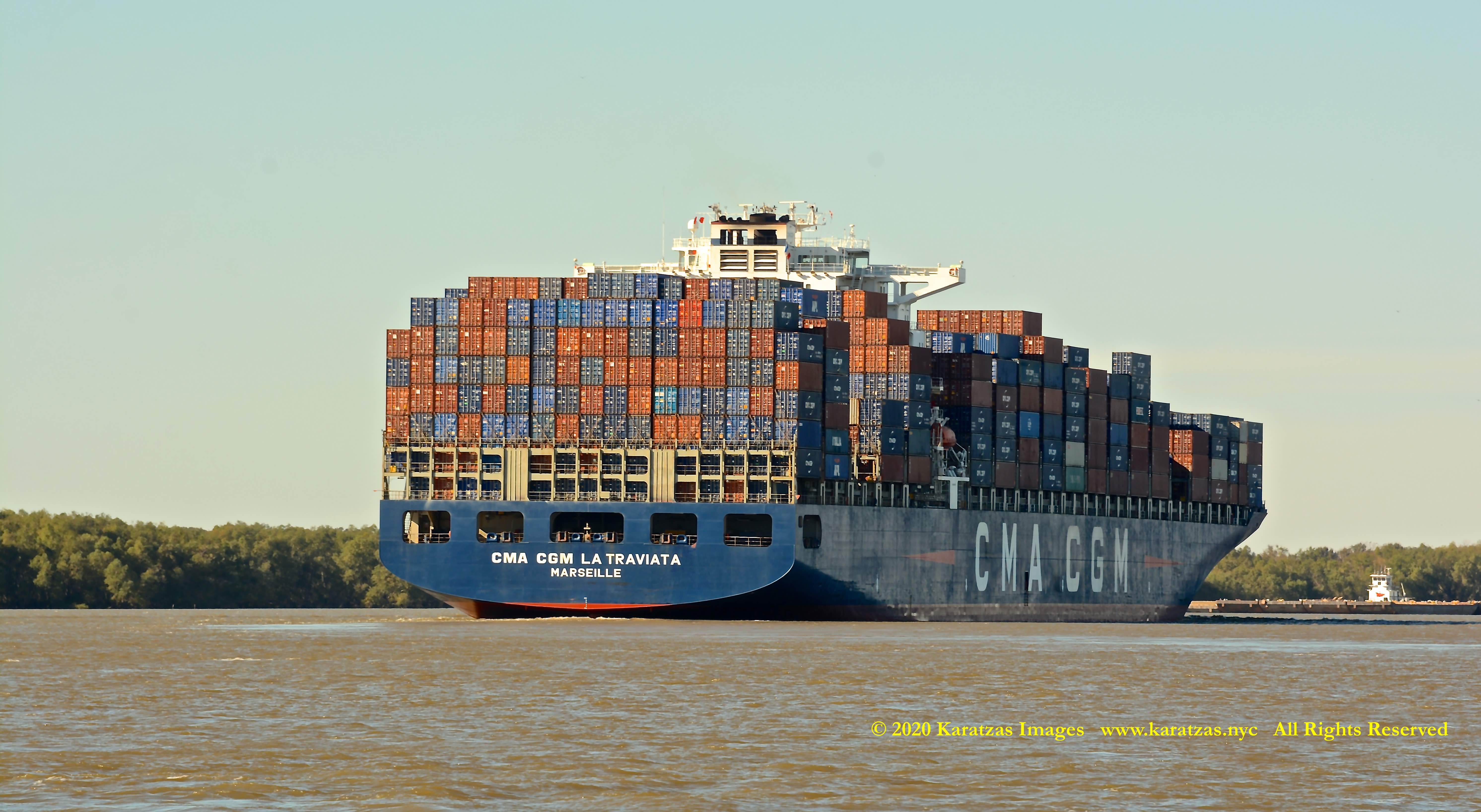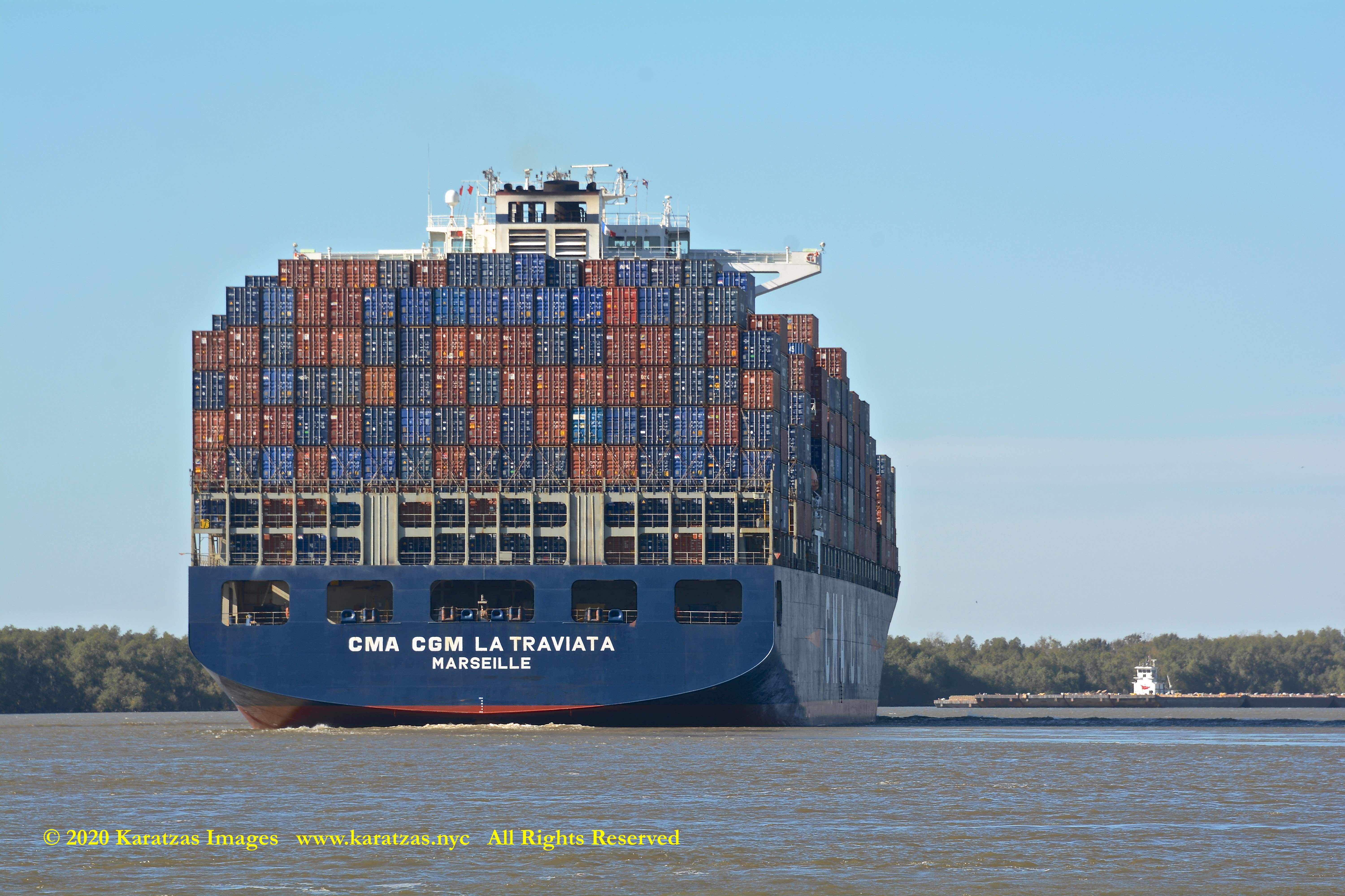 Homeported in Marseilles, France, neo-panamax containership MV ‘CMA CGM La Traviata’ sailing upstream in the Mississippi River in fall 2019, en route to New Orleans. Built in 2006 at Hyundai Heavy Industries (Samho). Image credit: Karatzas Images