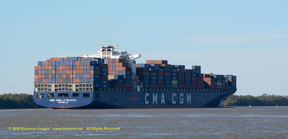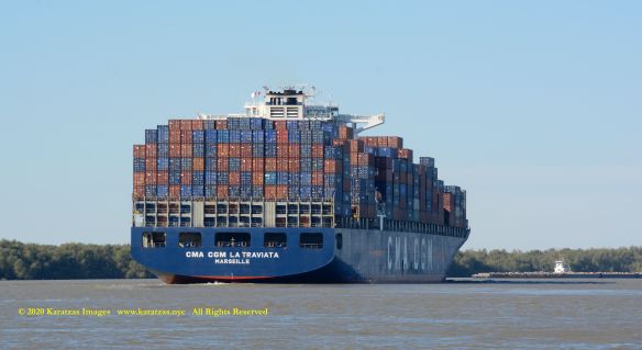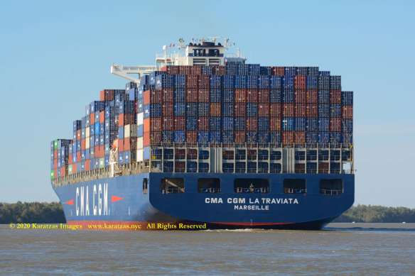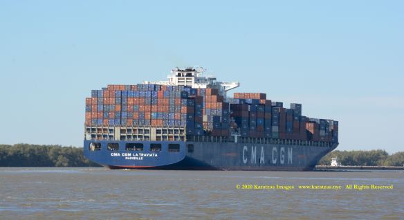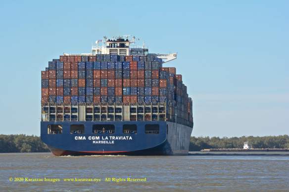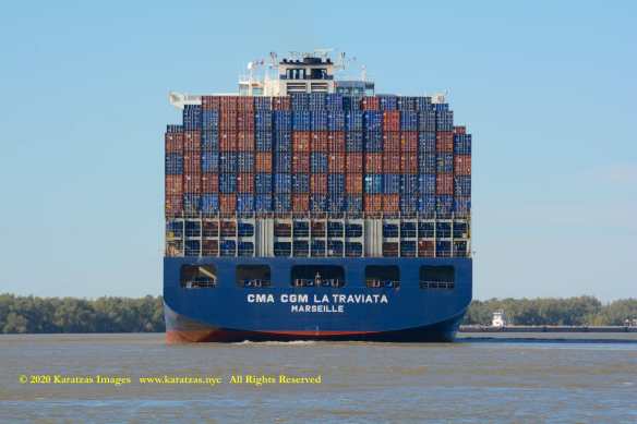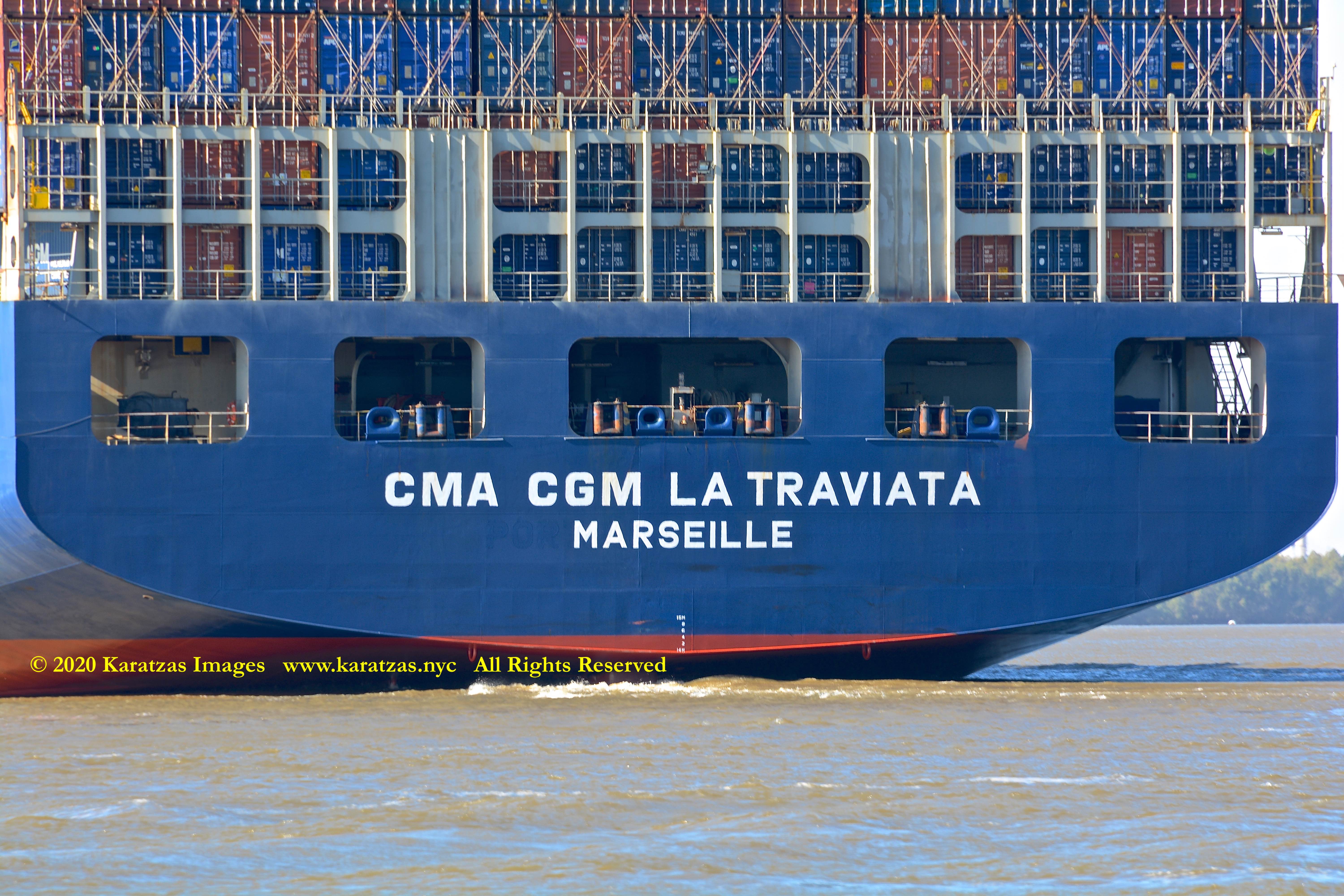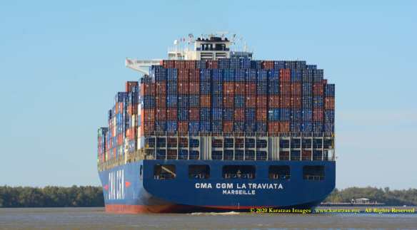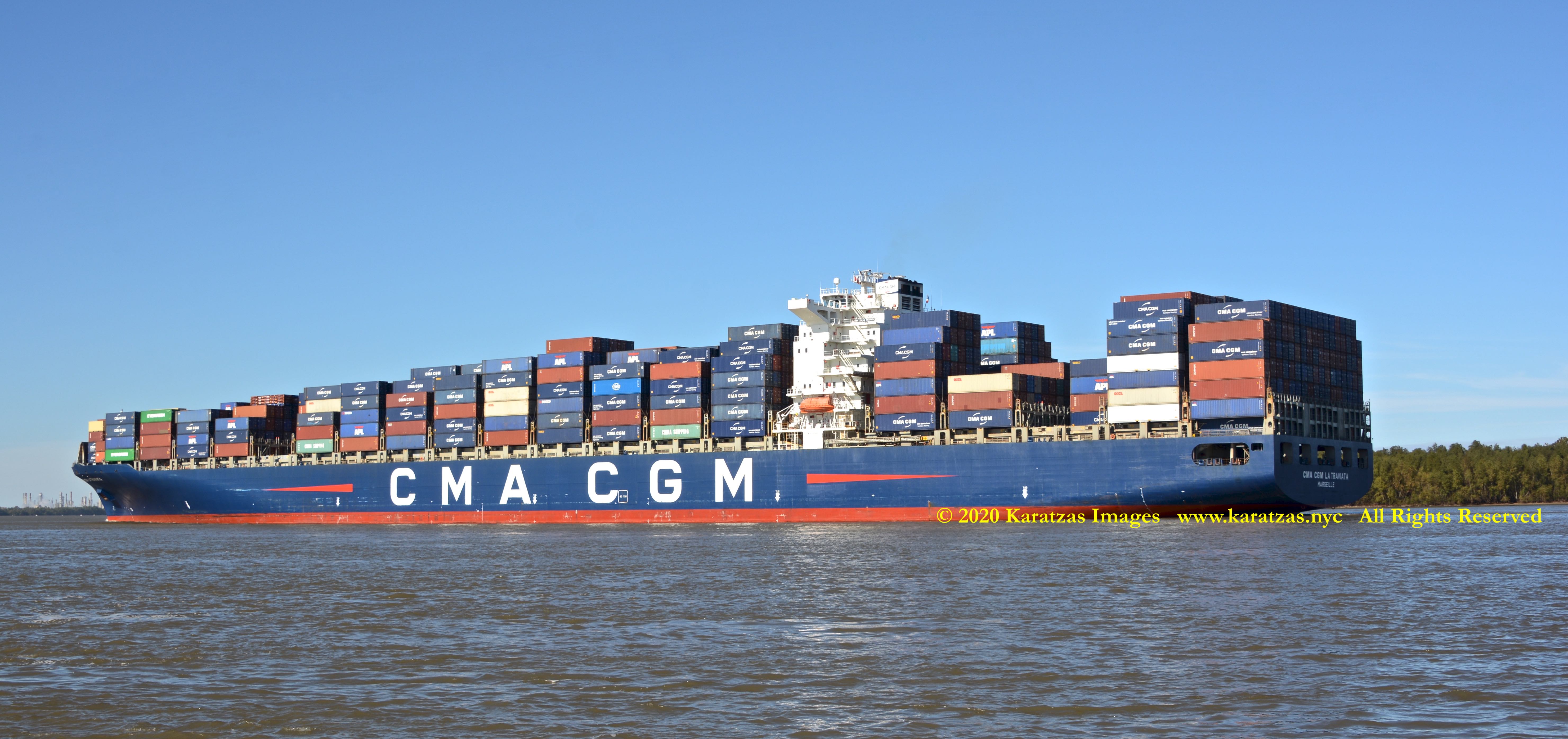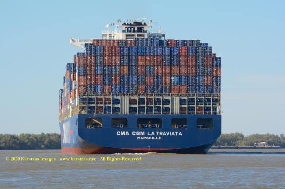 Homeported in Marseilles, France, neo-panamax containership MV ‘CMA CGM La Traviata’ sailing upstream in the Mississippi River in fall 2019, en route to New Orleans. Built in 2006 at Hyundai Heavy Industries (Samho). Image credit: Karatzas Images