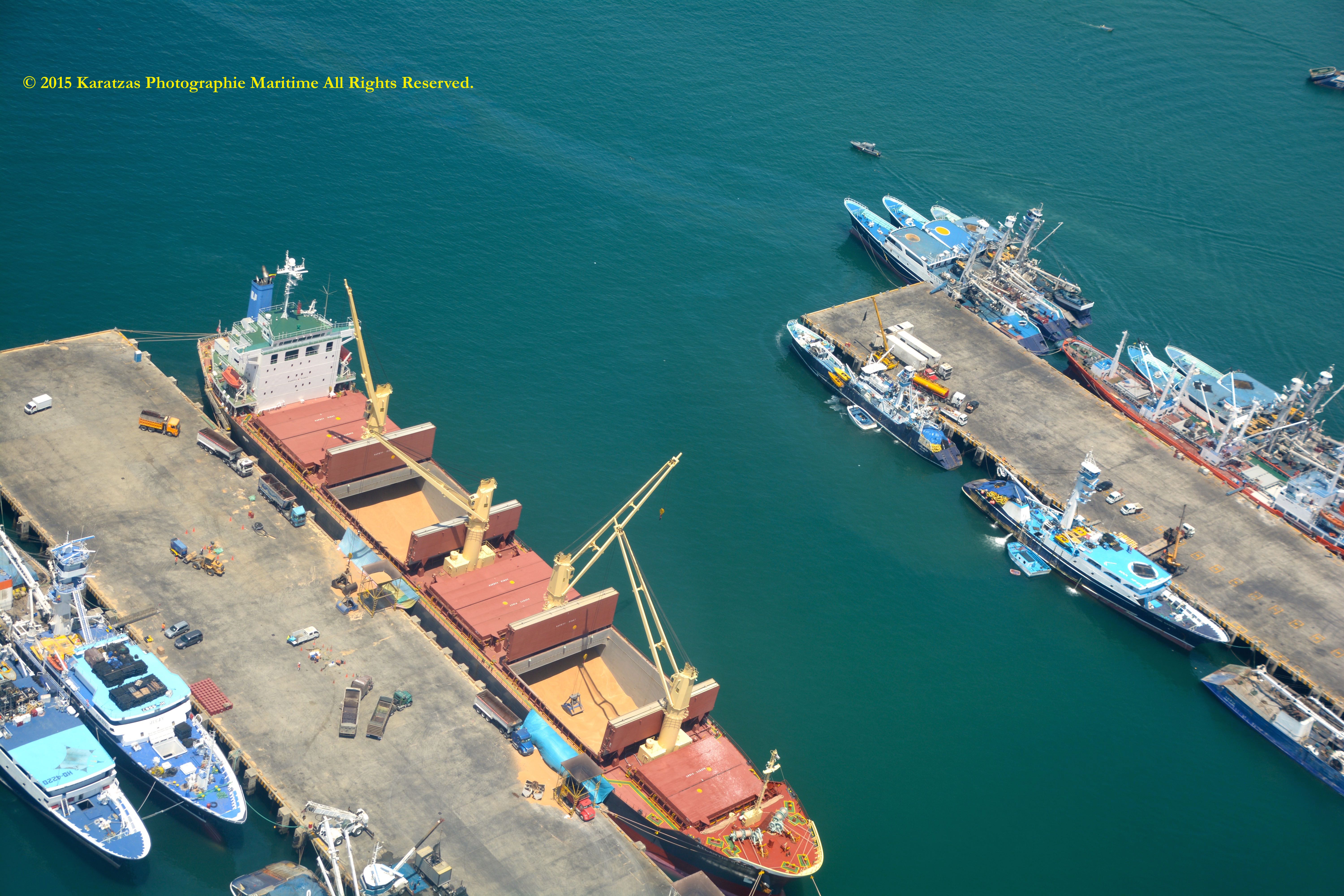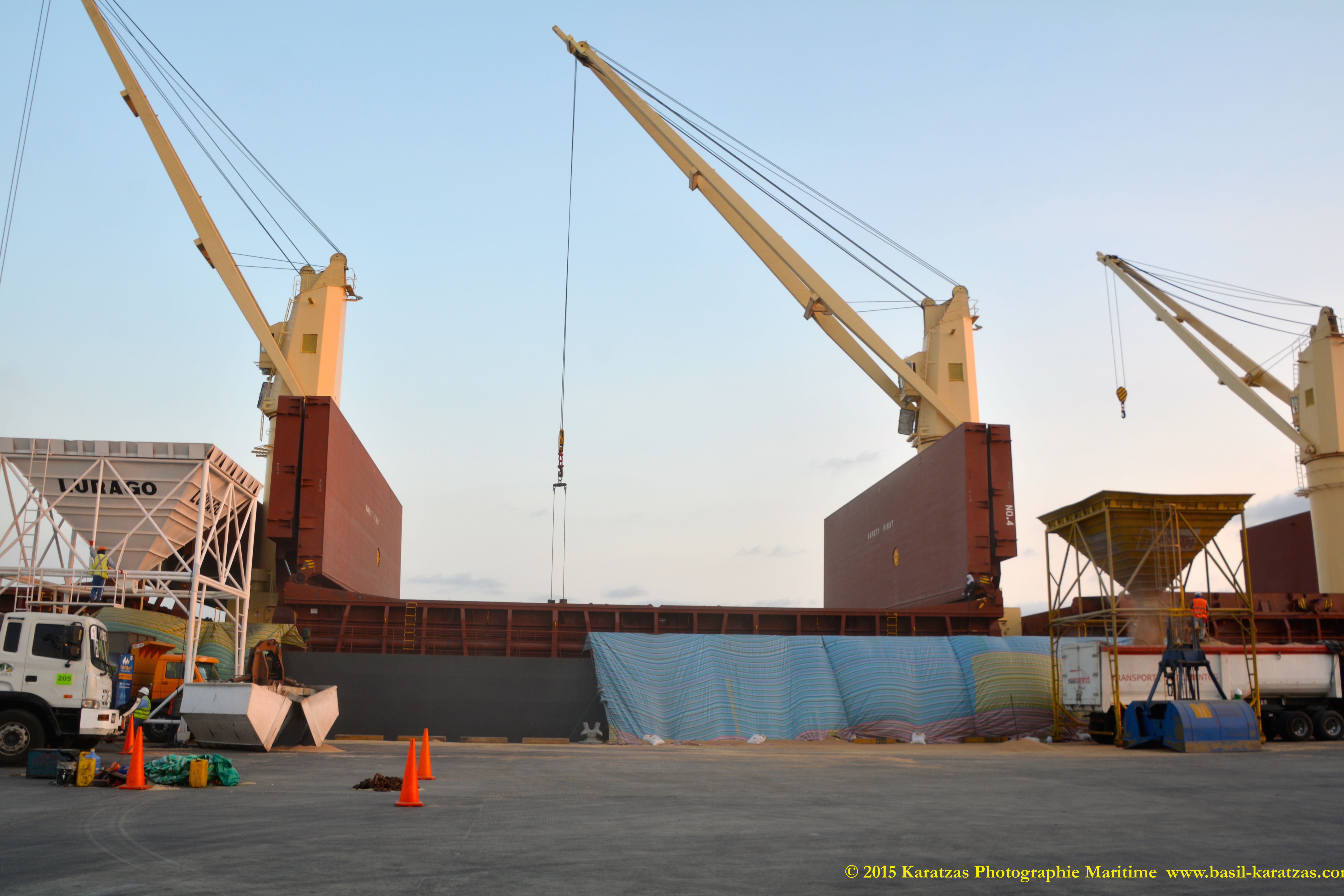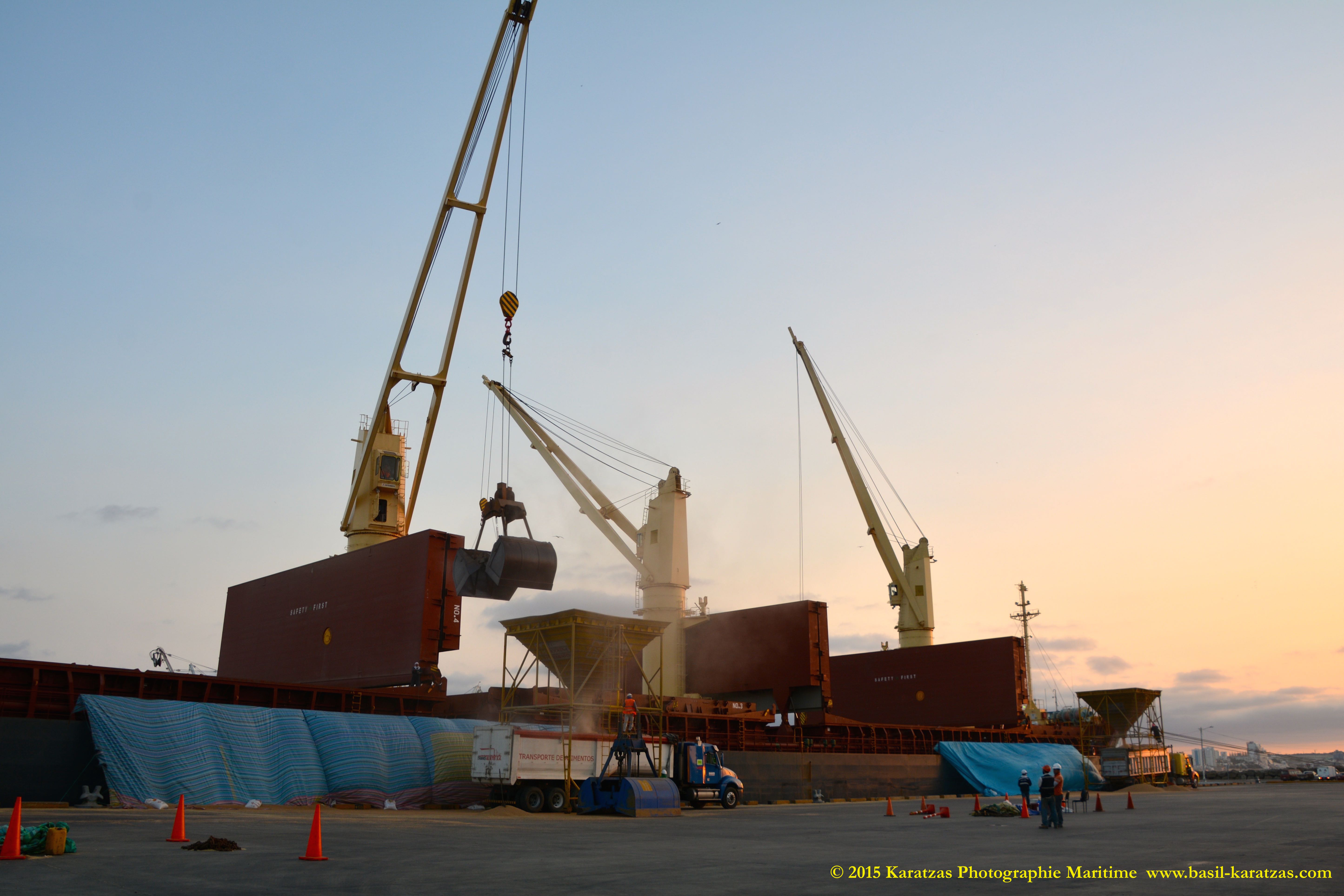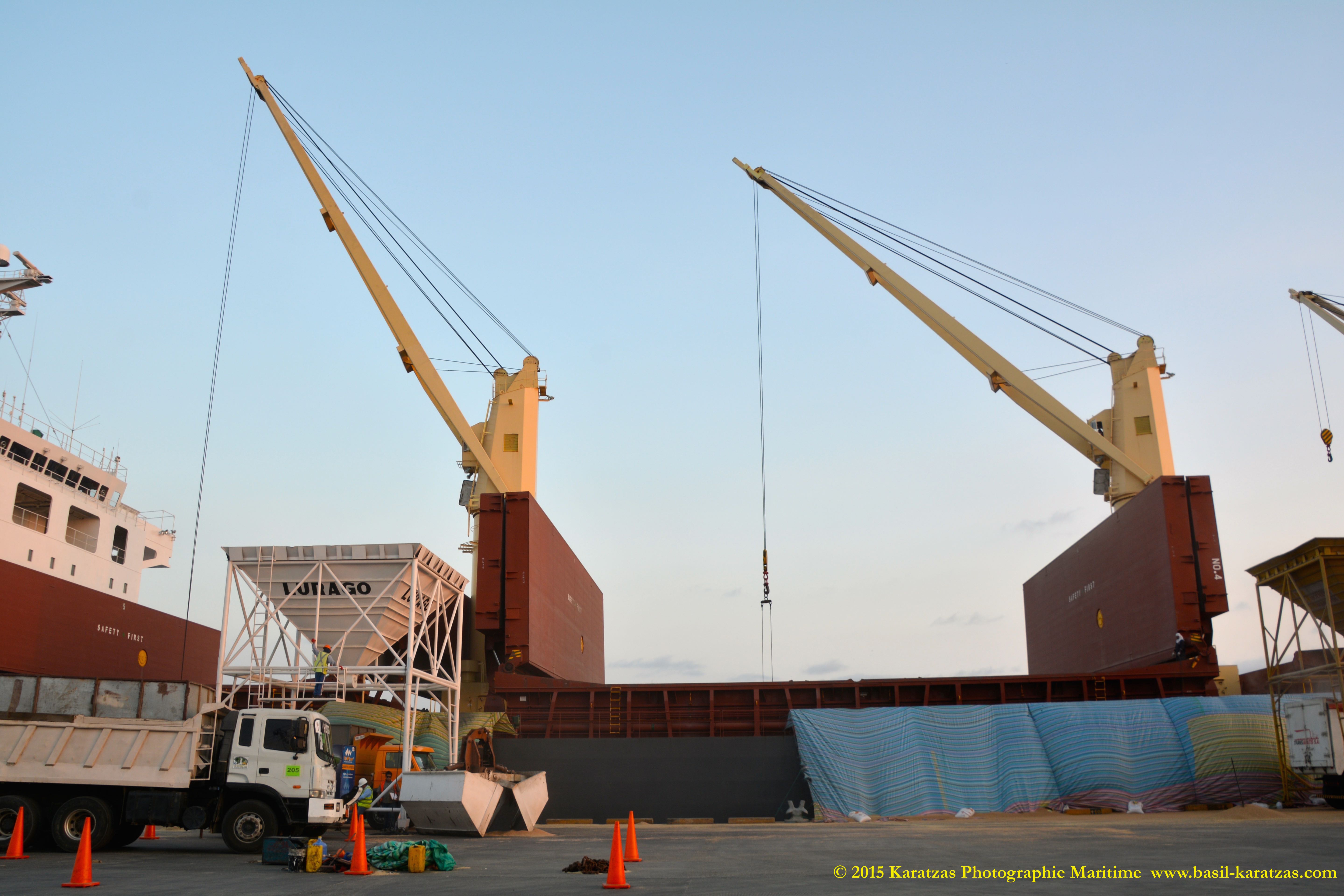 CARGO HANDLING DETAILS: Grain Capacity of 49,000 cu.m., 5 Holds, 5 Hatches. 4 x Crane – MacGregor (Centreline) SWL 36 tons at 26m. (twin mode) (grab fitted), 1 x Crane, Provision – (Stbd. Aft) SWL 3 tons.