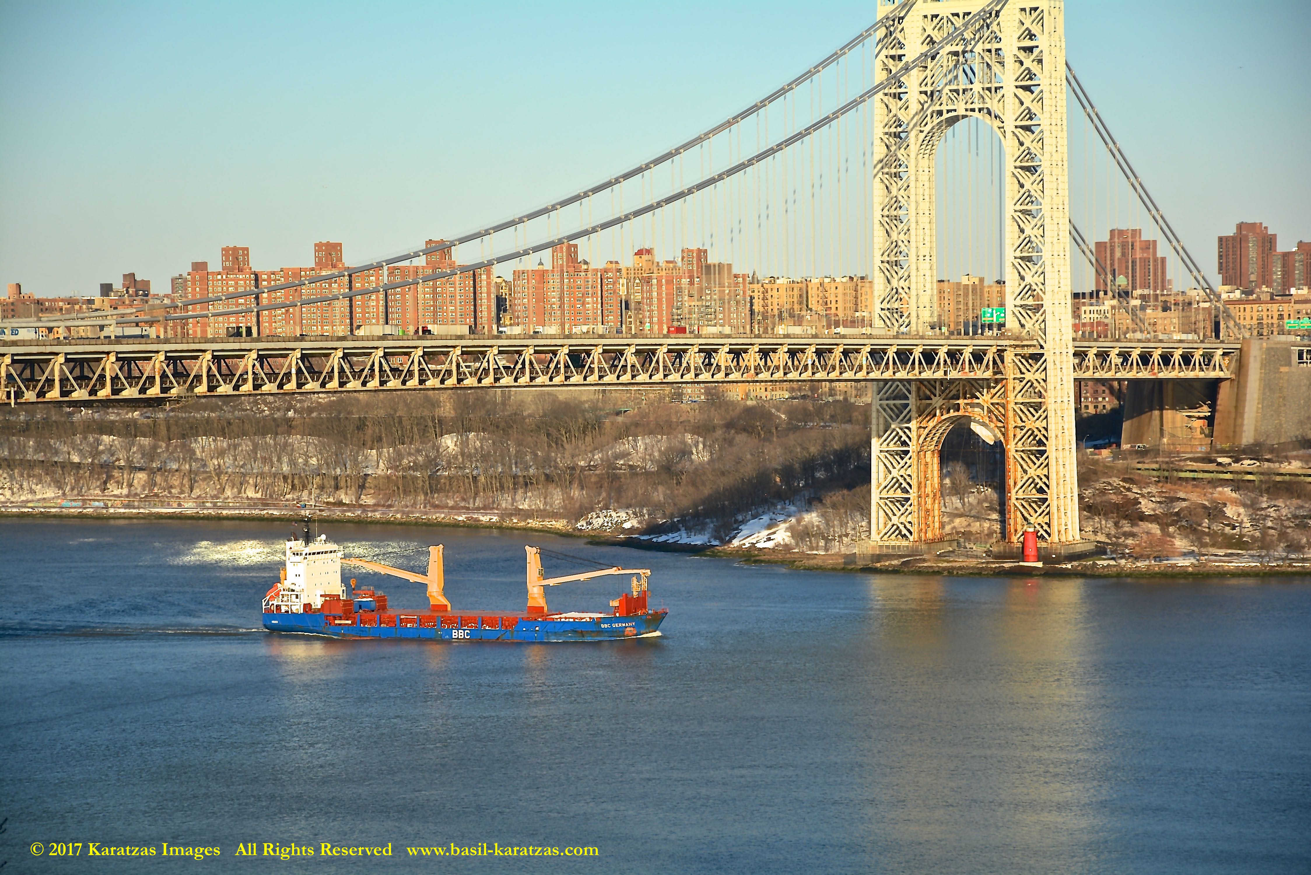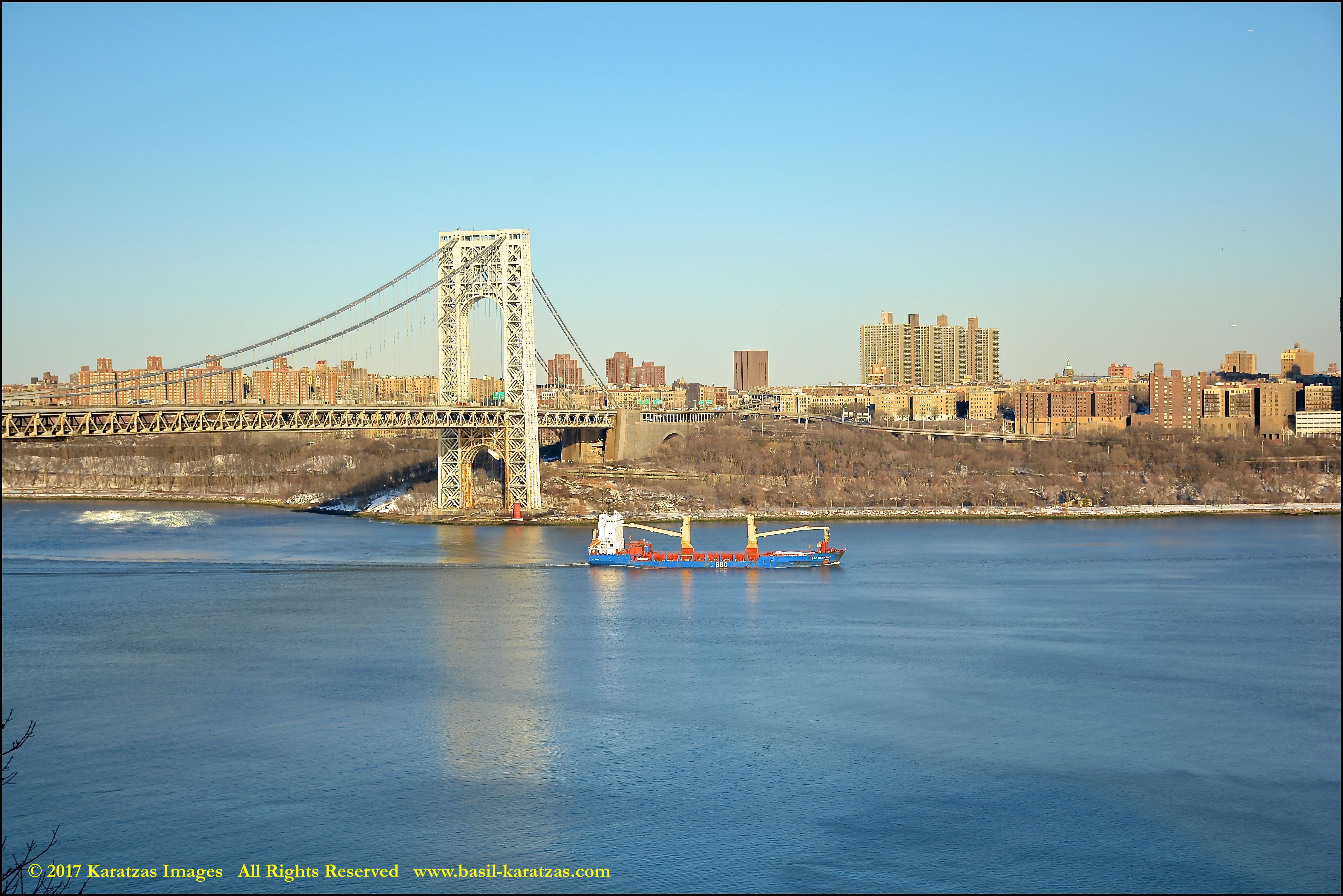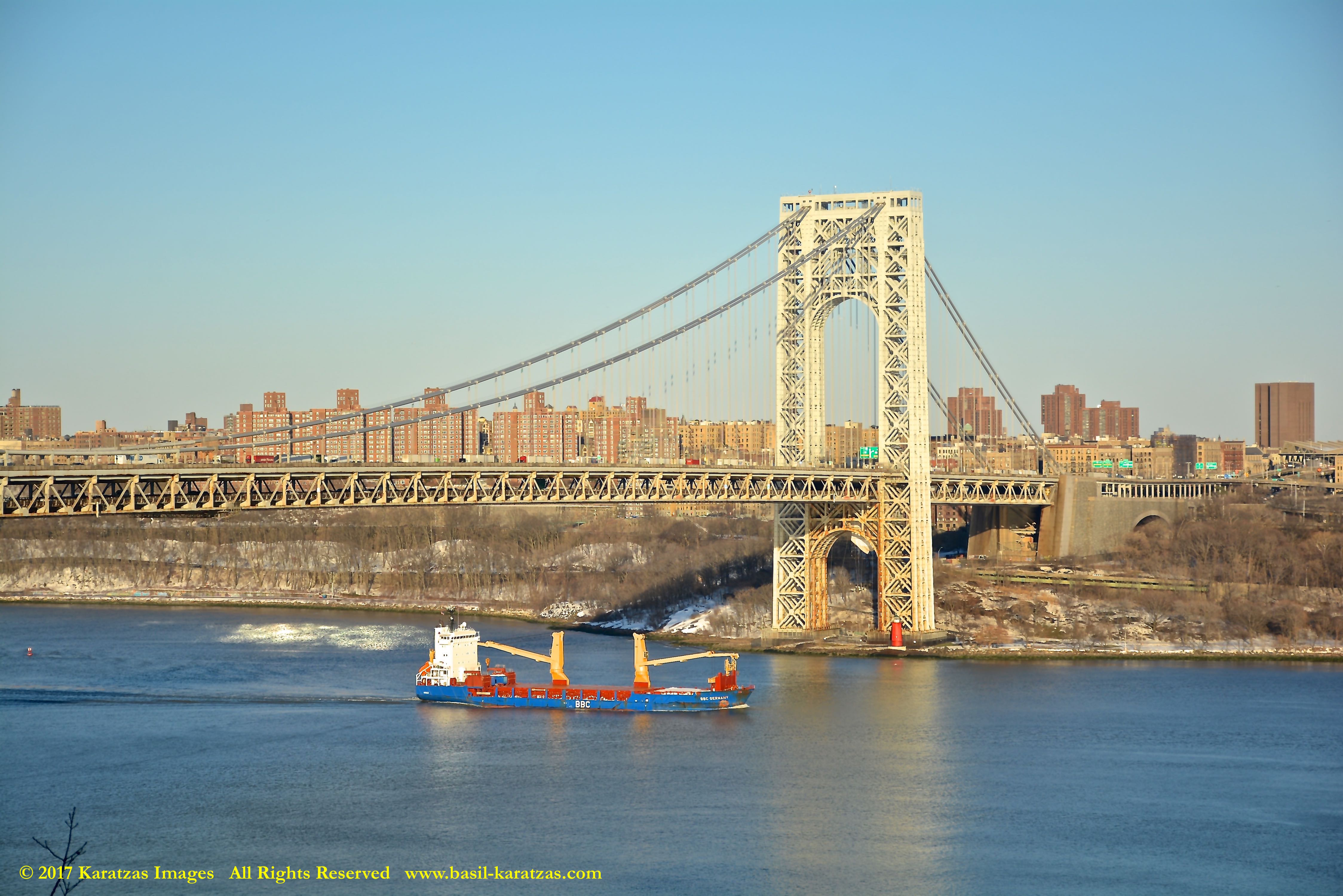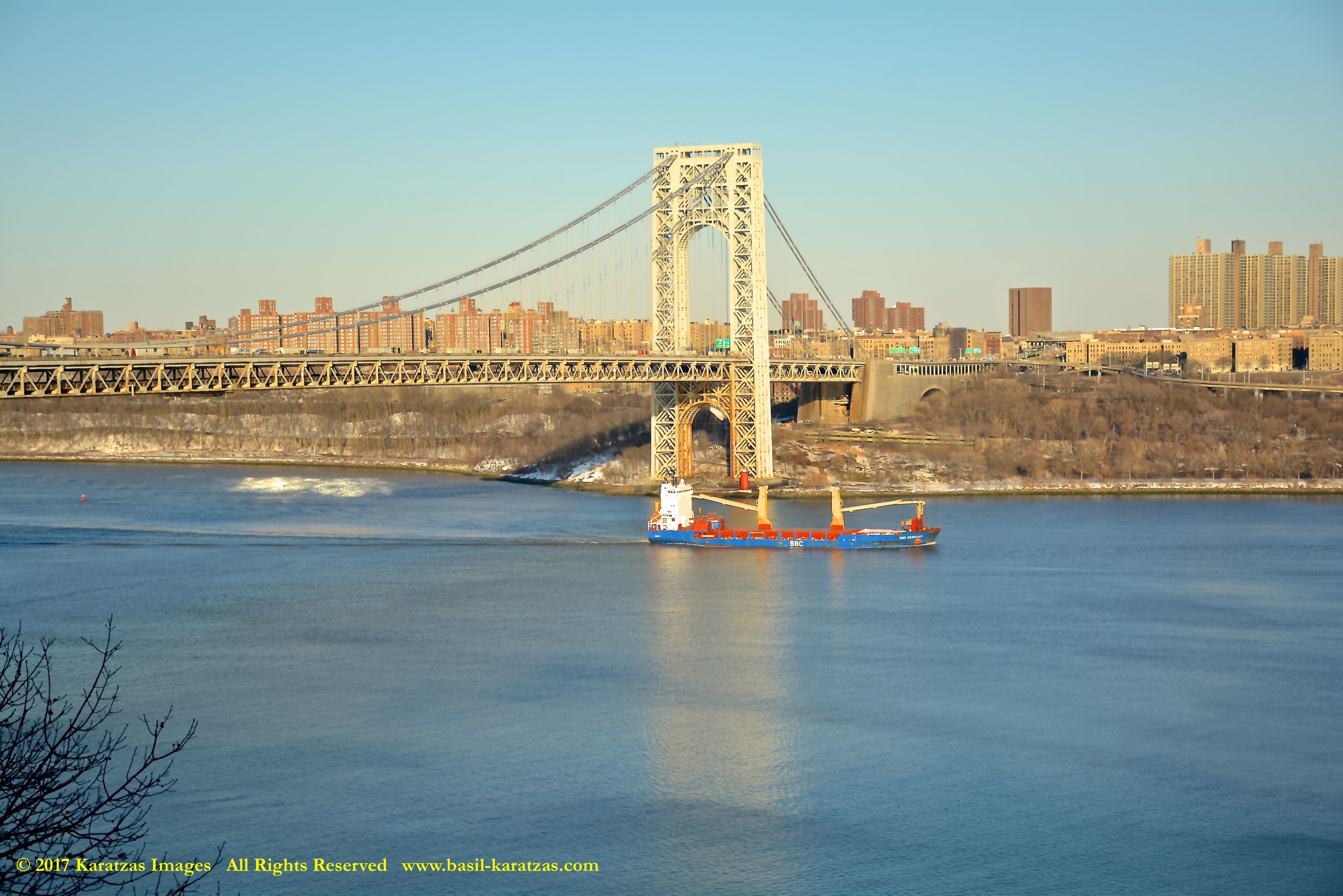 Multi-purpose (MPP) / Heavylift Vessel MV ‘BBC Arizona’ passing under the George Washington Bridge while sailing downstream on Hudson River in New York. Image credit: Karatzas Images