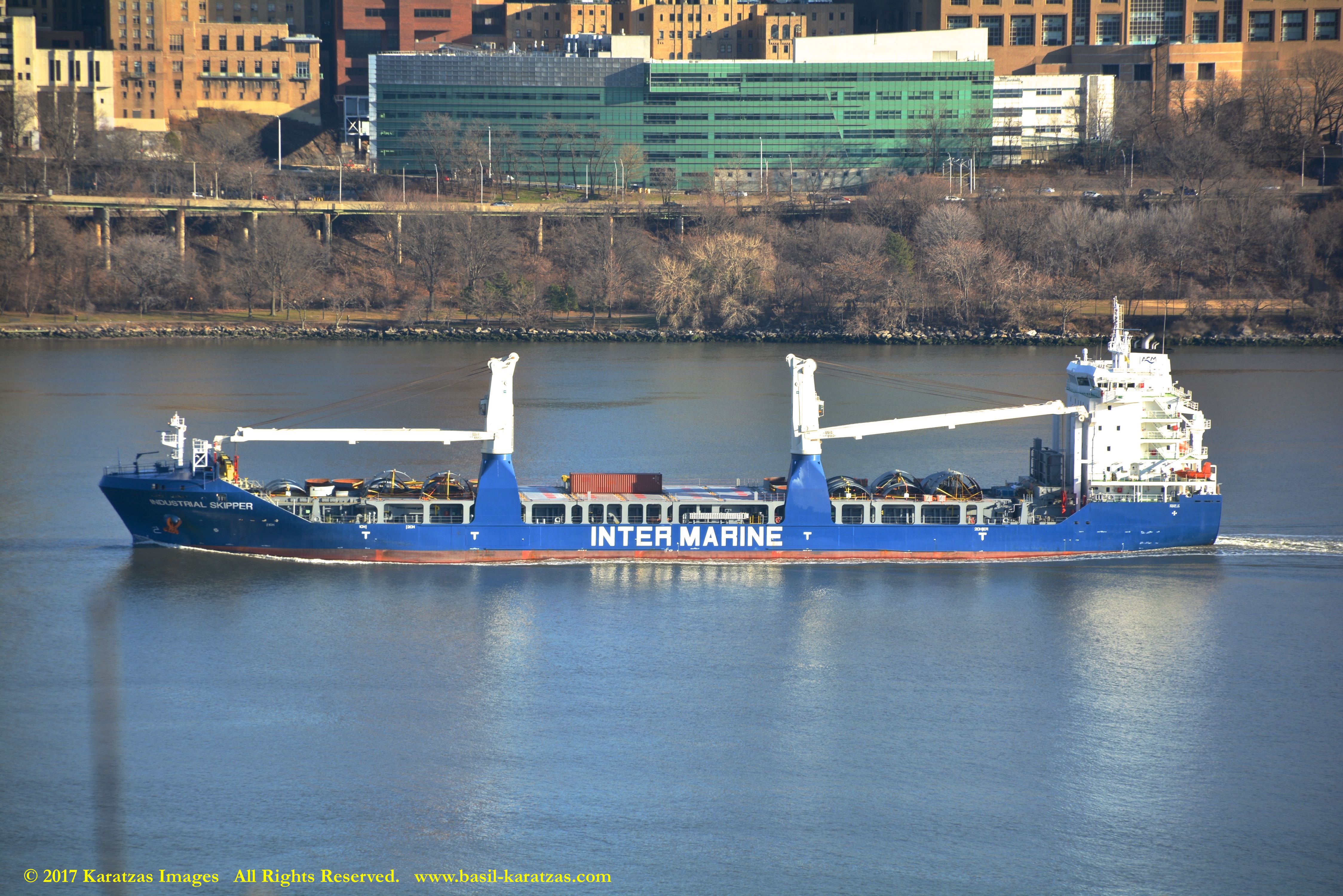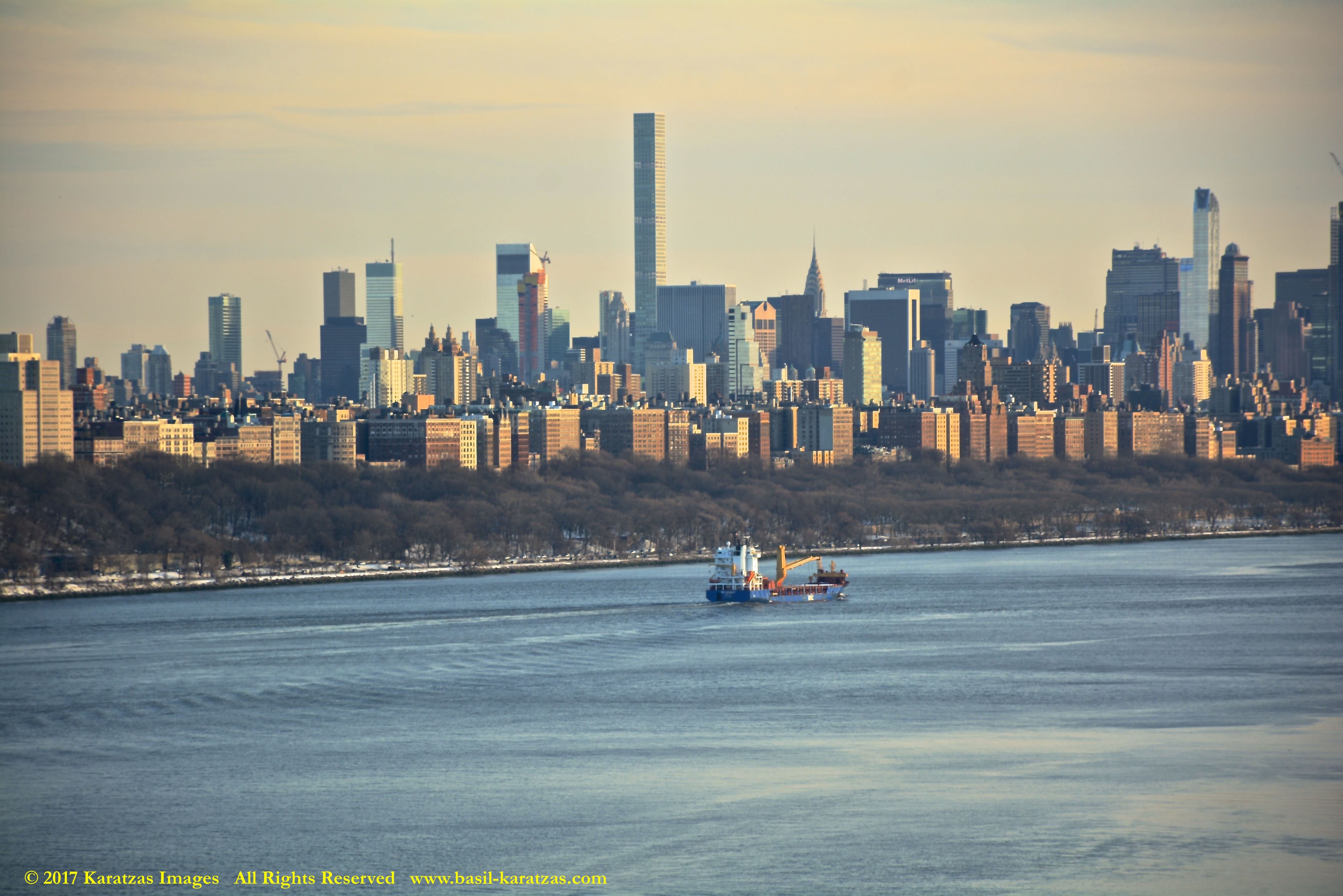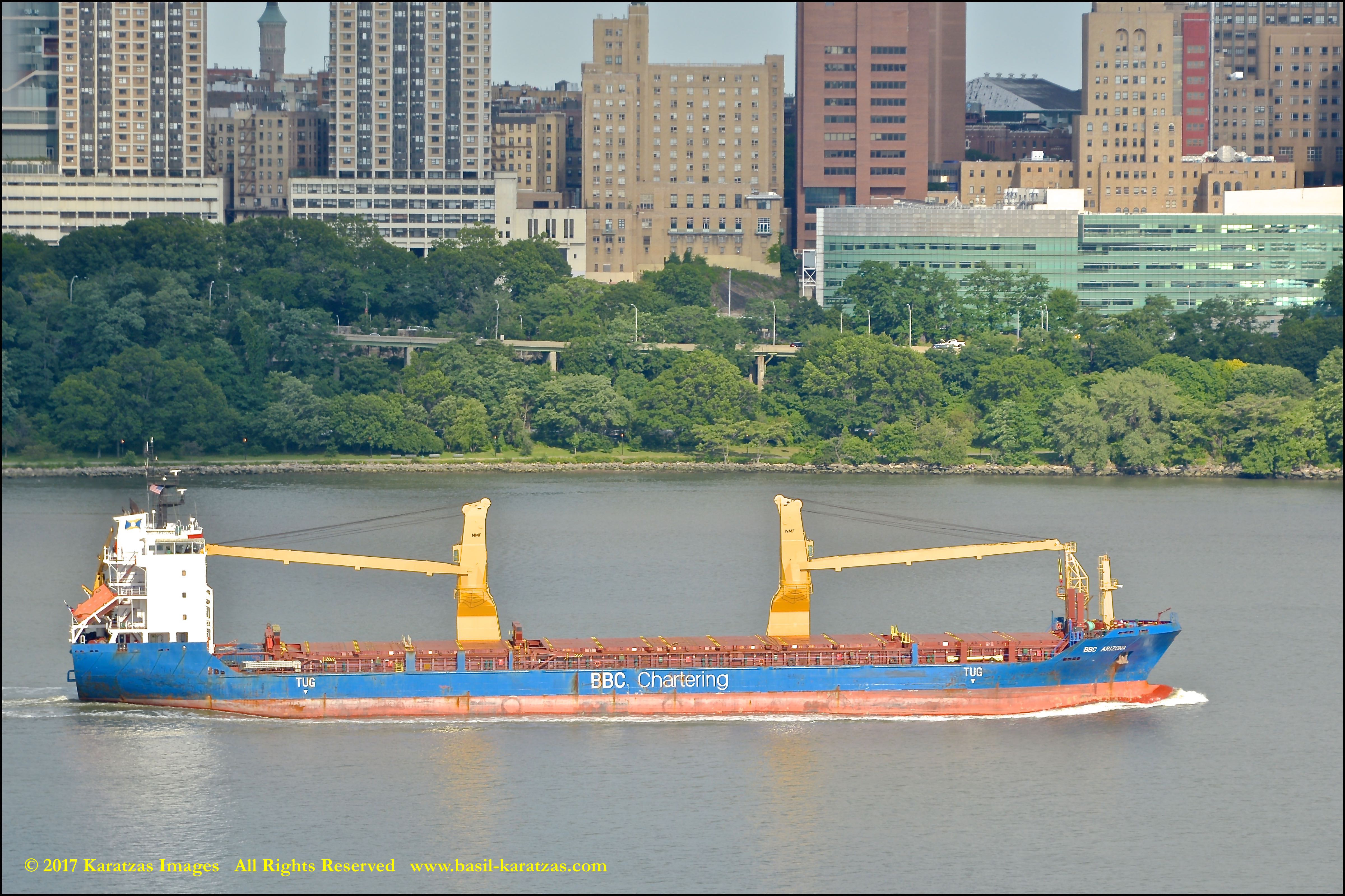 Photographed against the Manhattan skyline, multi-purpose (MPP) / Heavy-lift Vessel MV ‘BBC Arizona’ (12,780 mt dwat, 15,952 cbm, built in 2010 at CSC Jiangdong) passing sailing downstream on Hudson River in New York. Image credit: Karatzas Images