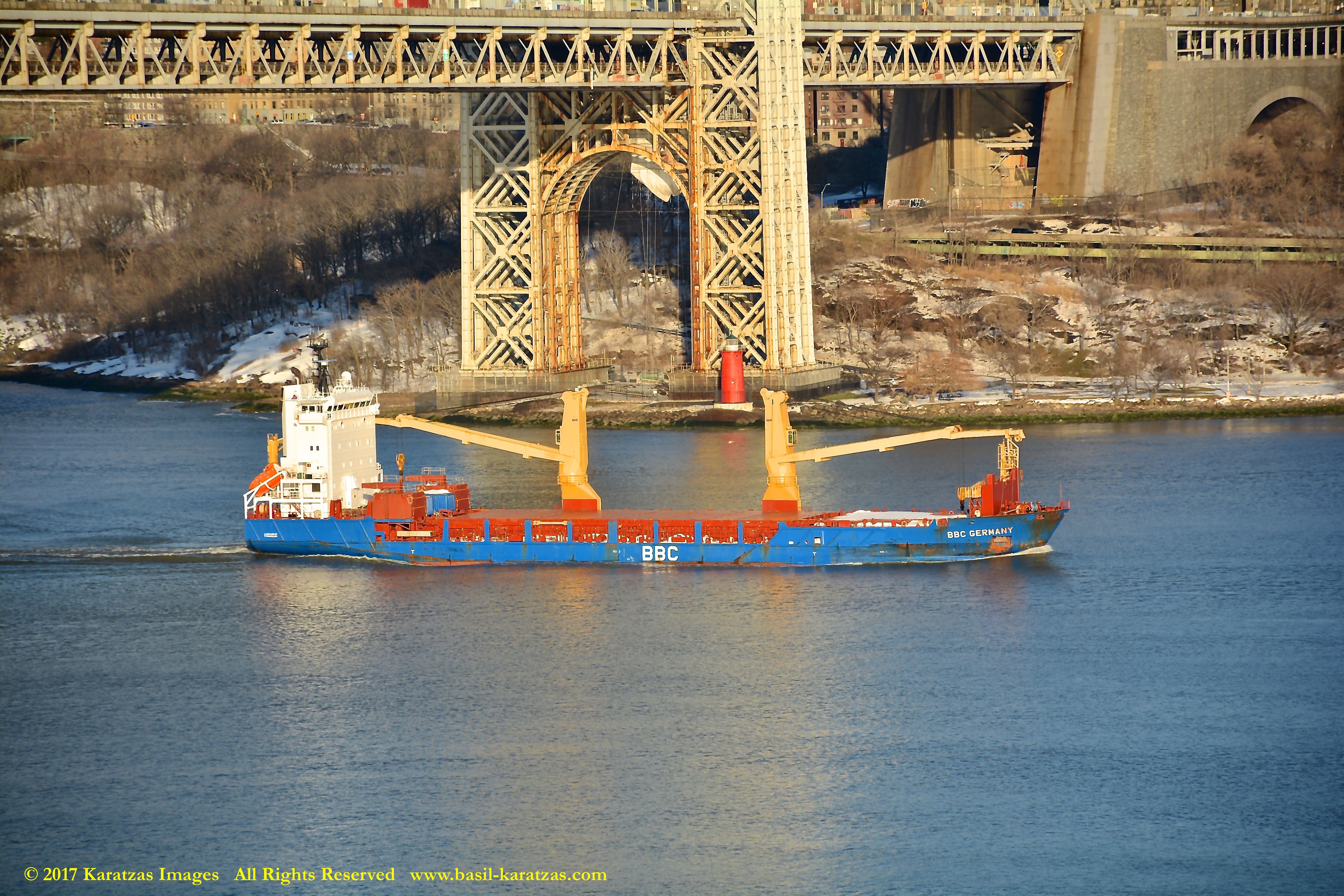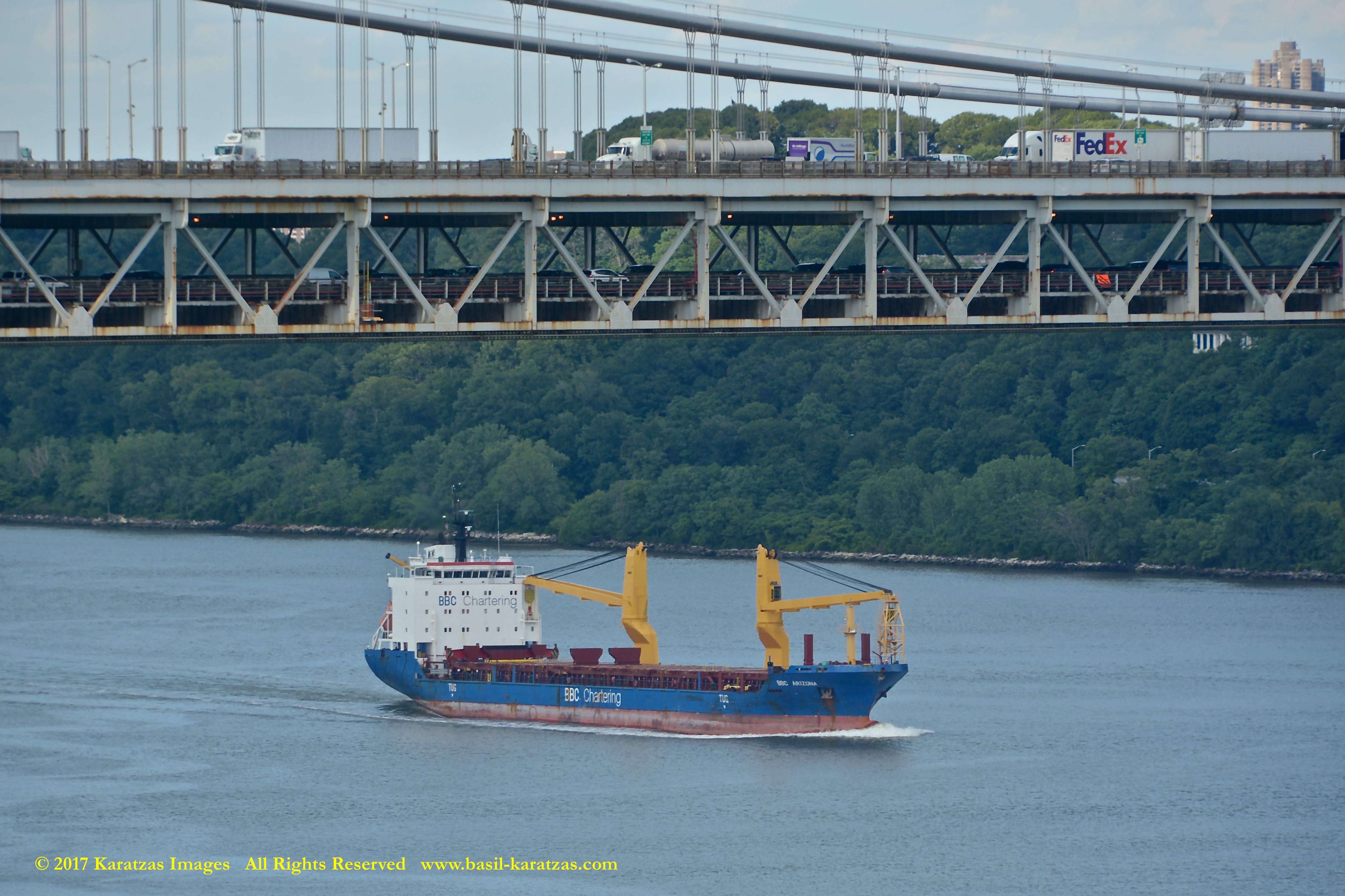 Multi-purpose (MPP) / Heavy-lift Vessel MV ‘BBC Arizona’ passing under the George Washington Bridge while sailing downstream on Hudson River in New York. Image credit: Karatzas Images