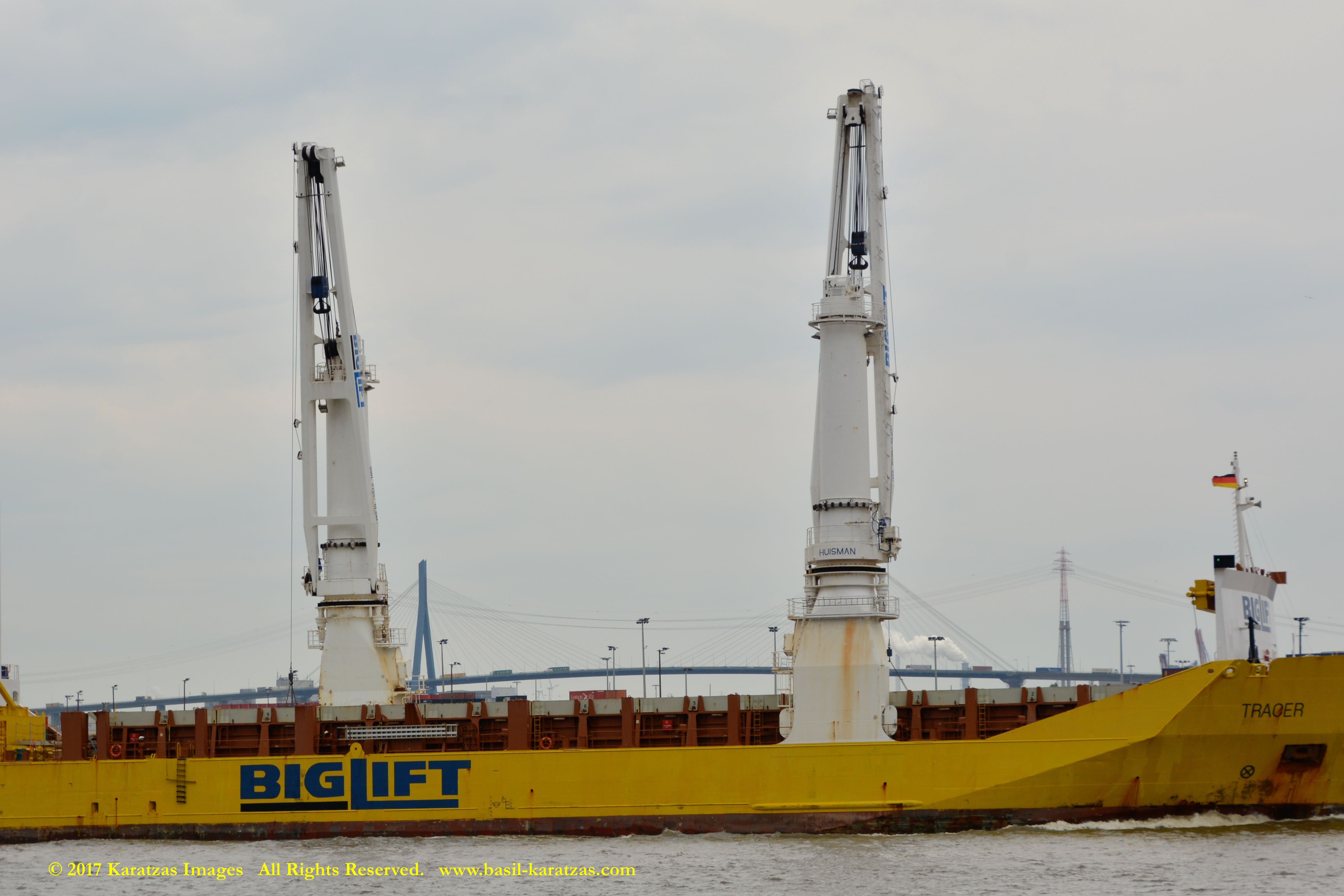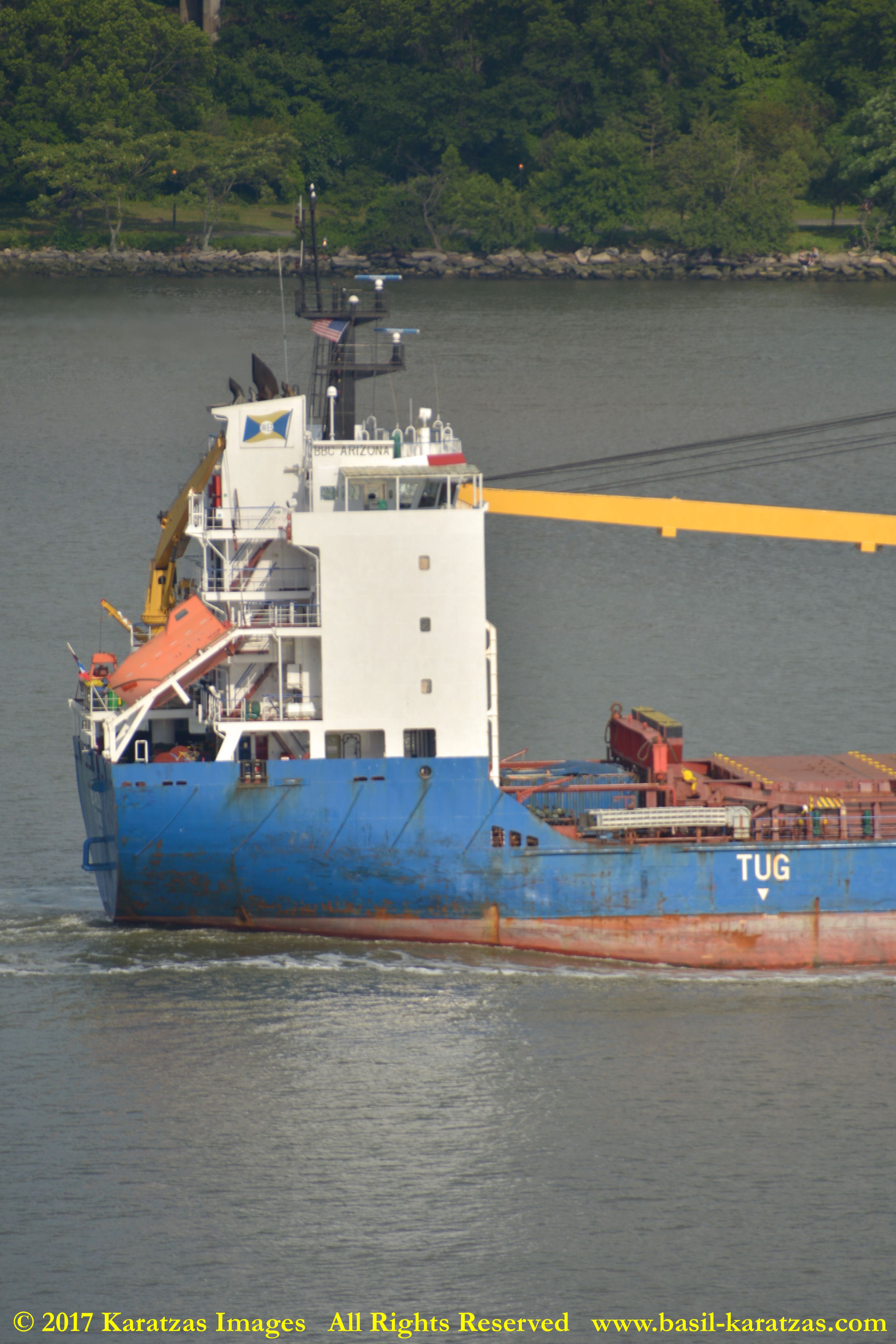 Stern, accommodation and aft crane detail of MV ‘BBC Arizona’ (12,780 mt dwat, 15,952 cbm, built in 2010 at CSC Jiangdong) passing sailing downstream on Hudson River in New York. Image credit: Karatzas Images