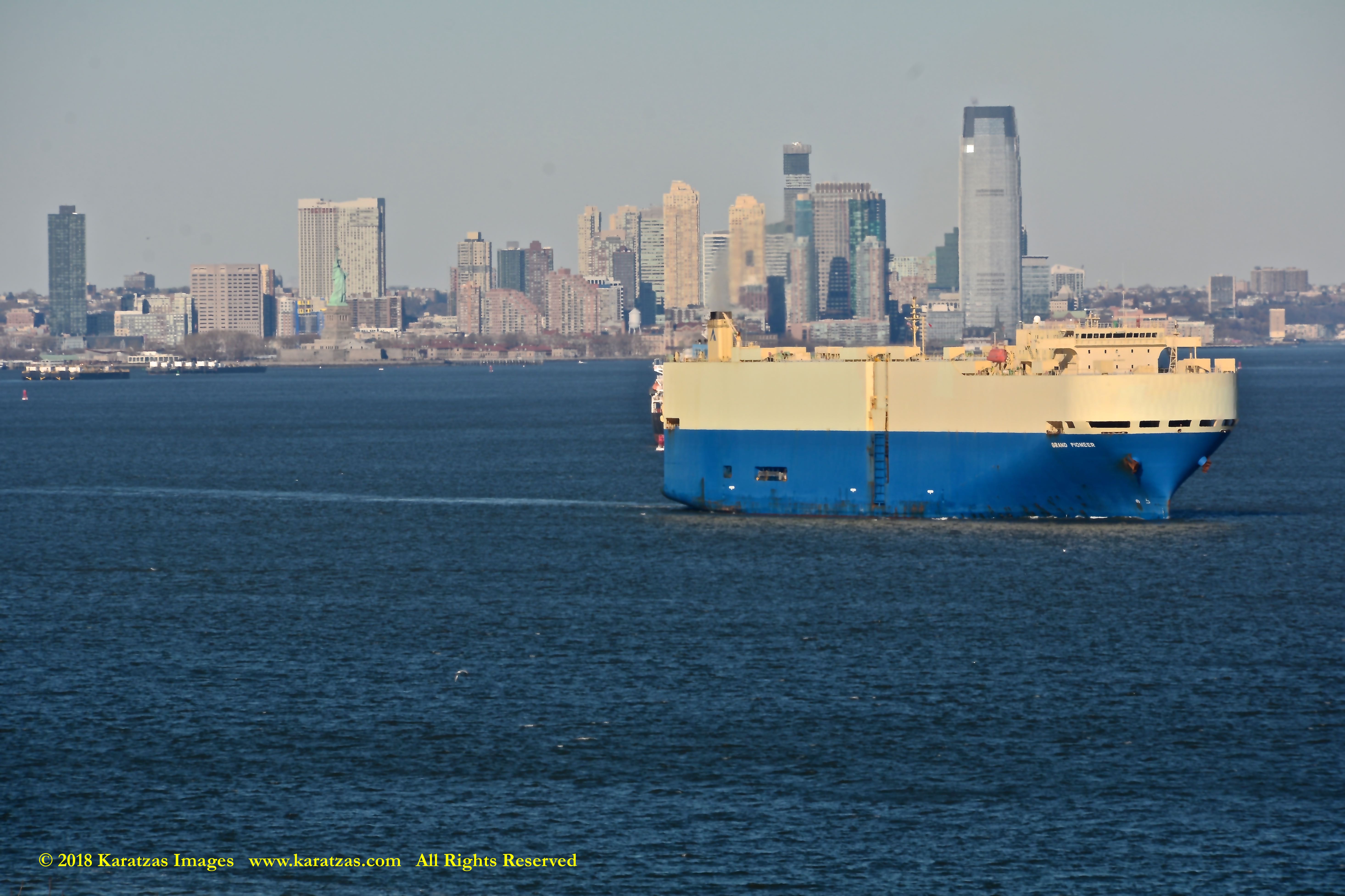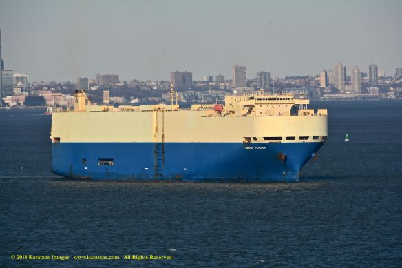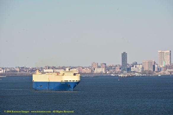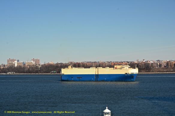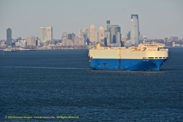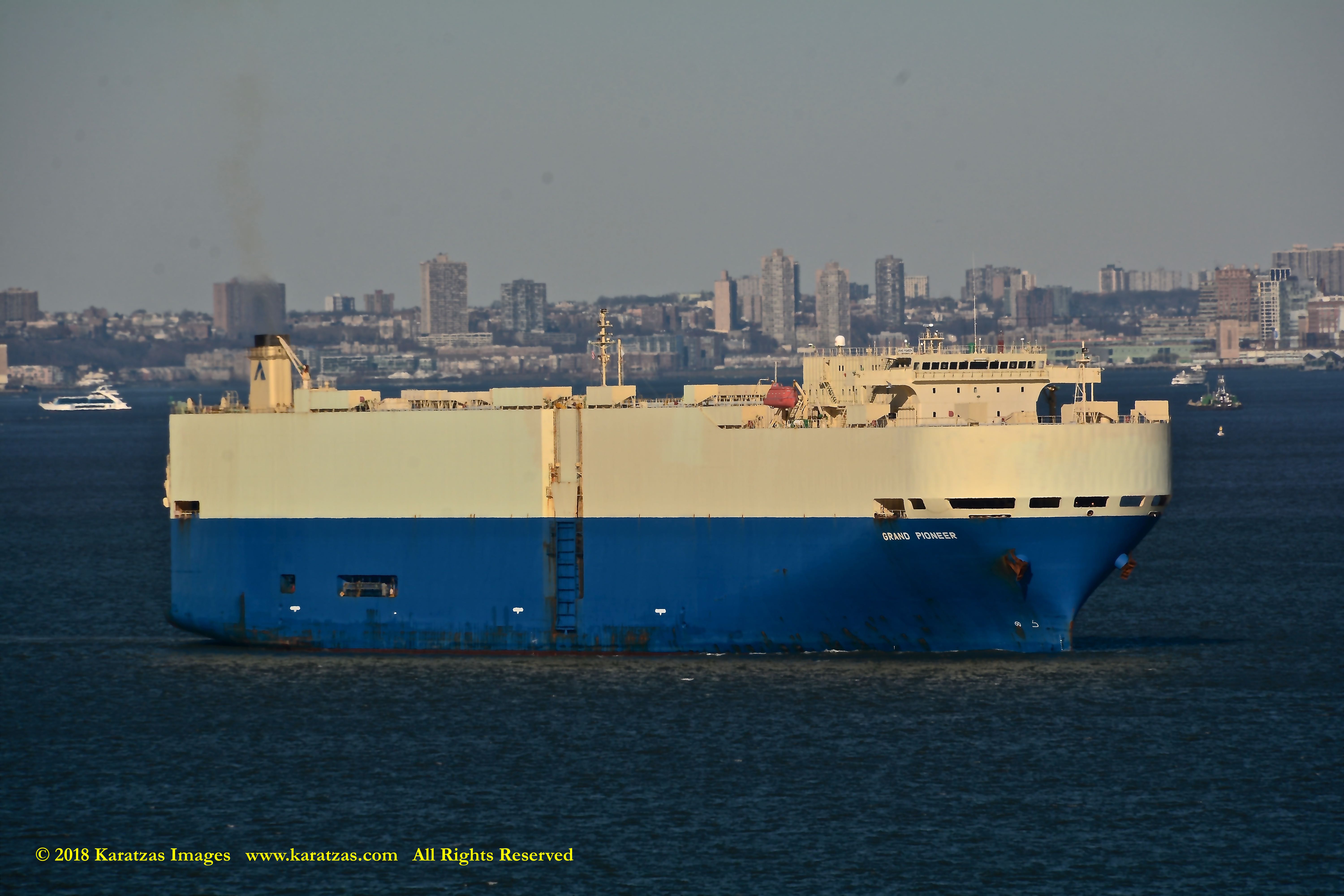 Car-Carrier MV ‘Grand Pioneer’ departing the Port of New York. Seen here in the Upper New York Harbor with Brooklyn in the background. Image credit: Karatzas Images