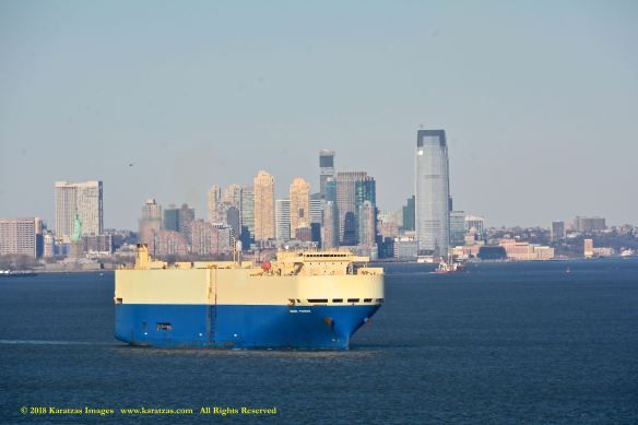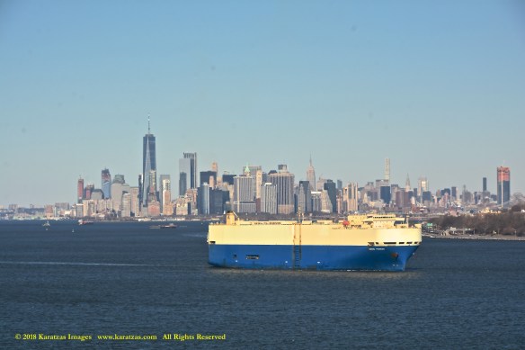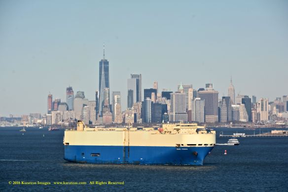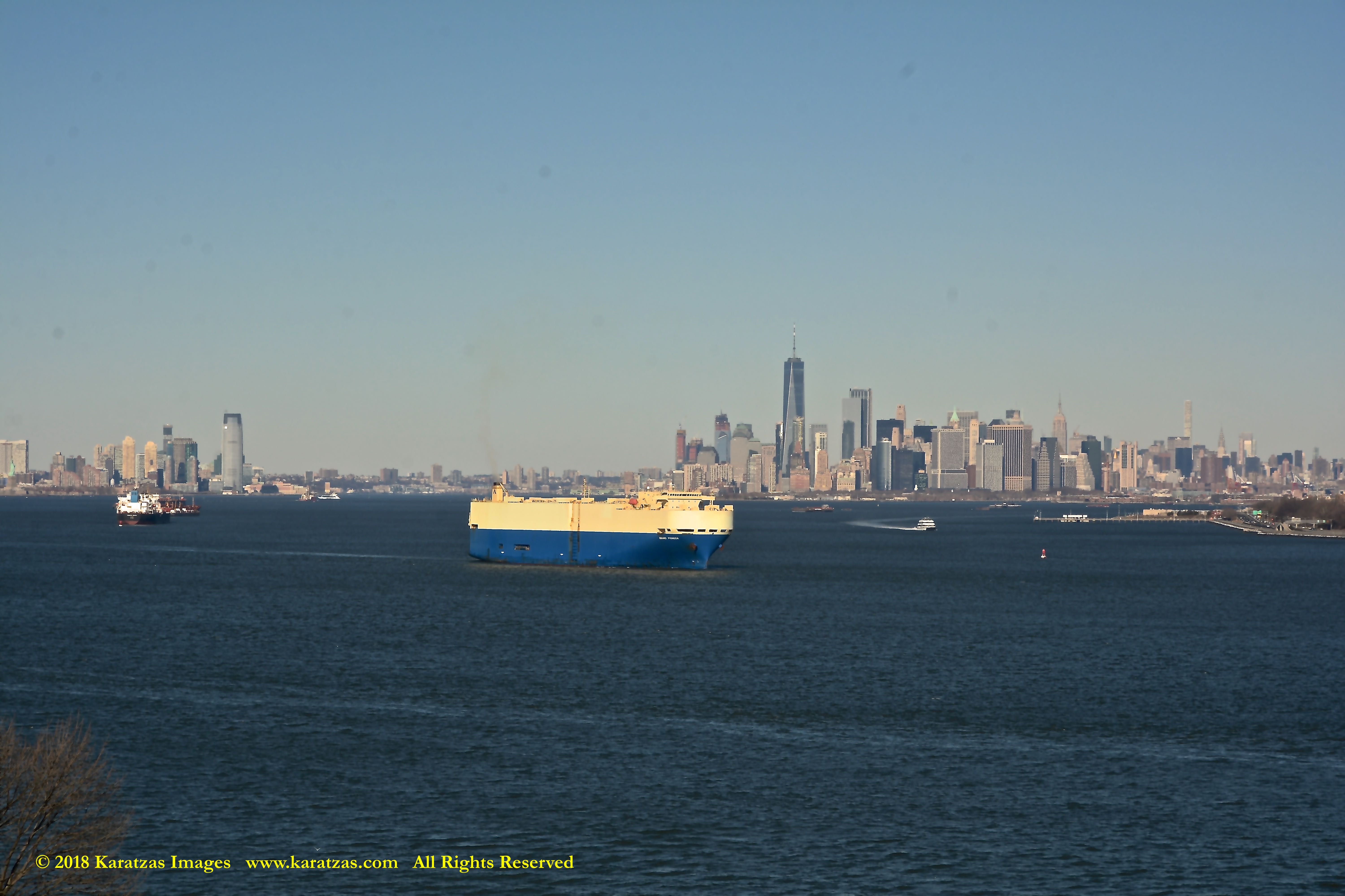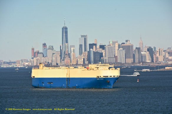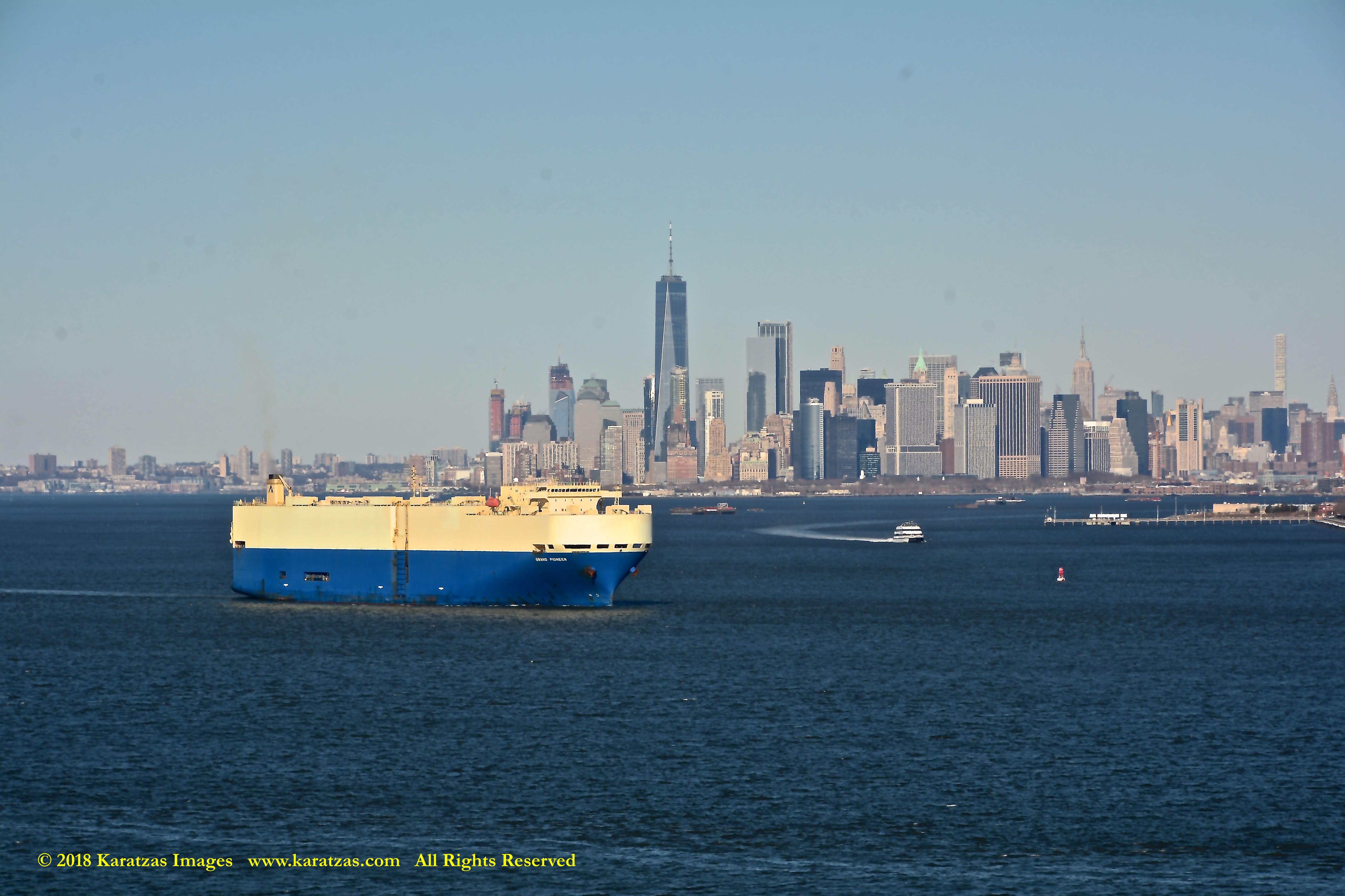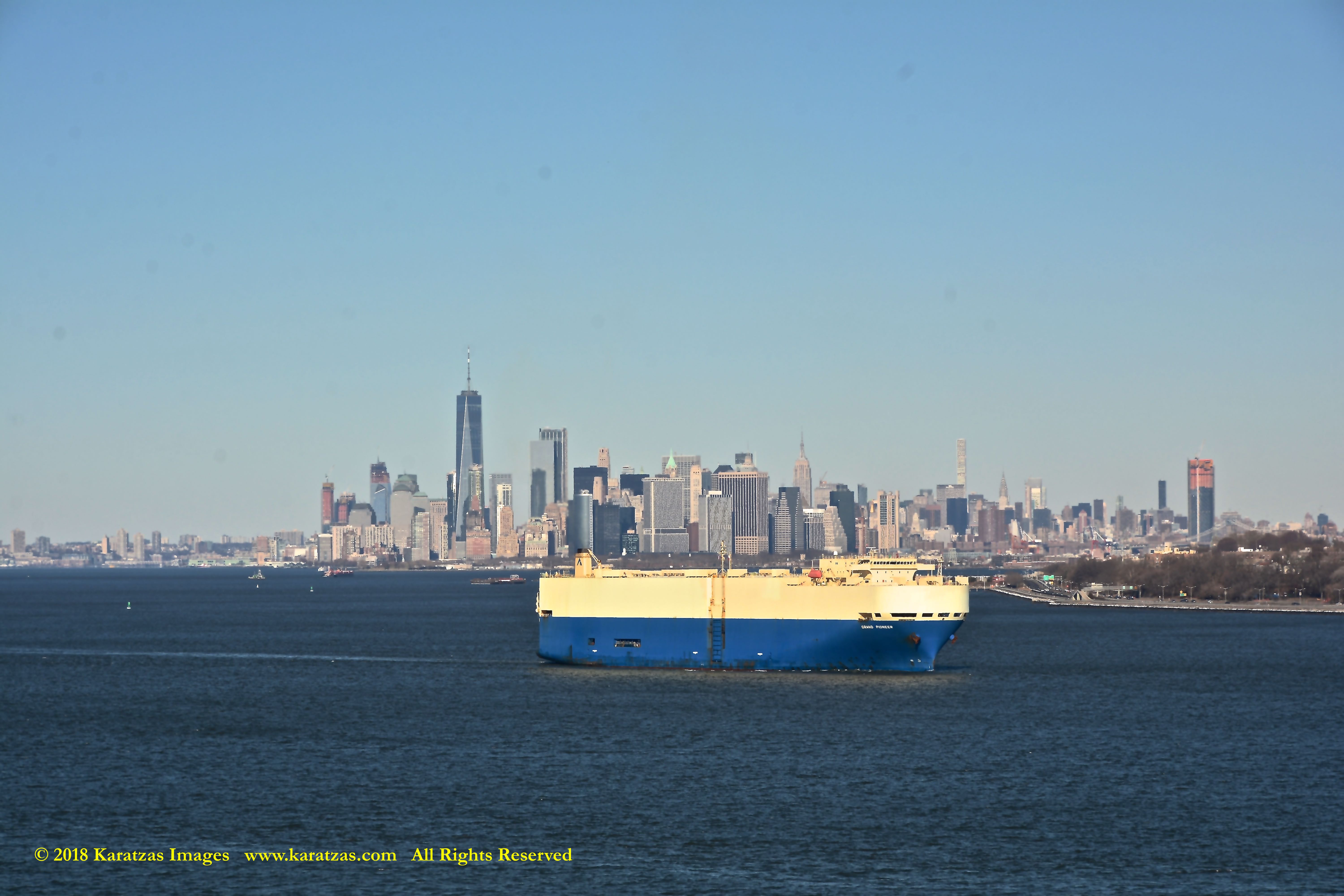 Car-Carrier MV ‘Grand Pioneer’ departing the Port of New York. Seen here in the Upper New York Harbor with the Lower Manhattan skyline. Image credit: Karatzas Images