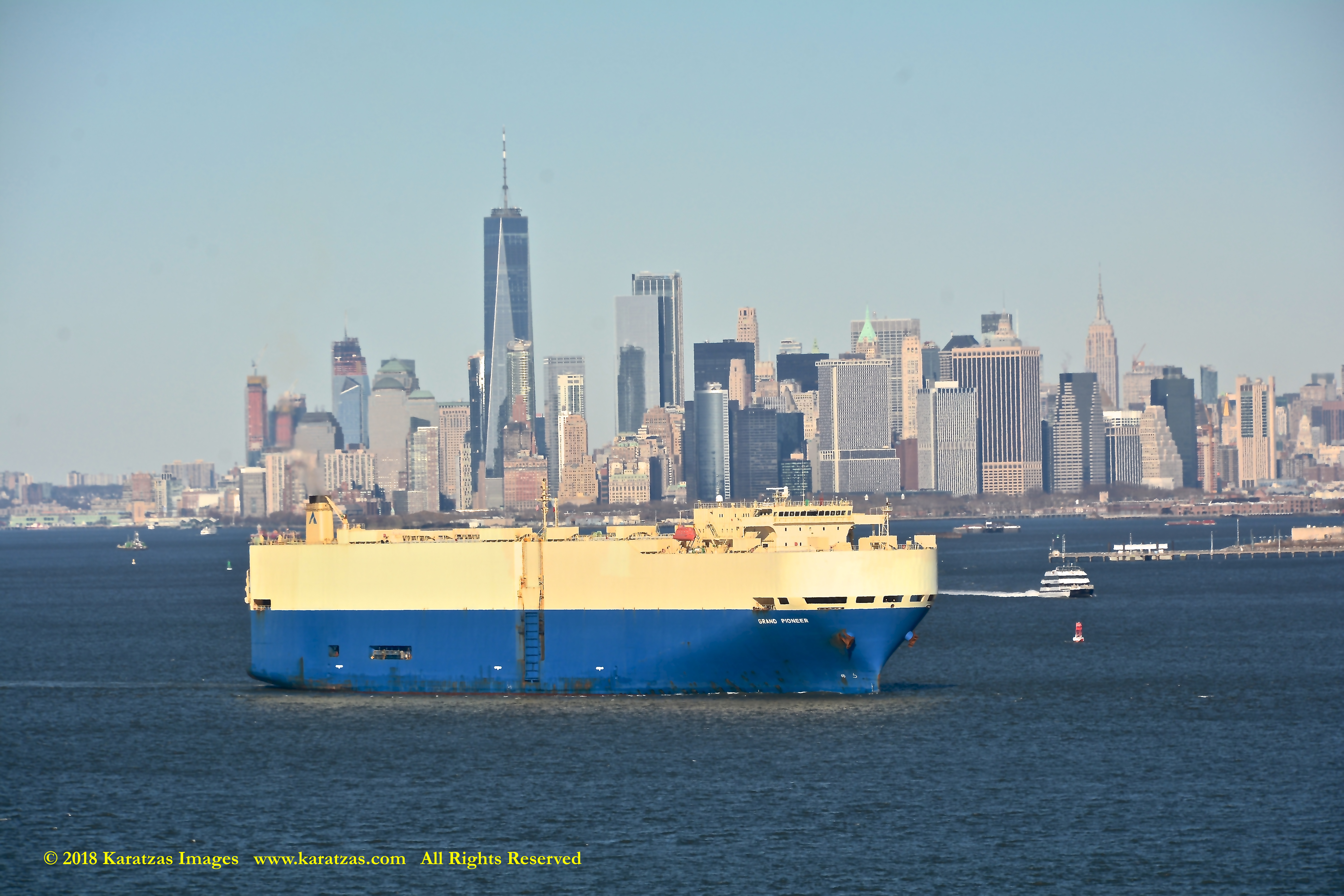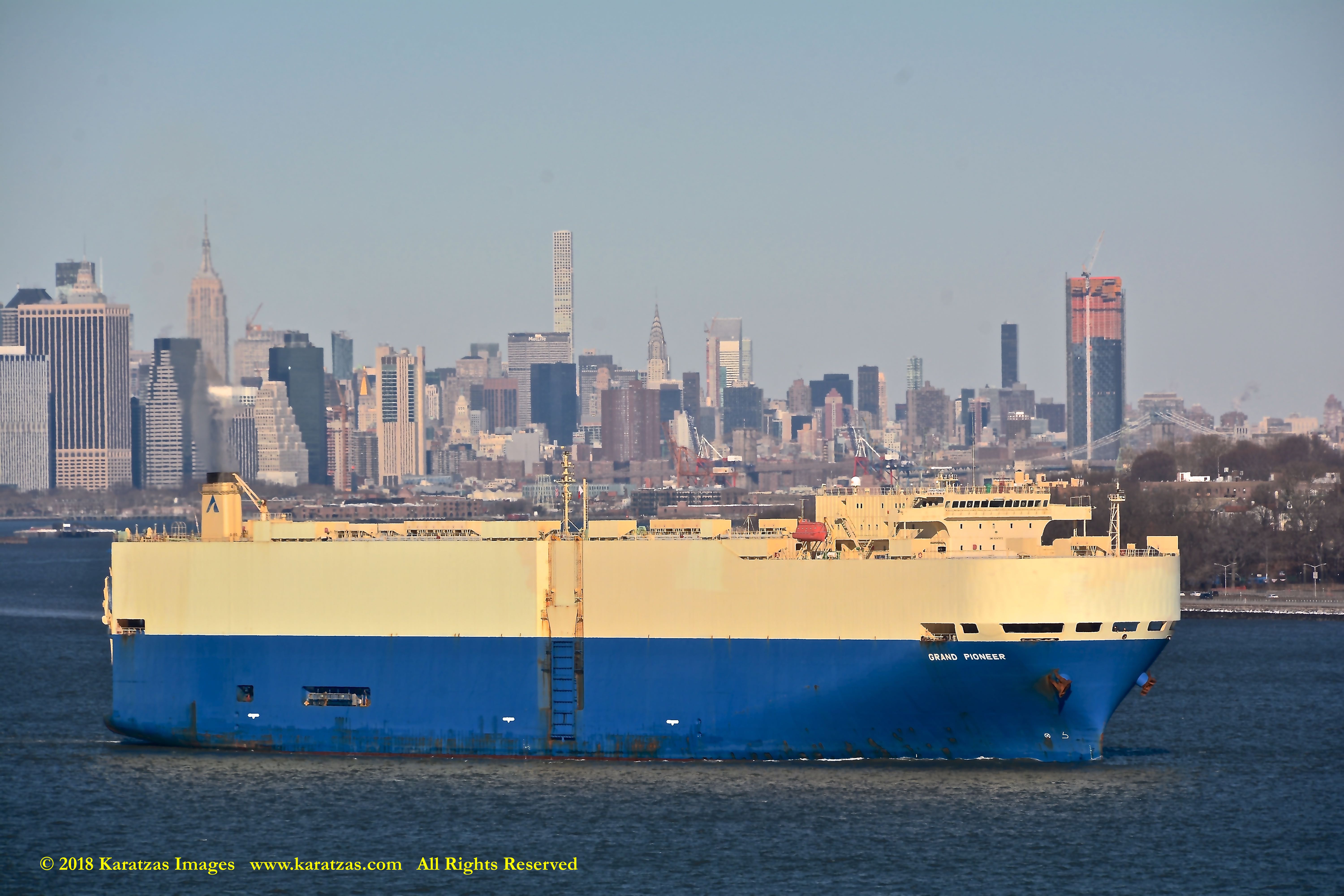 Car-Carrier MV ‘Grand Pioneer’ departing the Port of New York. Seen here in the Upper New York Harbor. Image credit: Karatzas Images