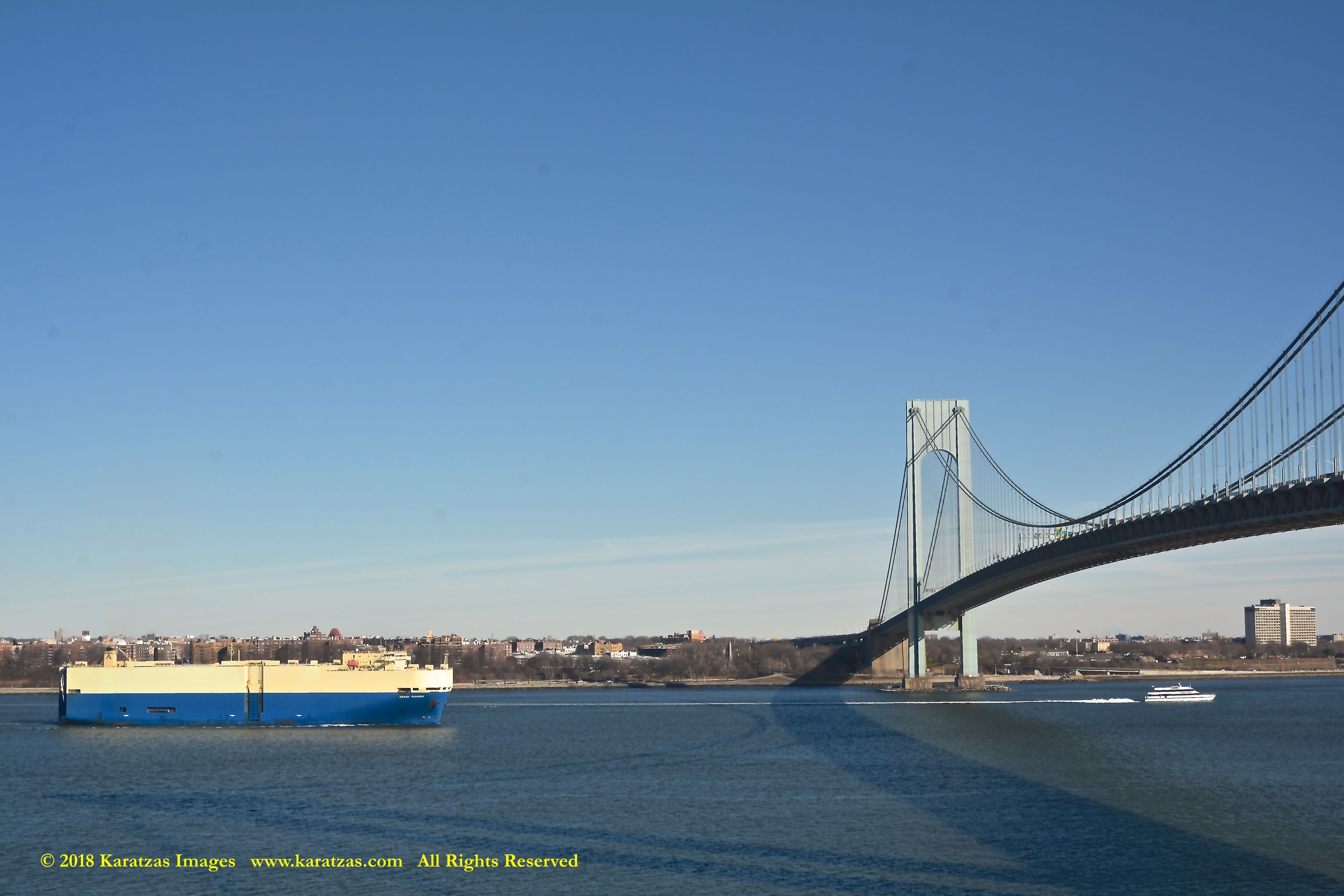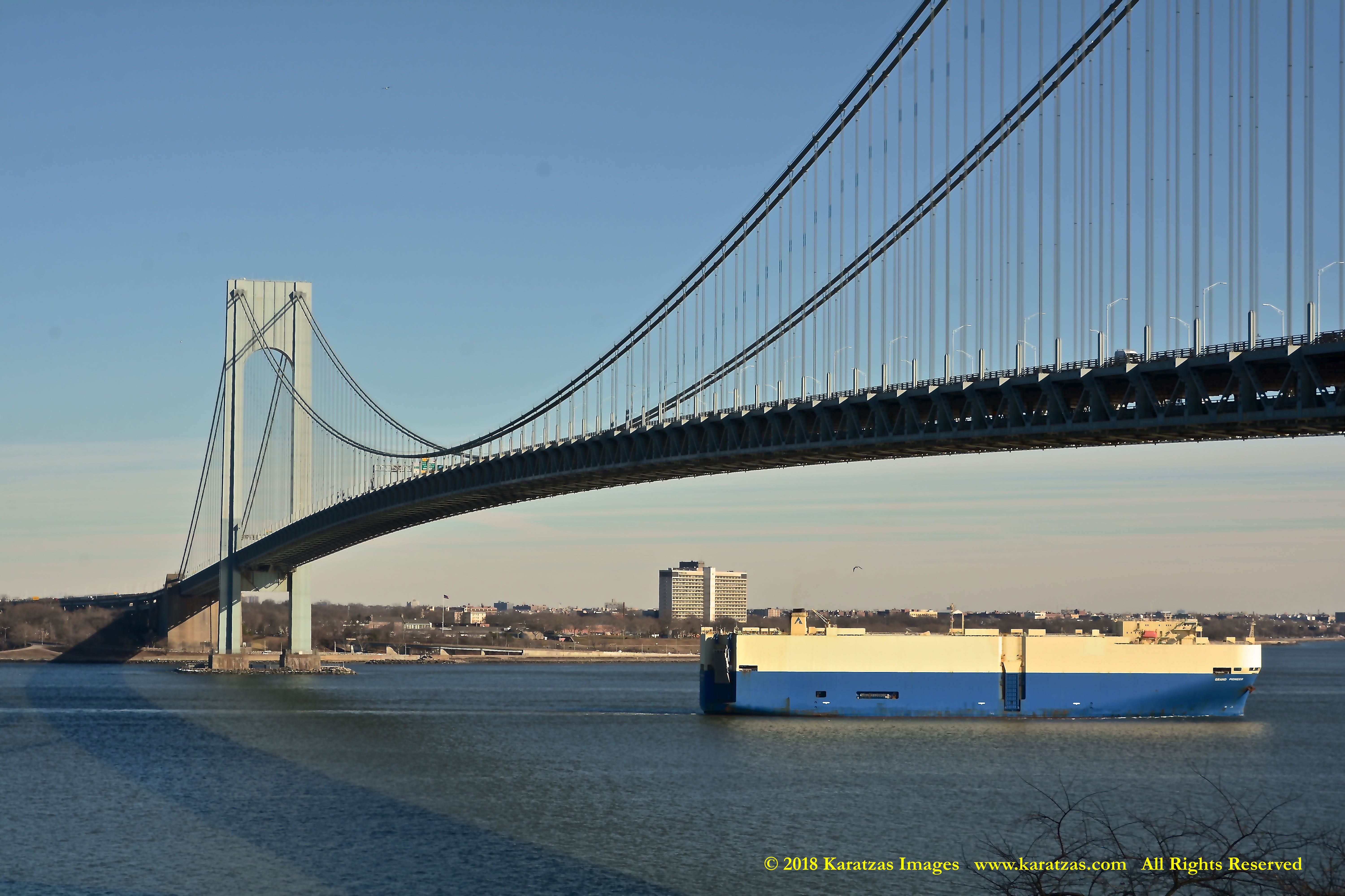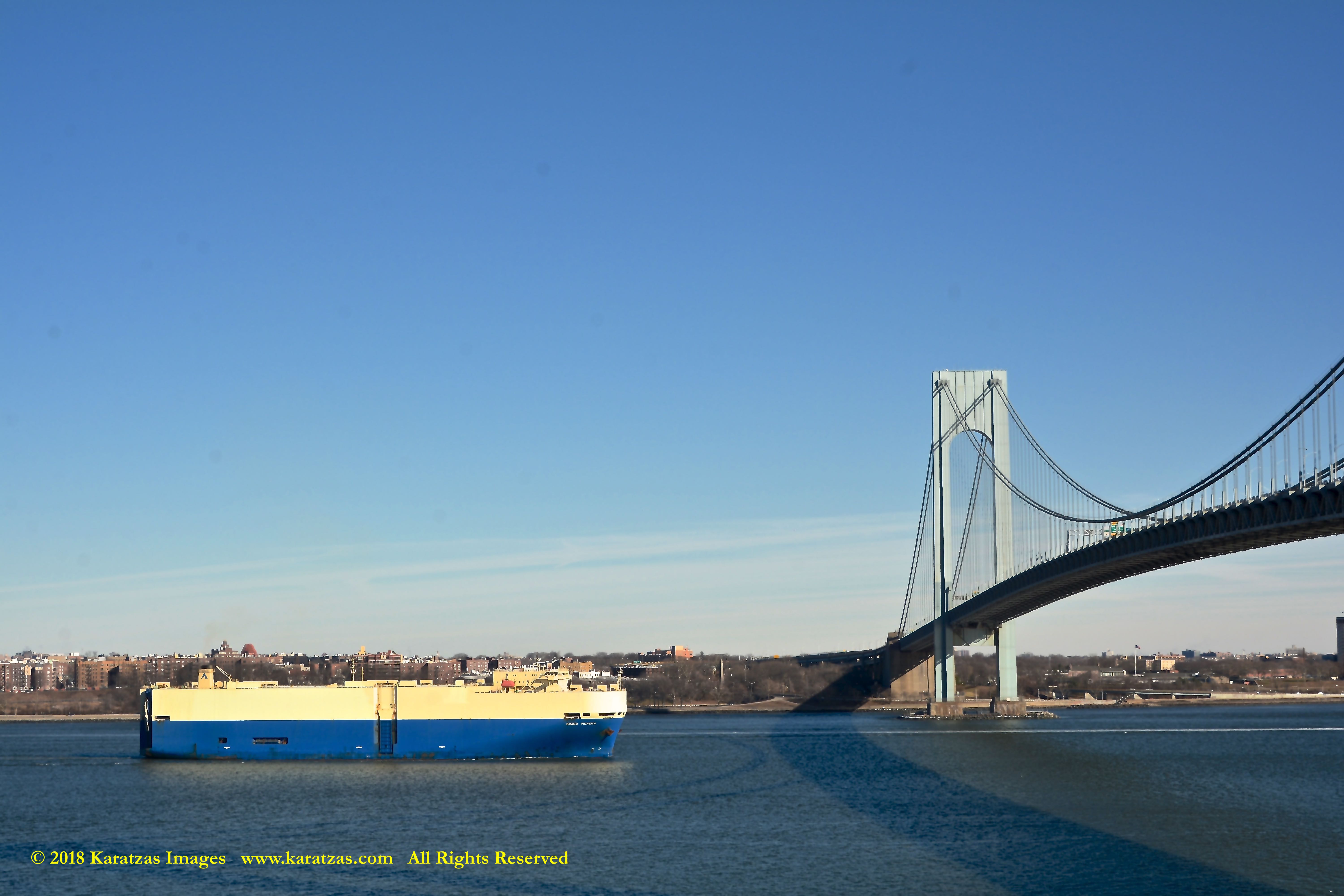 Car-Carrier MV ‘Grand Pioneer’ departing the Port of New York. Seen here with the Verrazzano-Narrows Bridge. Image credit: Karatzas Images