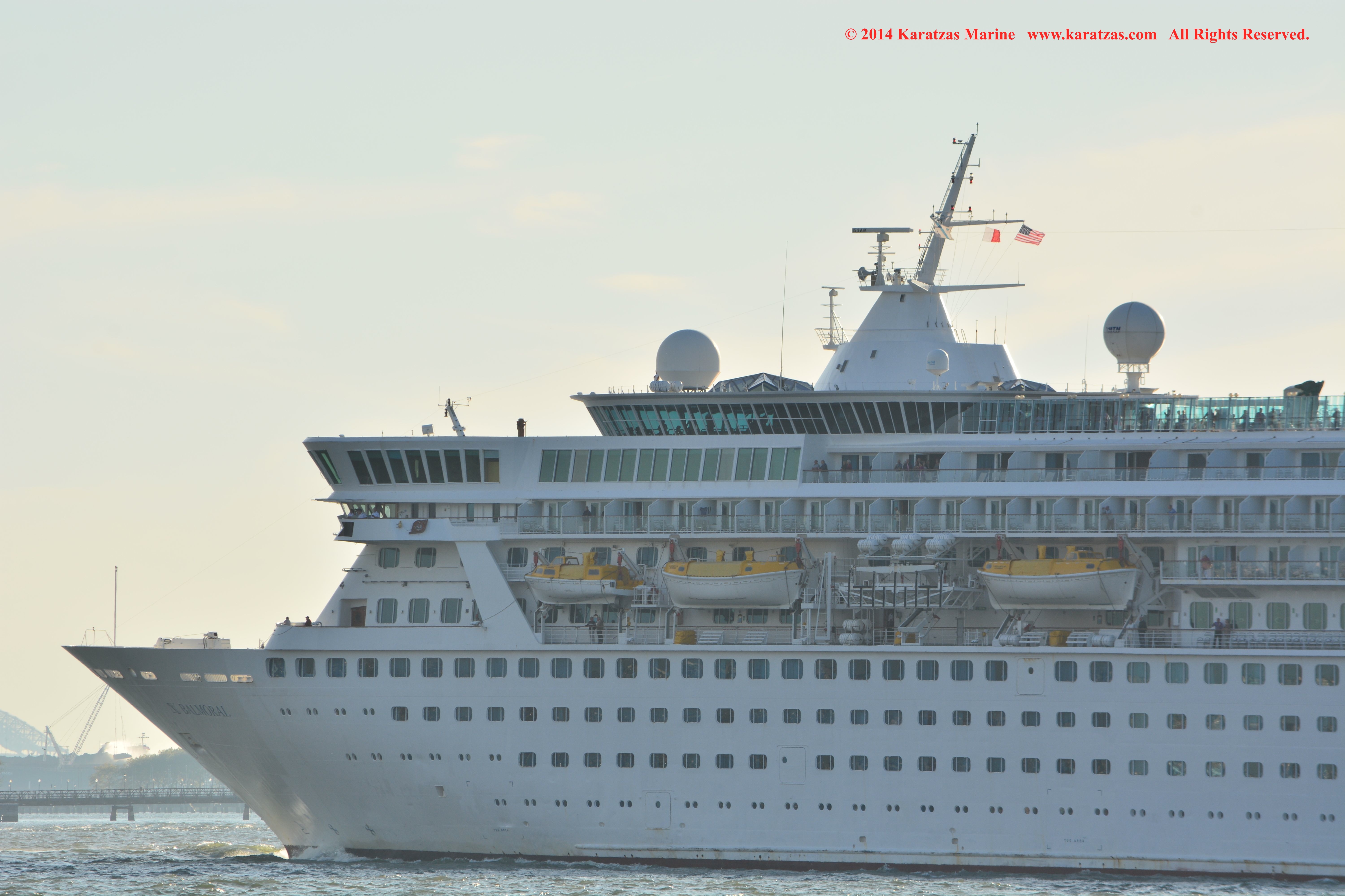 IDENTIFICATION: Ex-names are Grand Latino, Superstar Capricorn, Superstar Capricorn, Hyundai Keumgang, Superstar Capricorn, Golden Princess, Birka Queen, Sunward, Royal Viking Sky. Call Sign C6VA3, IMO Number 7218395, Vessel was rebuilt or converted in 2006. Built at O/Y Wartsila AB, Bahamas Flagged, Length Overall of 206.96 m., Length Between Perpendiculars of 169.73 m., Draught of 7.55 m., Beam of 25.20 m., Moulded Depth of 13.67 m., Tonnage of 11,714 International Net and 5,862 Dwt (long). Gross Tonnage of 28,551, Engine Description 4 S.A. 9-cyl., Engine Model 9ZH40/48, Sulzer Engine, Speed of 20.00 kts, Horsepower of 18,000, 2 Variable pitch Propellors.