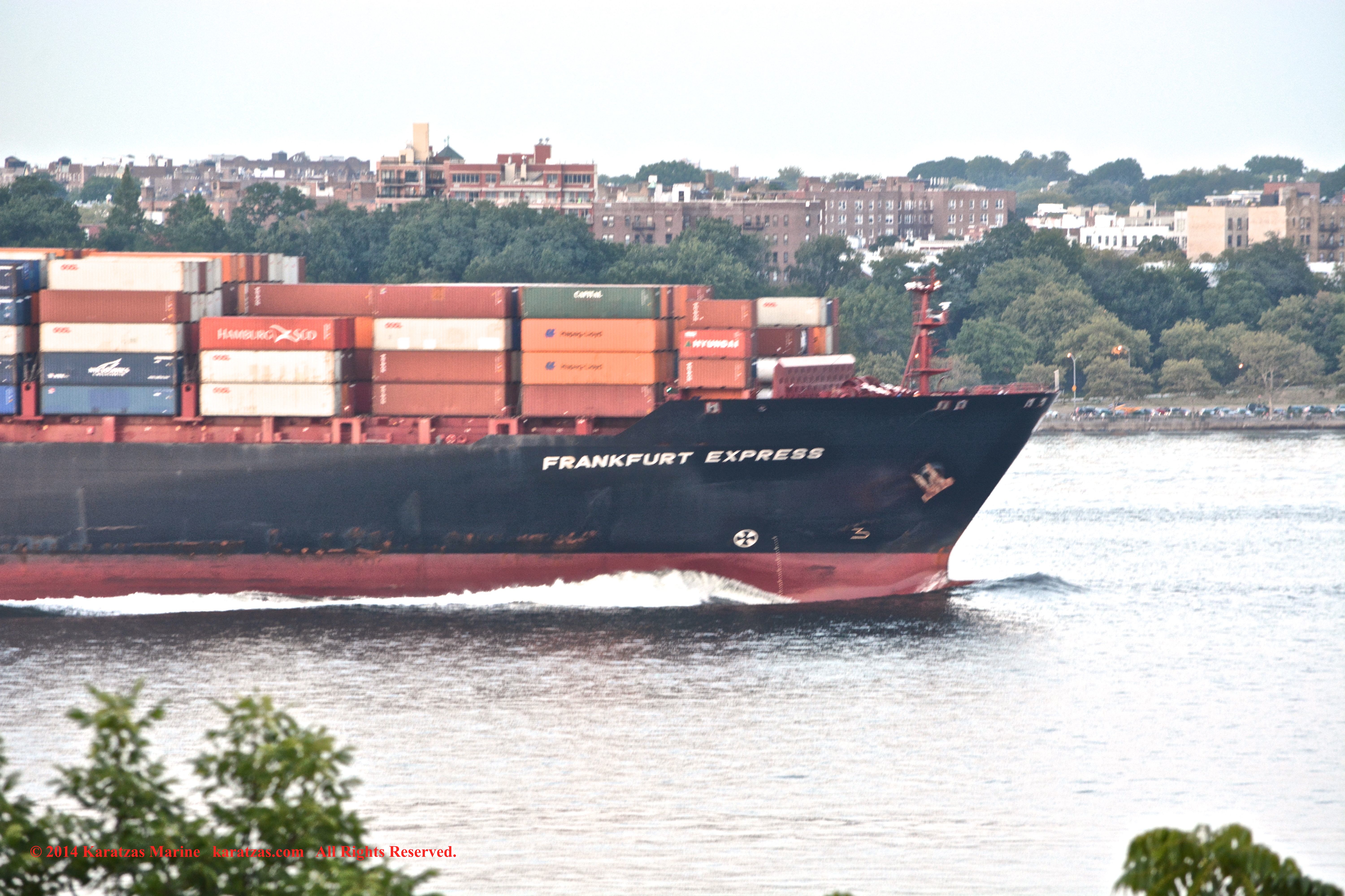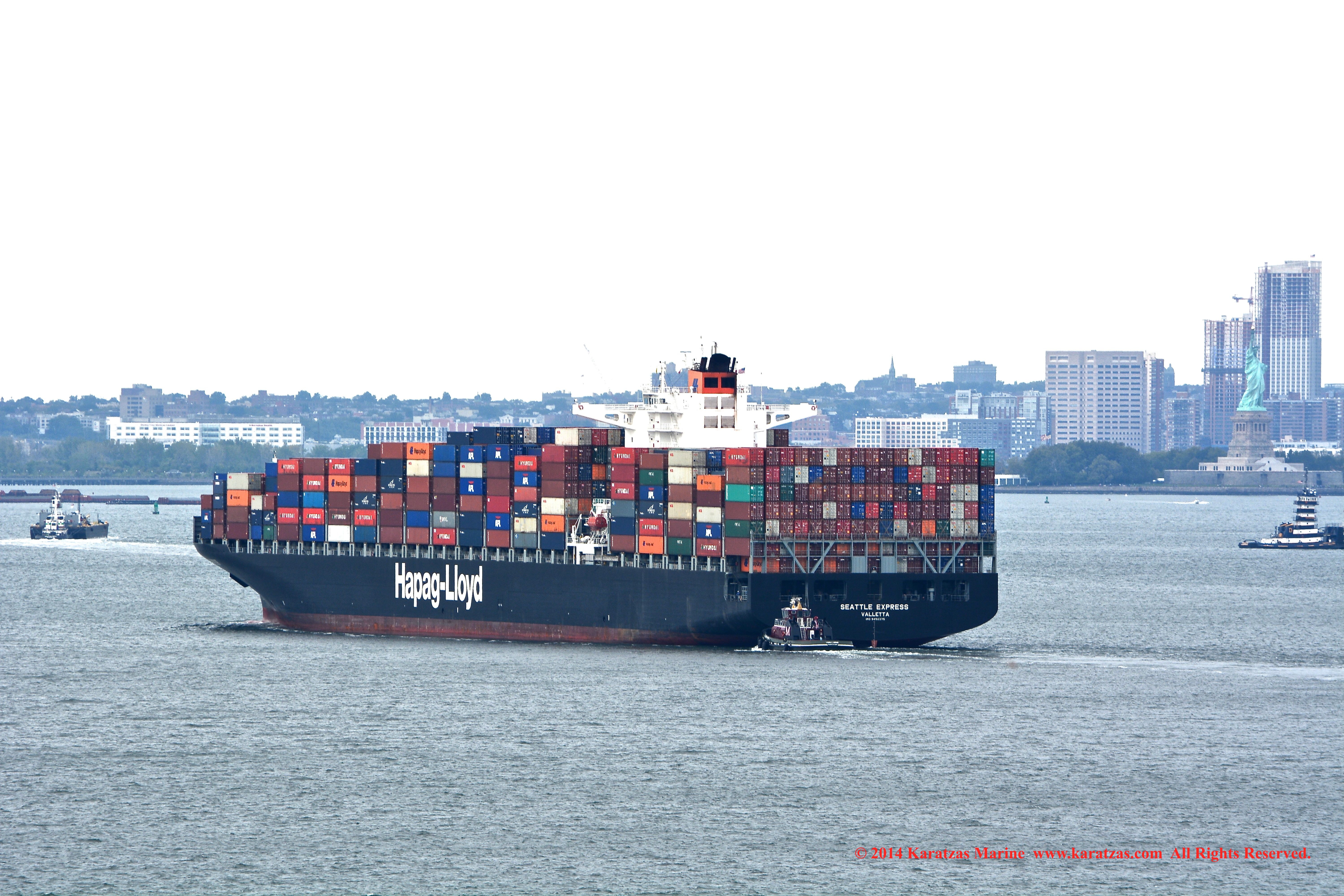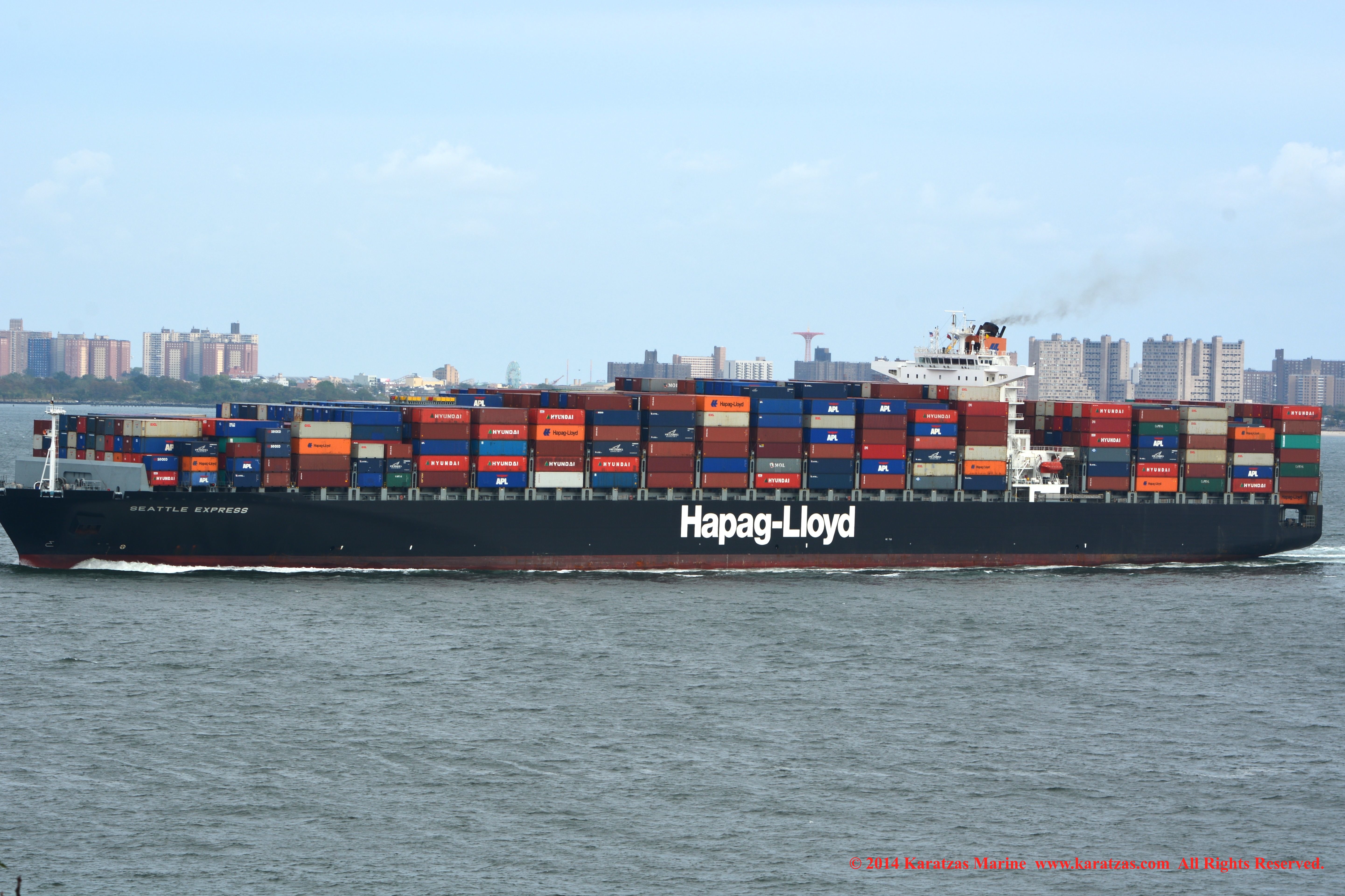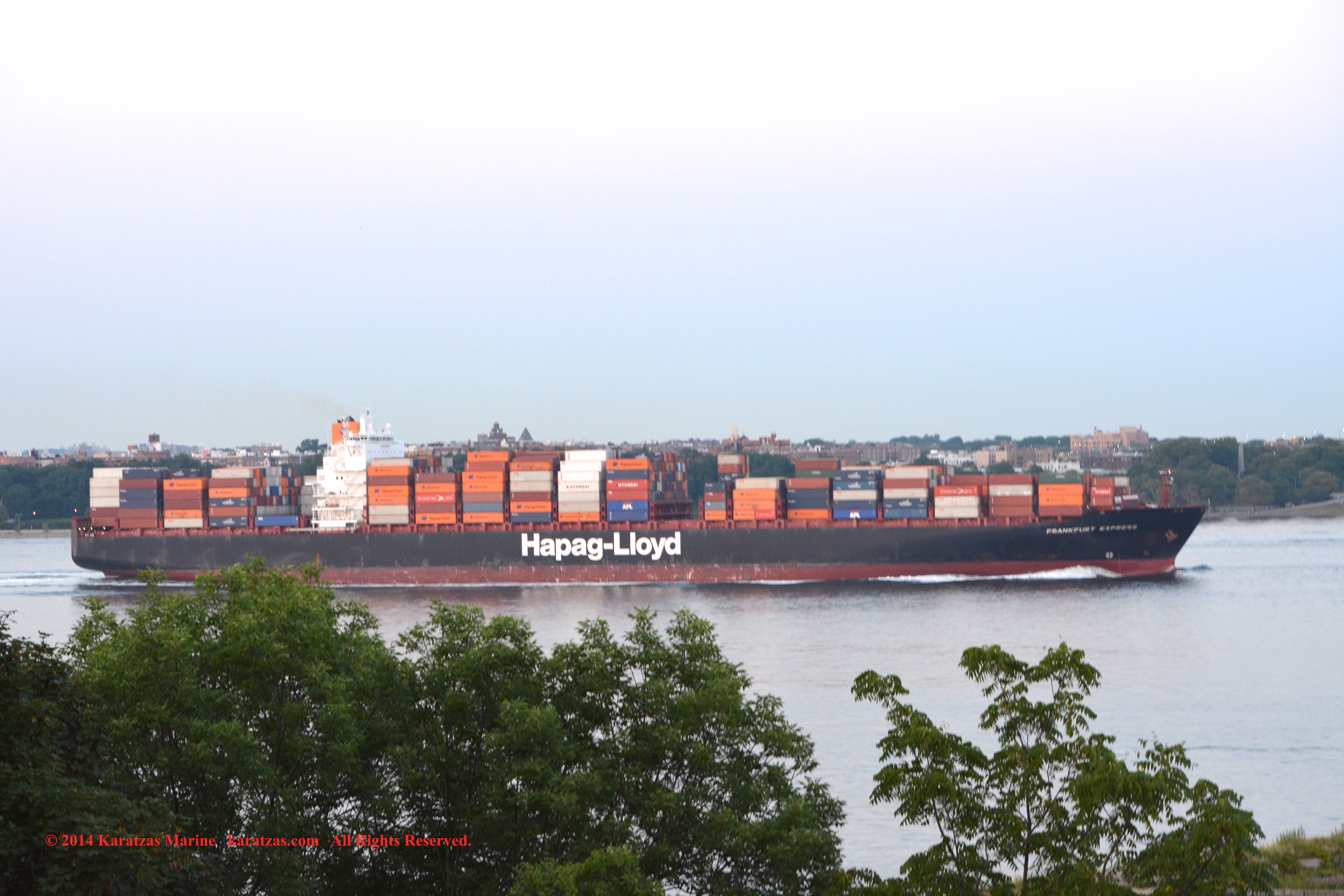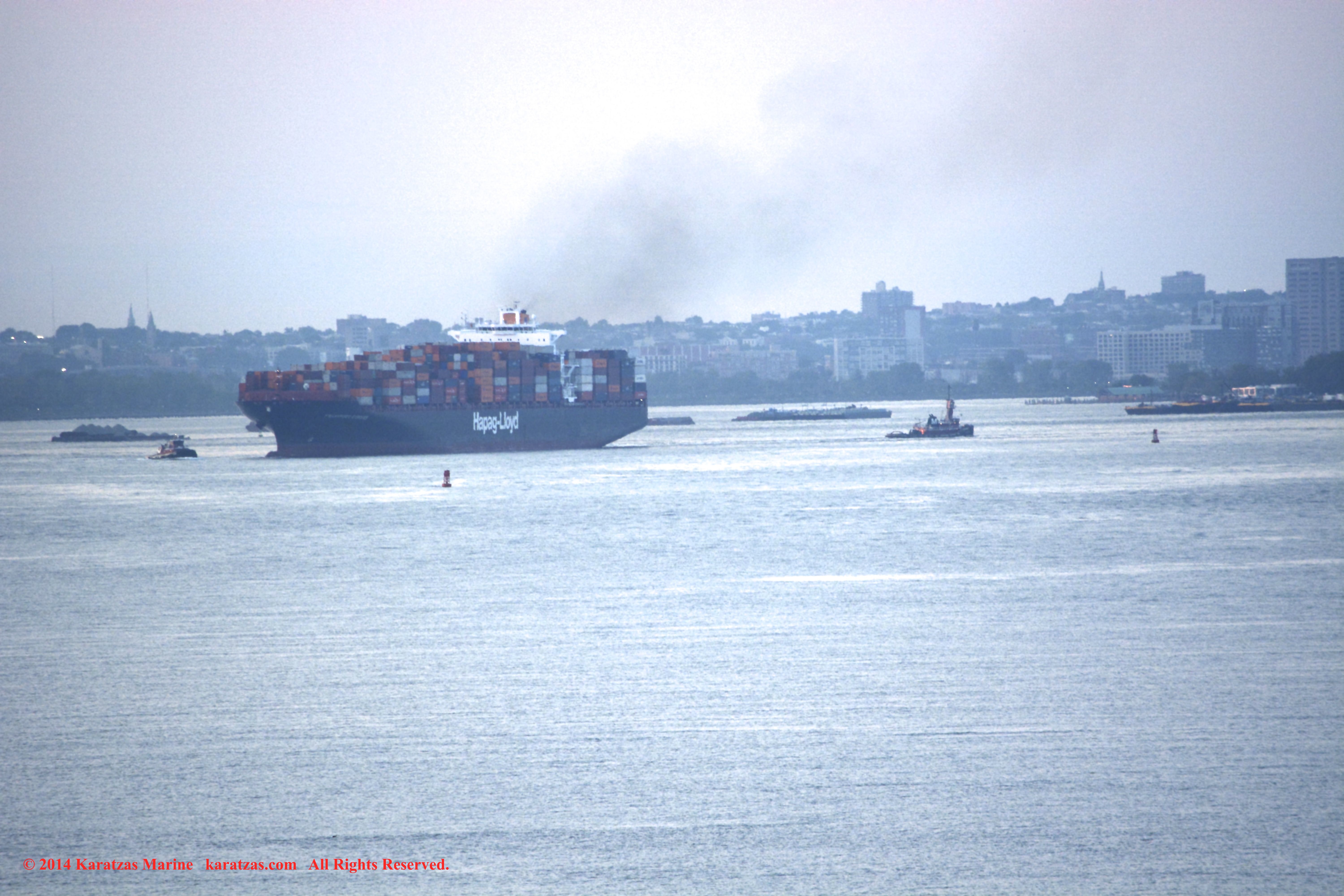 Hapag-Lloyd’s neopanamax containership MV ‘Essen Express’ (13,250-teu built at HHI in 2013) departing New York Harbor; seen here against the Lower Manhattan skyline. Image credit: Karatzas Images