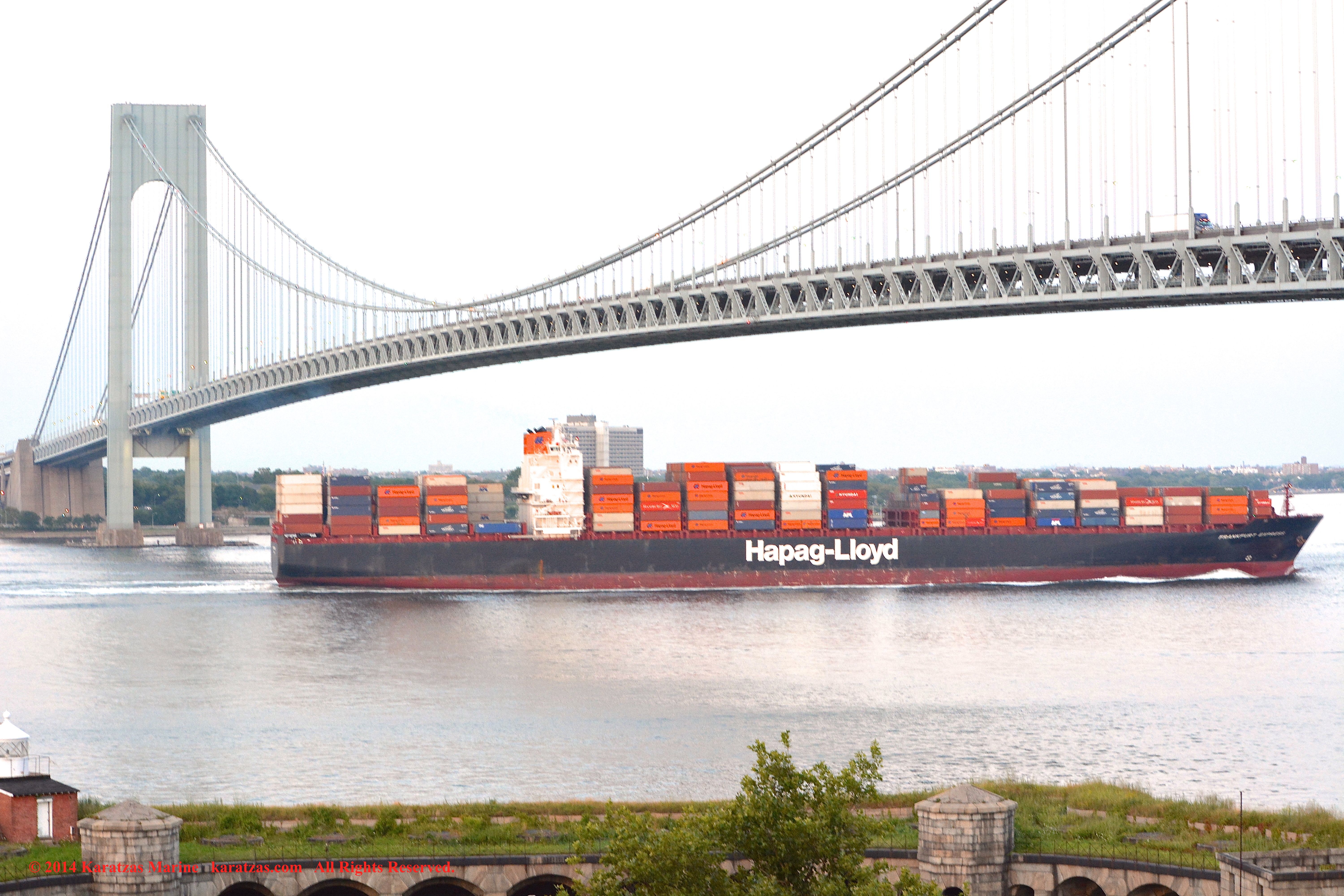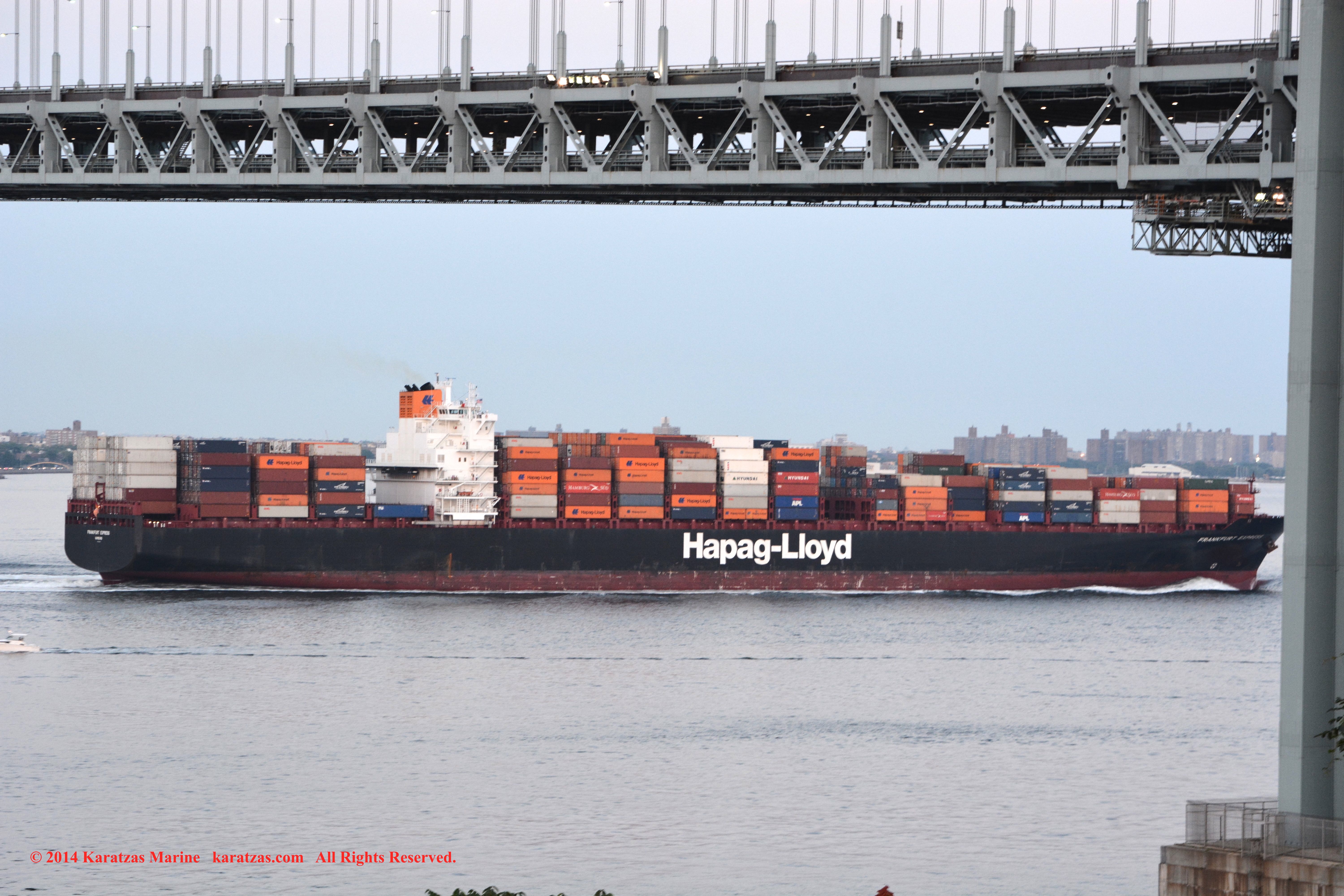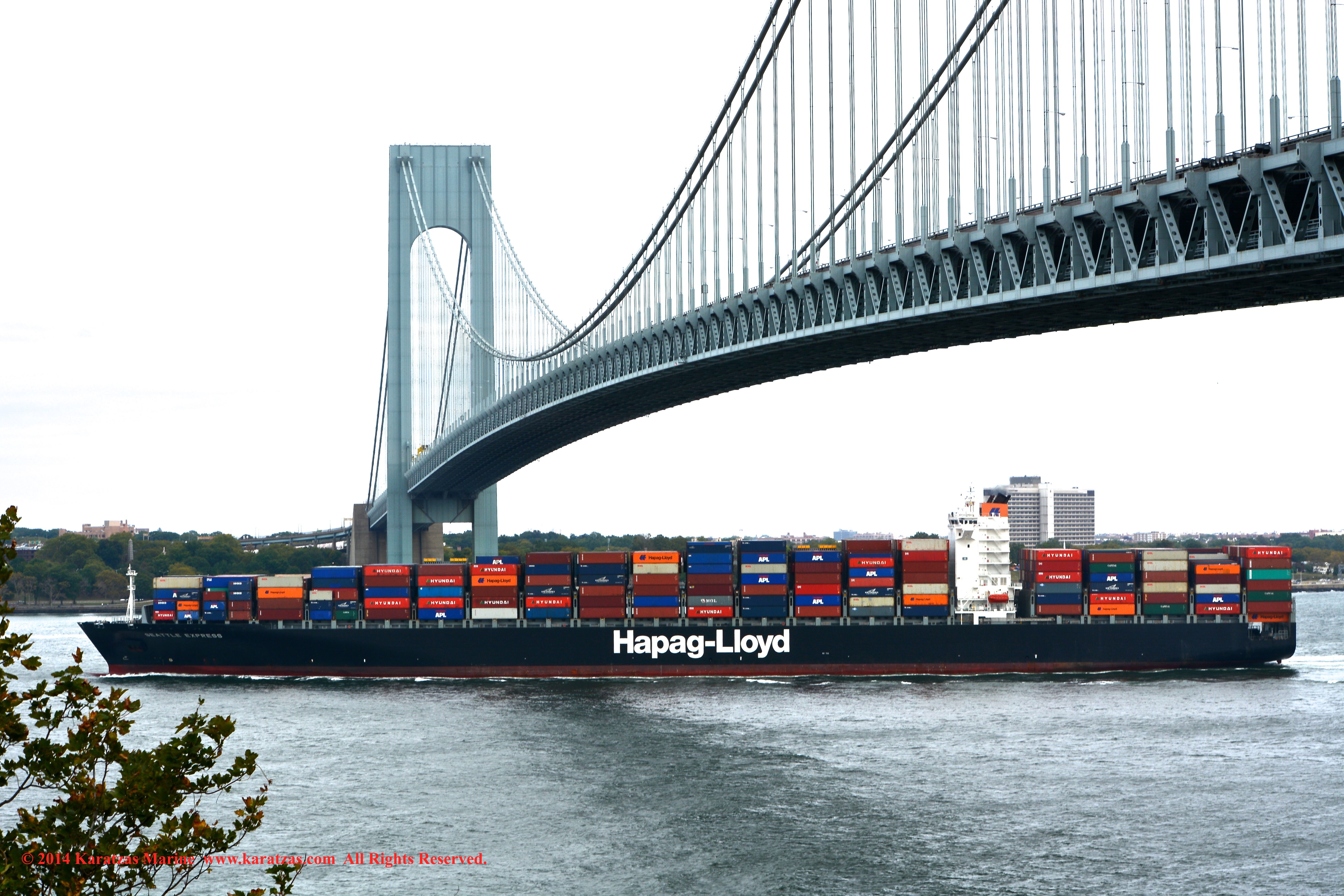 Hapag-Lloyd’s neopanamax containership MV ‘Essen Express’ (13,250-teu built at HHI in 2013) departing New York Harbor; seen here under the Verrazano-Narrows Bridge; suezmax tanker MT ‘Pecos’ inbound; notice the starboard-to-starboard pass. Image credit: Karatzas Images