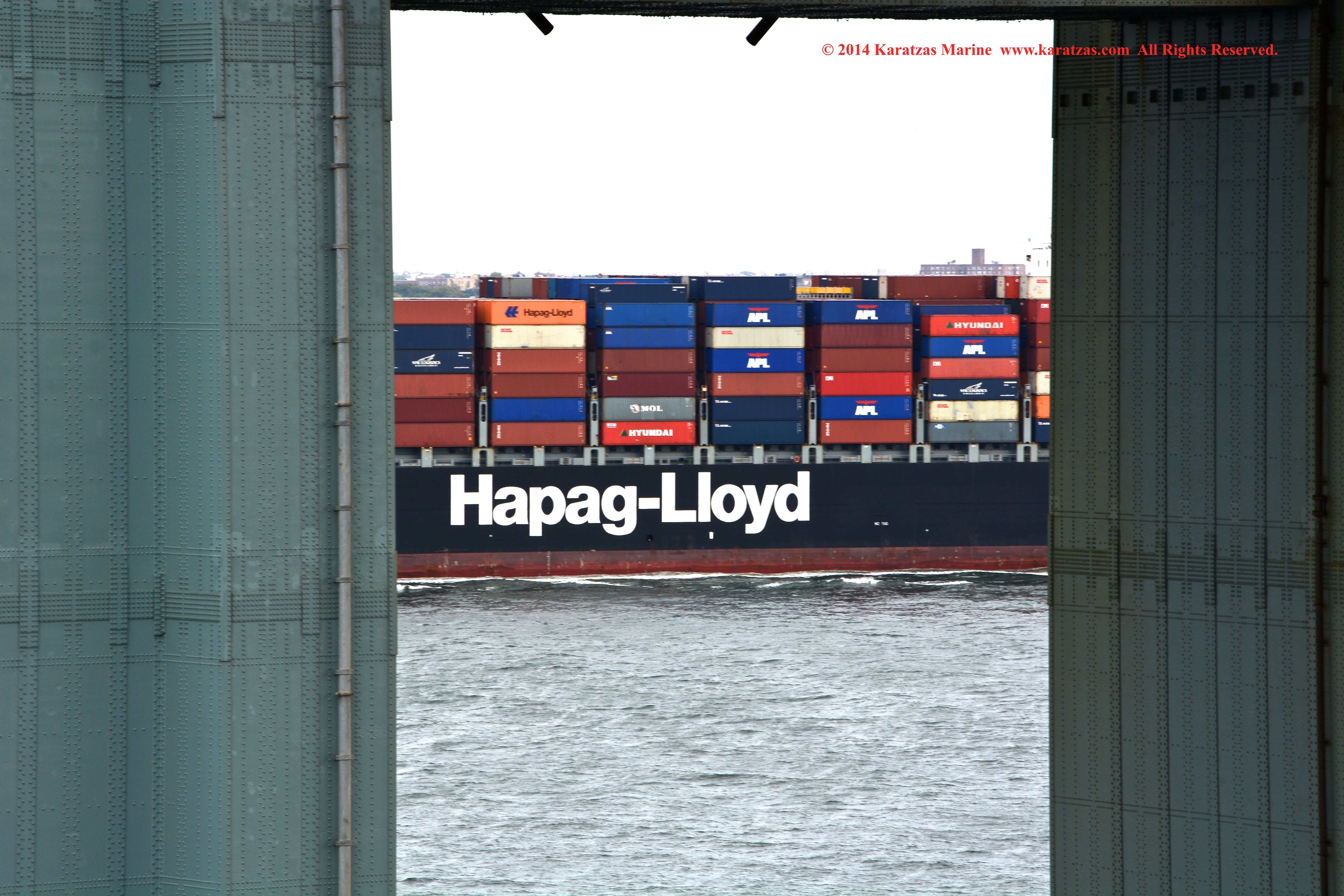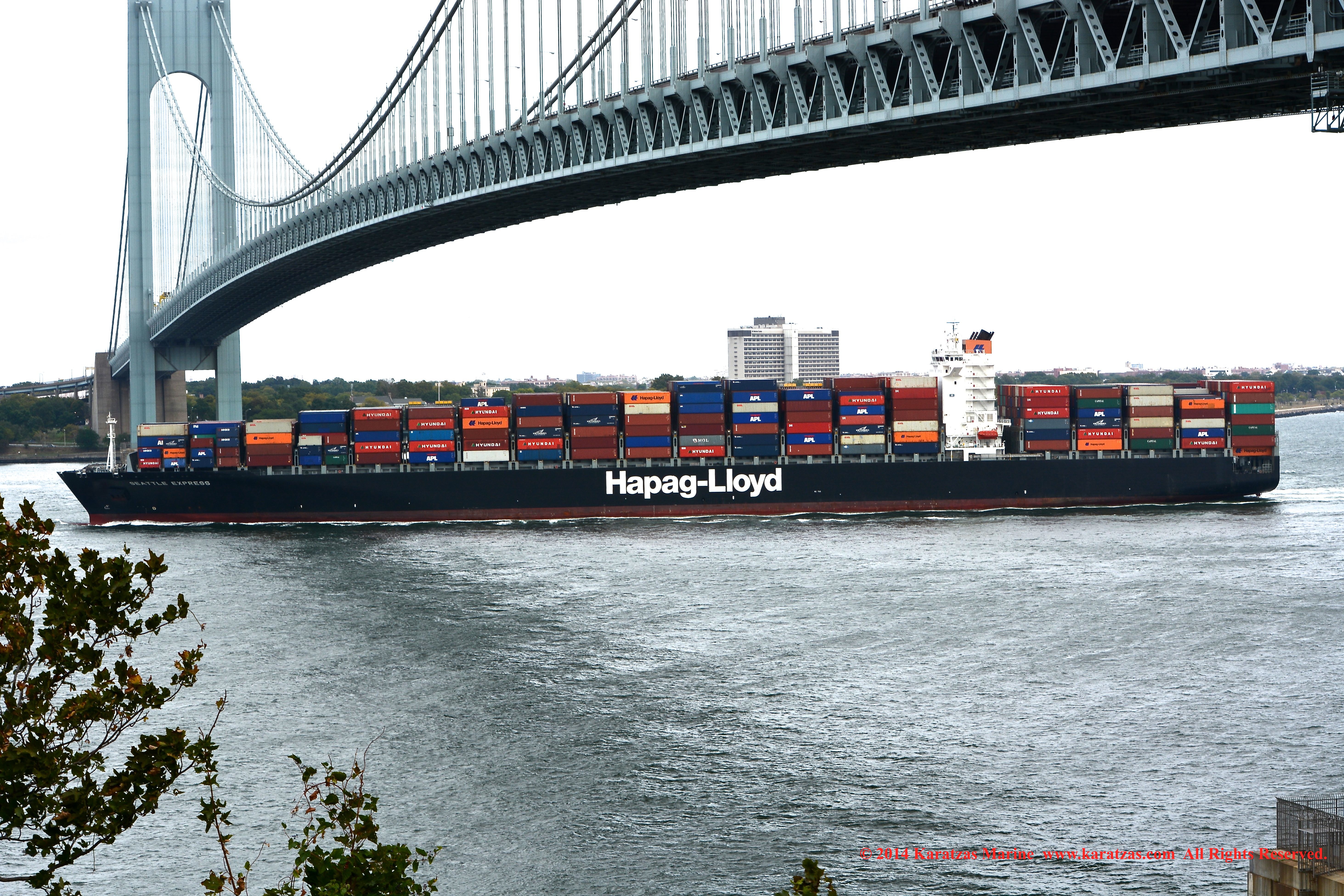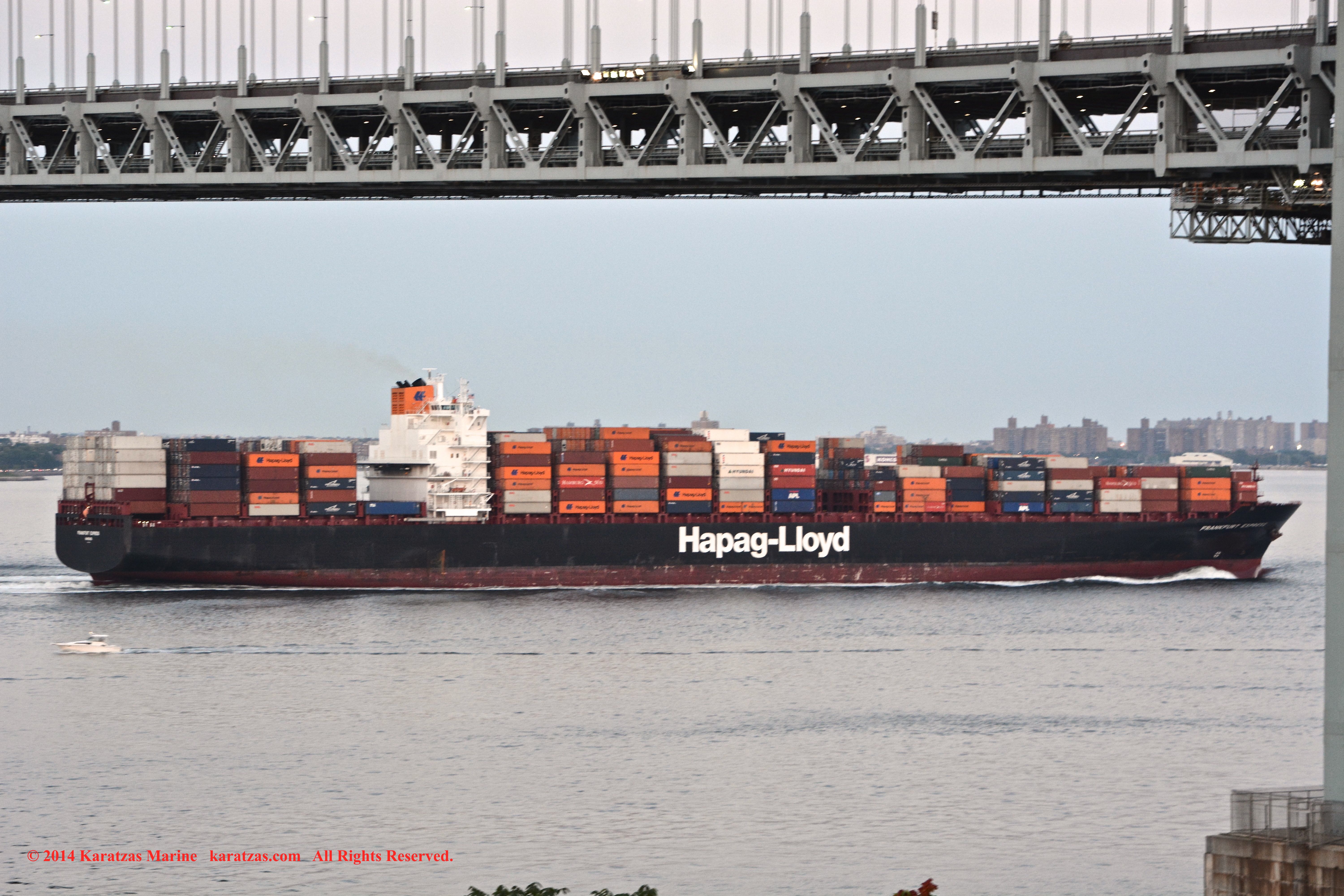 Hapag-Lloyd’s neopanamax containership MV ‘Essen Express’ (13,250-teu built at HHI in 2013) departing New York Harbor; seen here under the Verrazano-Narrows Bridge; suezmax tanker MT ‘Pecos’ inbound; notice the starboard-to-starboard pass. Image credit: Karatzas Images
