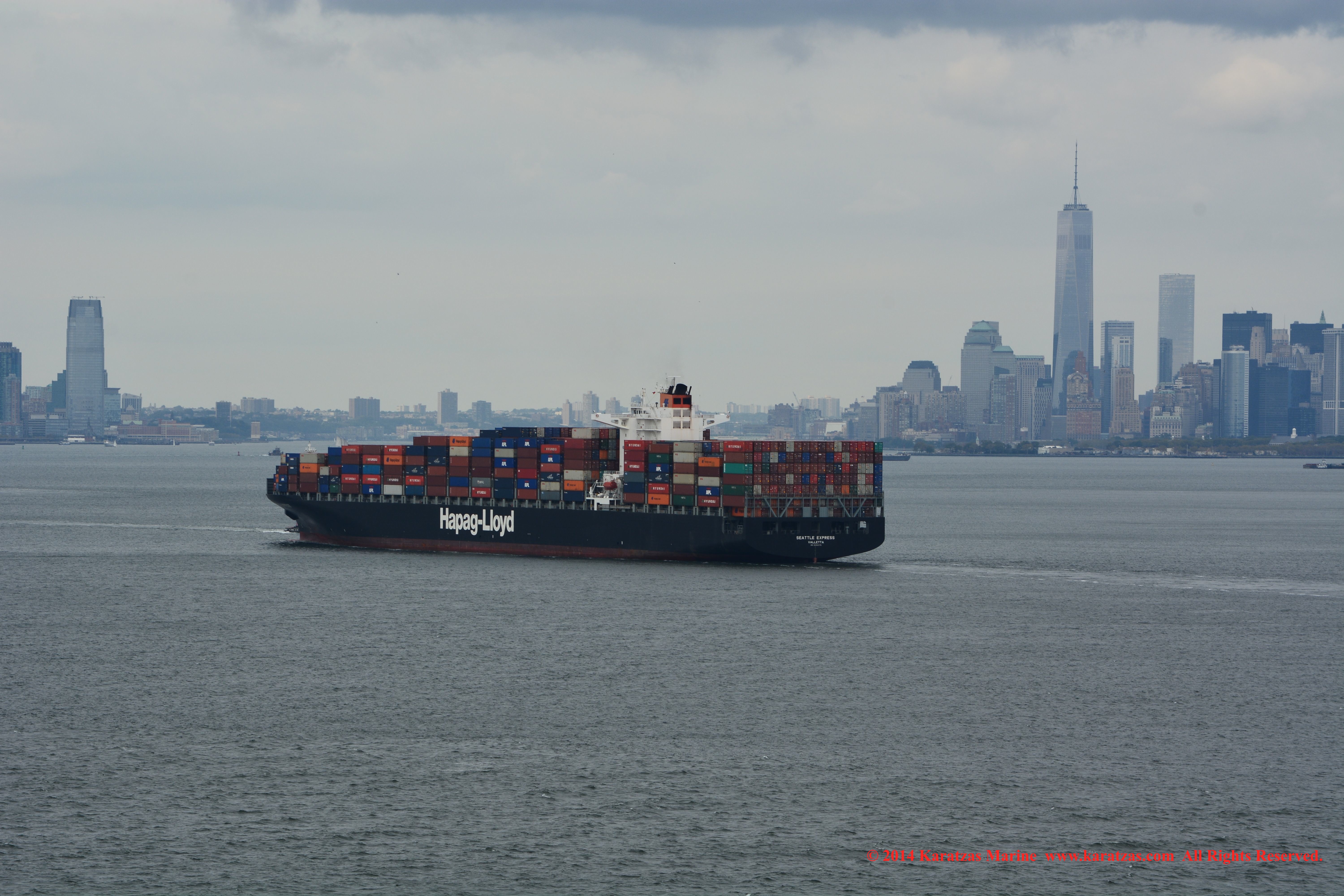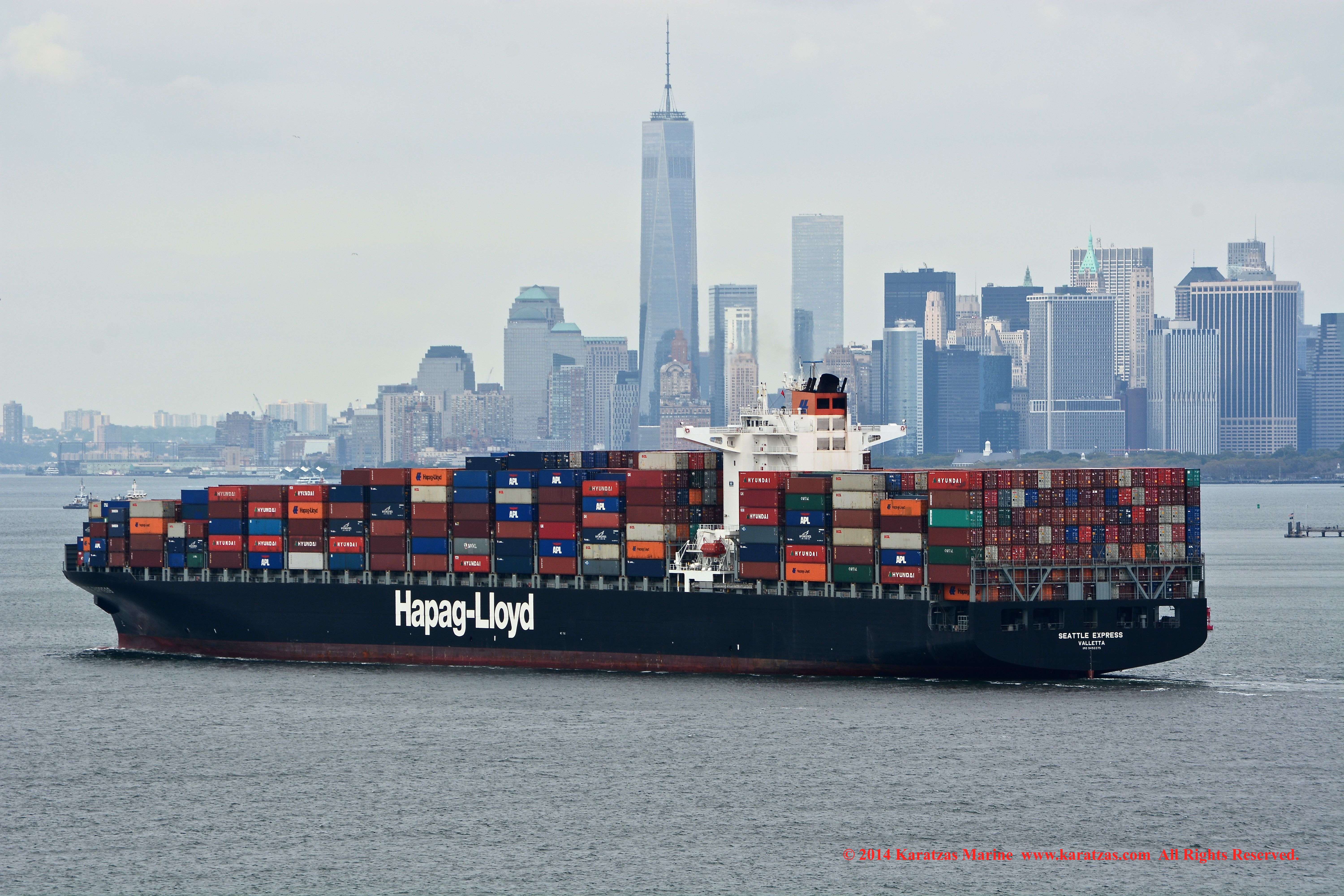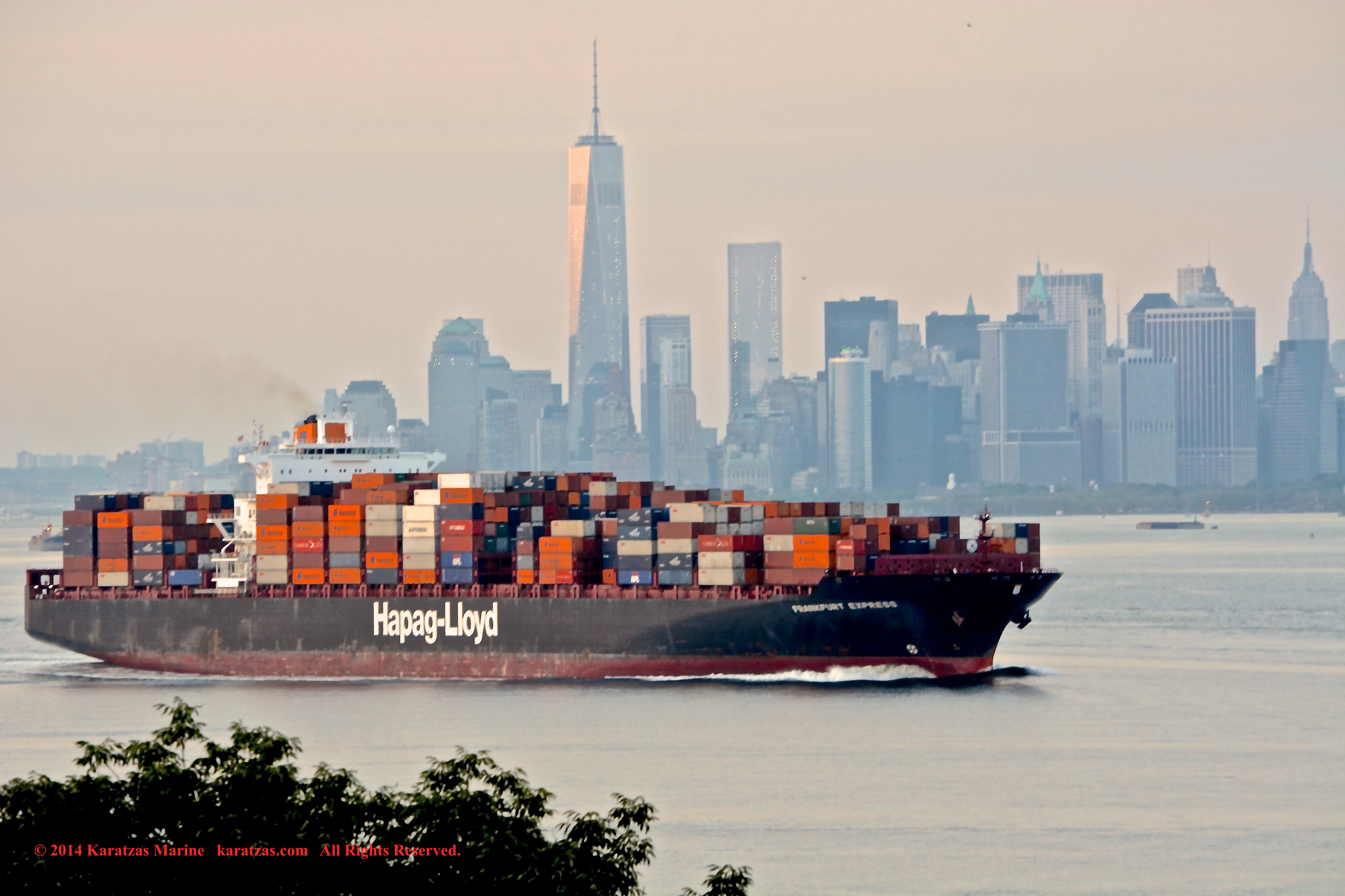 Hapag-Lloyd’s neopanamax containership MV ‘Essen Express’ (13,250-teu built at HHI in 2013) departing New York Harbor; seen here against the Lower Manhattan skyline and One World Trade Center. Image credit: Karatzas Images