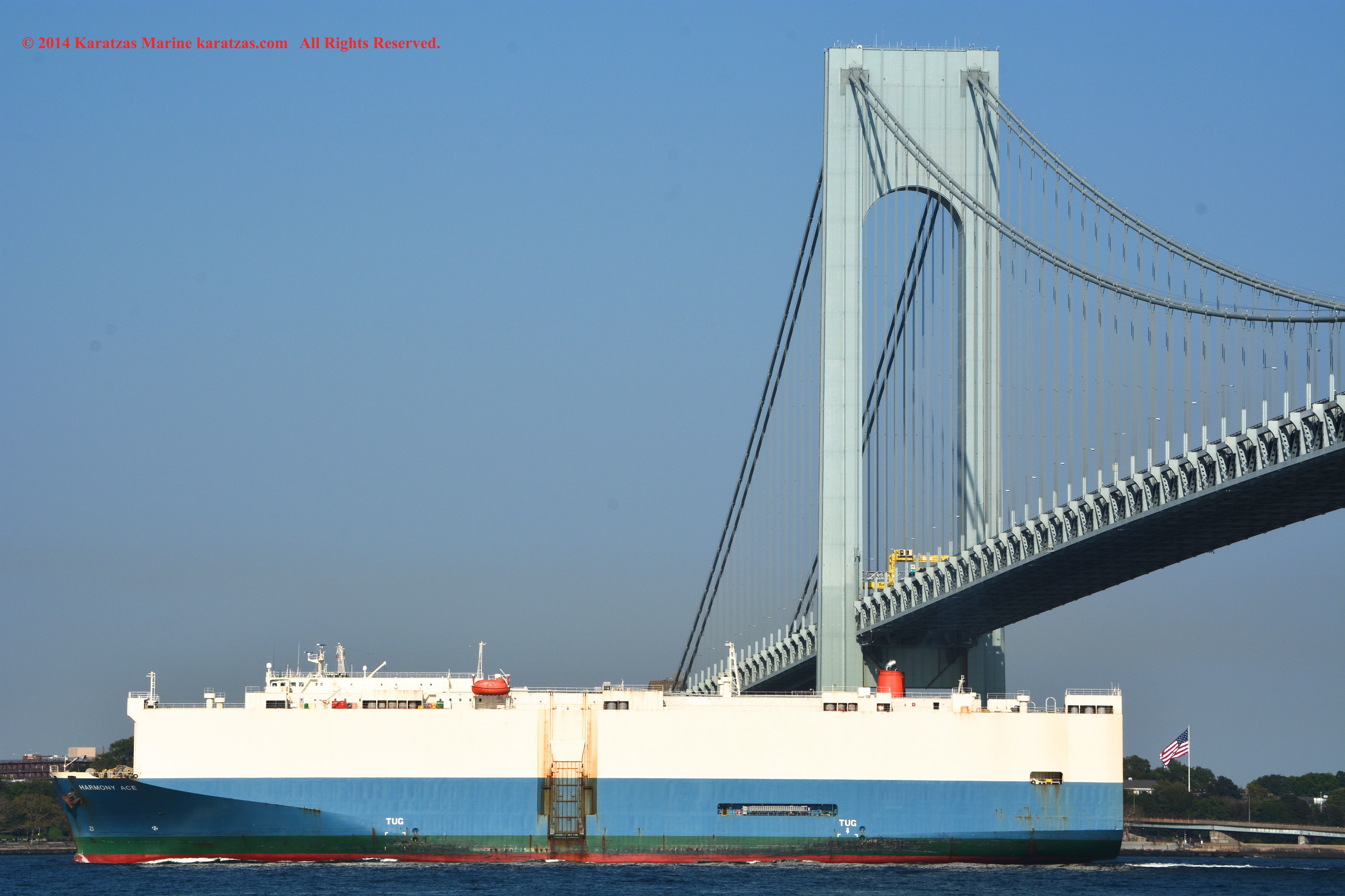 Brightly pained containership MV ‘ONE Magnificence’ (6,700 teu, built in 2010 at MHI in Kobe, Japan) arriving at GCT Bayonne Terminal in New York. Verrazzano-Narrows Bridge in the background. Image credit: Karatzas Images