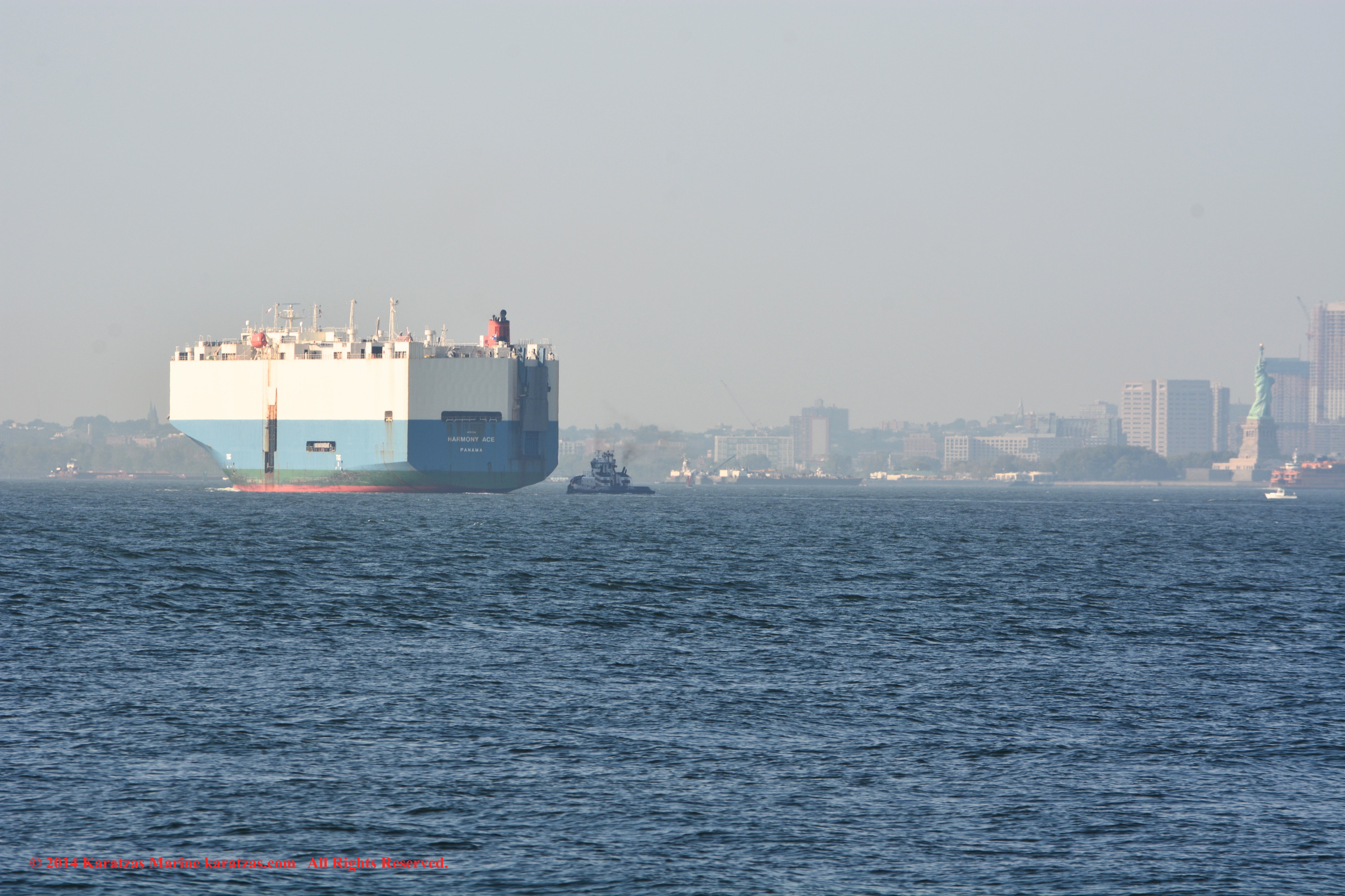 Brightly pained containership MV ‘ONE Magnificence’ (6,700 teu, built in 2010 at MHI in Kobe, Japan) arriving at GCT Bayonne Terminal in New York. Tow Moran harbor tugs (visible), orange-painted Staten Island ferry. Image credit: Karatzas Images