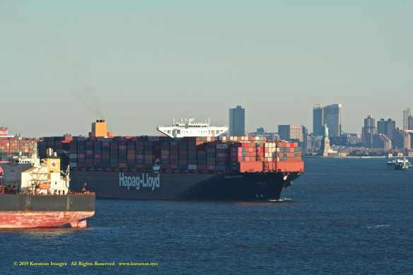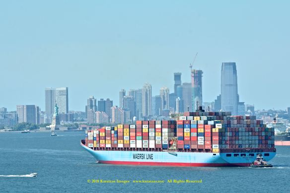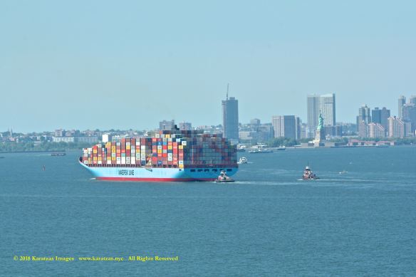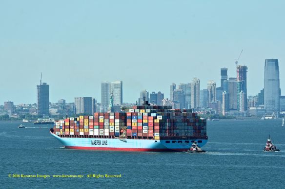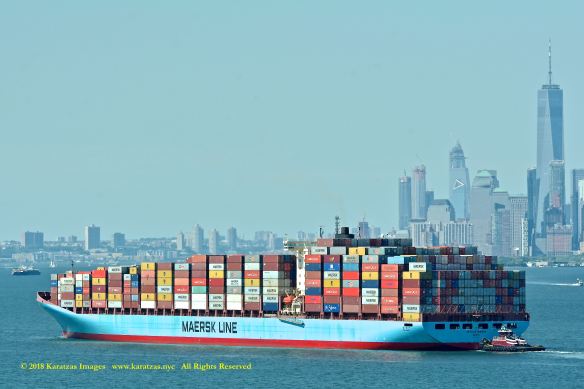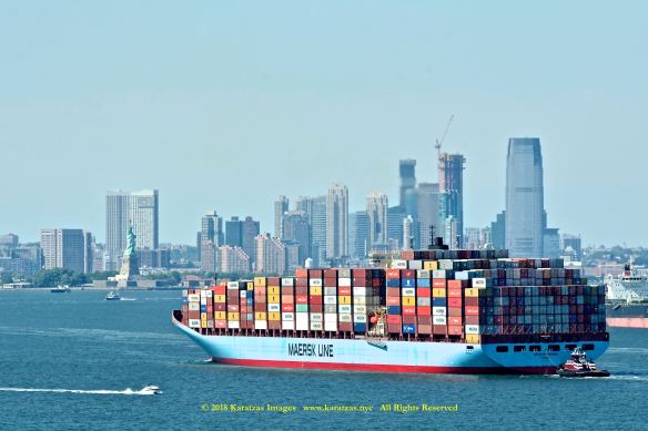 Images of neo-panamax containership MV ‘GSL Tianjin’ entering the New York Harbor; seen here against the Lower Manhattan skyline and the World Trade Center. Image credit: Karatzas Images
