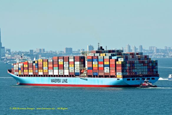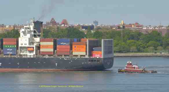 Images of neo-panamax containership MV ‘GSL Tianjin’ entering the New York Harbor; detail of the aft section and the Moran harbor tug in attendance. Image credit: Karatzas Images